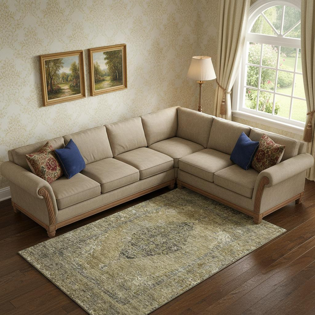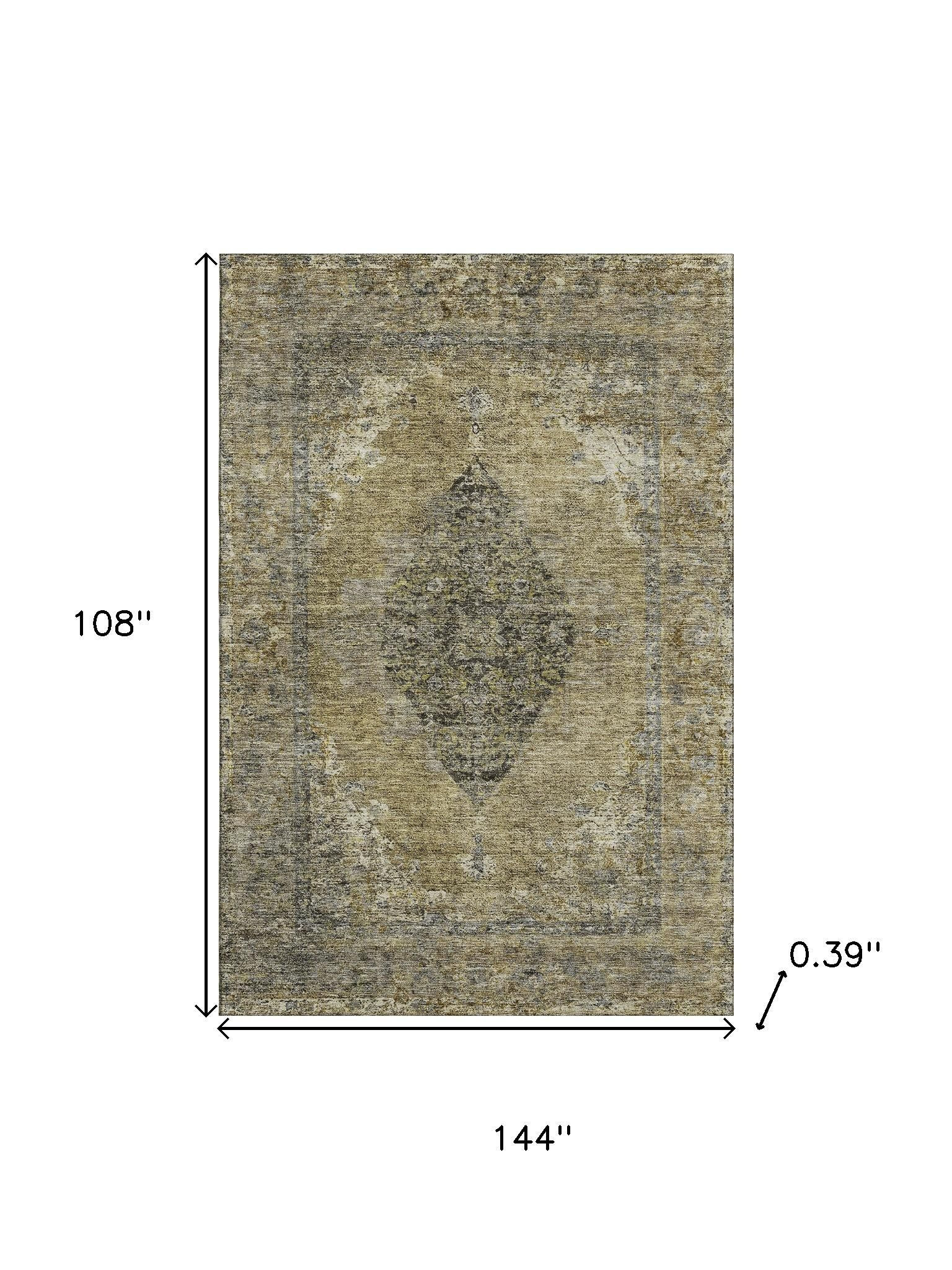 This 9-foot x 12-foot khaki and beige medallion washable area rug with uv protection, is a great way to add warmth to a room. Ideal for spaces with kids and pets, this rug is stain resistant to help repel dirt and spilled liquids. Built to last, this rug crafted from polyester fibers is known for its durability and long lasting appeal. Rugs are a great way to showcase your style, hide imperfections, warm your home and reduce noise. This larger sized, traditional styled rug is ready to create a focal point or statement piece in your room. 108.00-inch h x 144.00-inch w x 0.39-inch d.