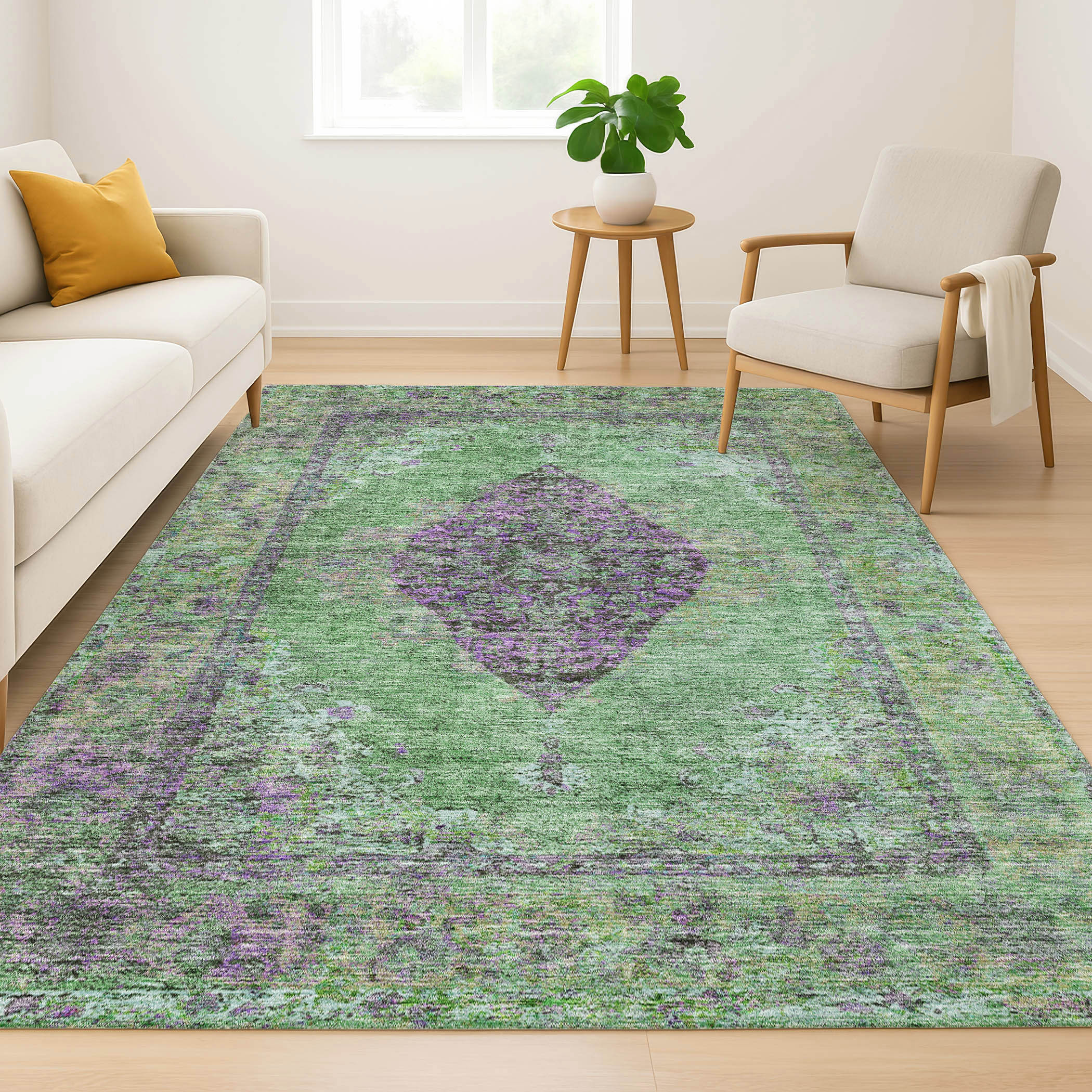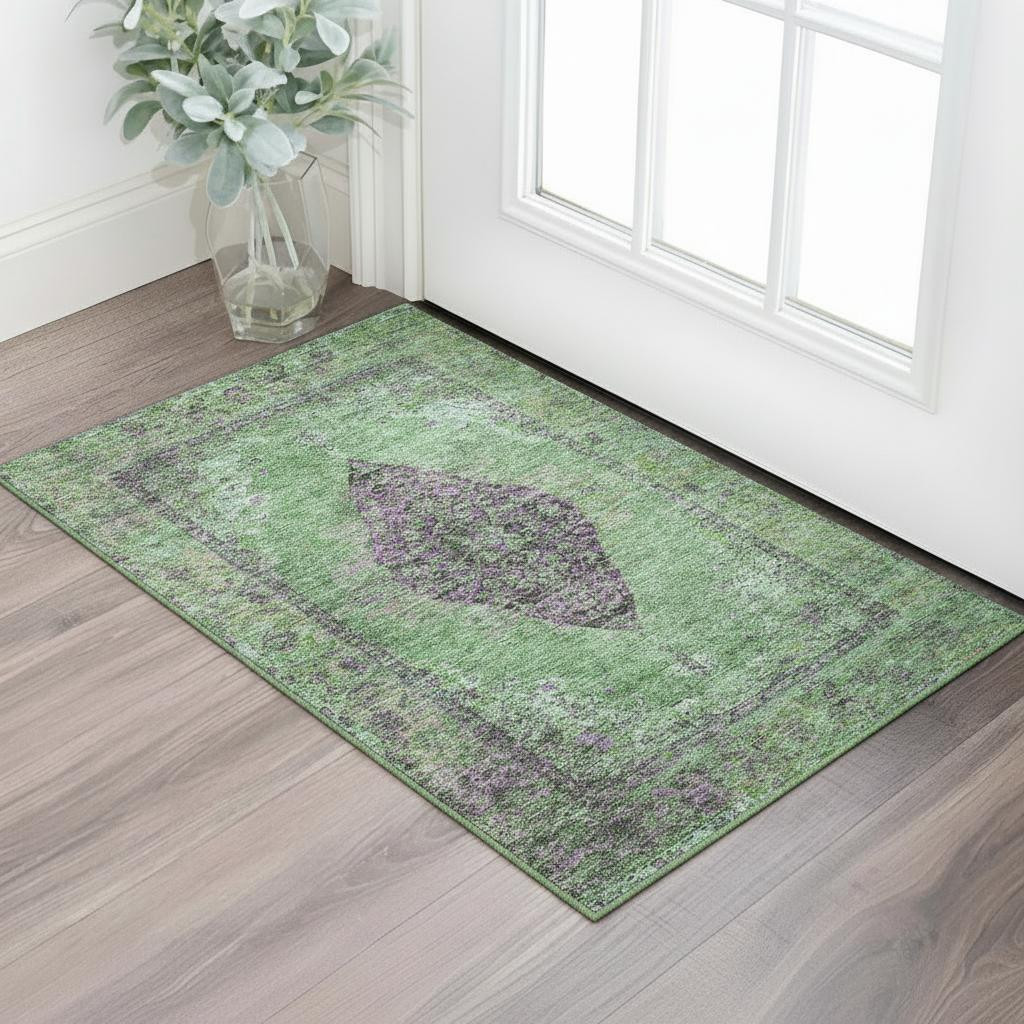 Add great coloration and comfortable texture to your space with this 3-foot x 5-foot lime green and purple medallion washable area rug with uv protection. Ideal for spaces with kids and pets, this rug is stain resistant to help repel dirt and spilled liquids. Built to last, this rug crafted from polyester fibers is known for its durability and long lasting appeal. Rugs are a great way to showcase your style, hide imperfections, warm your home and reduce noise. This smaller sized, traditional styled rug is just what you need for your walkway, bedside, in front of door, cabinet, refrigerator, or chair. 36.00-inch h x 60.00-inch w x 0.39-inch d.