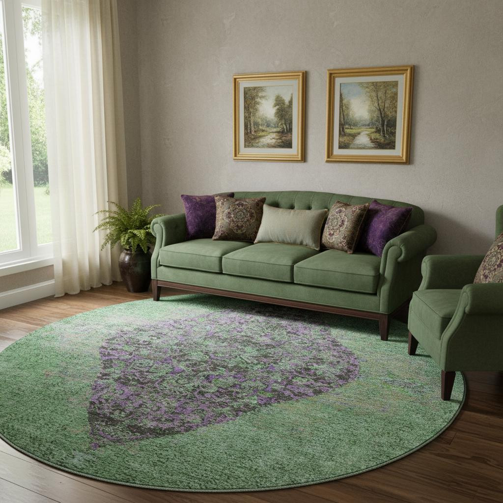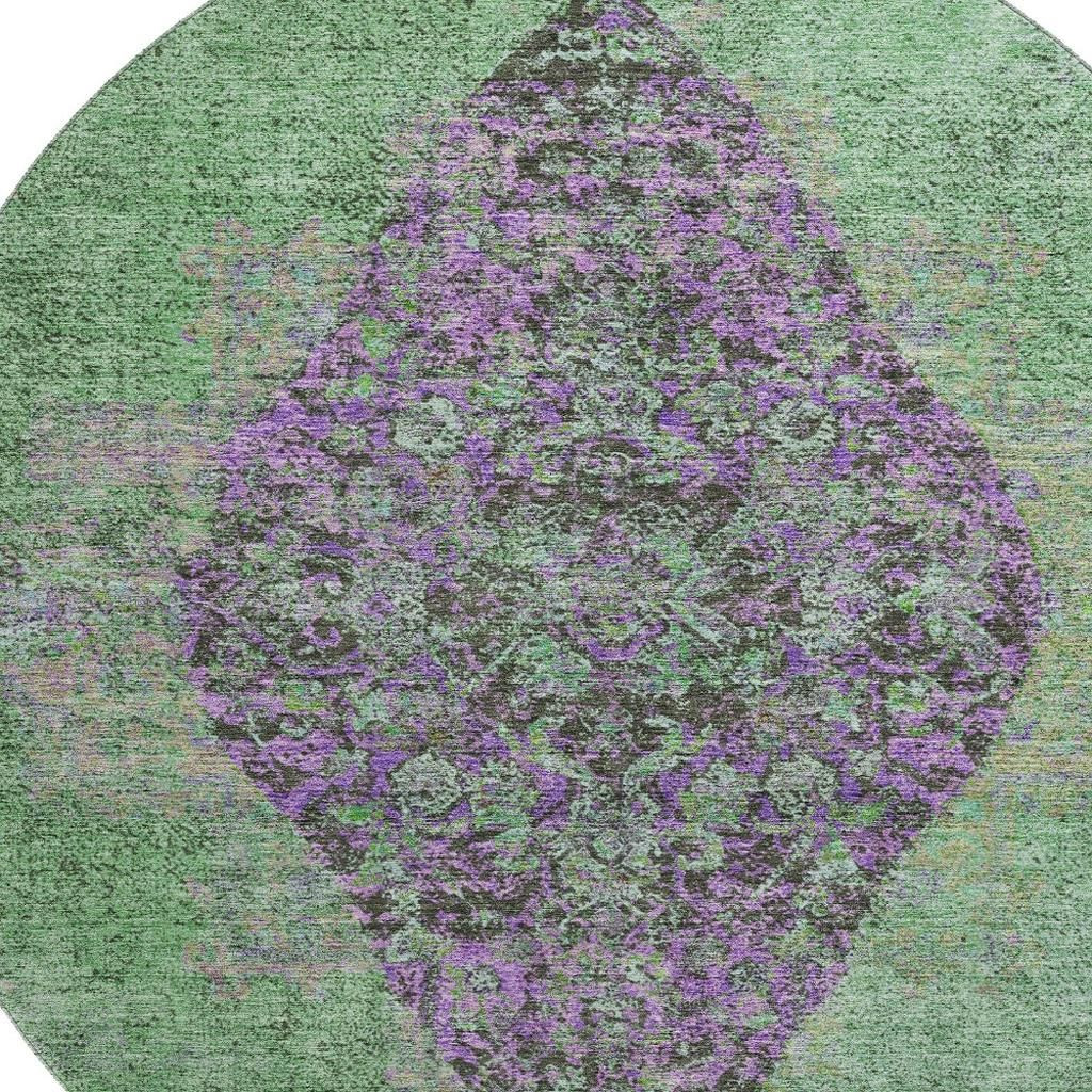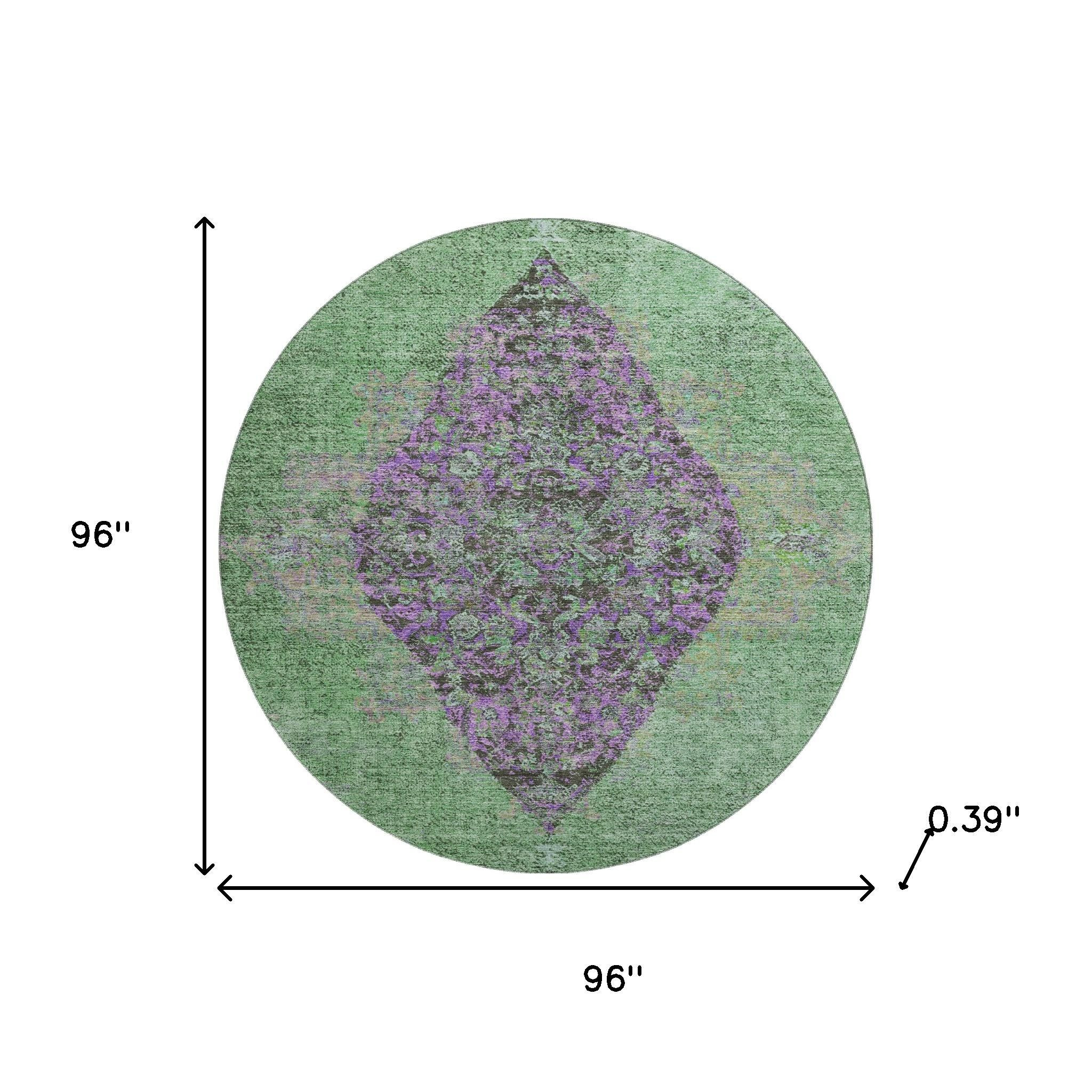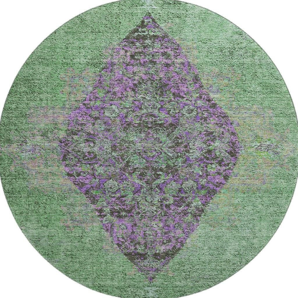 Set an inviting tone in your space with this 8-foot lime green and purple medallion washable round rug with uv protection. Ideal for spaces with kids and pets, this rug is stain resistant to help repel dirt and spilled liquids. Built to last, this rug crafted from polyester fibers is known for its durability and long lasting appeal. Rugs are a great way to showcase your style, hide imperfections, warm your home and reduce noise. This larger sized, traditional styled rug is ready to create a focal point or statement piece in your room. 96.00-inch h x 96.00-inch w x 0.39-inch d.