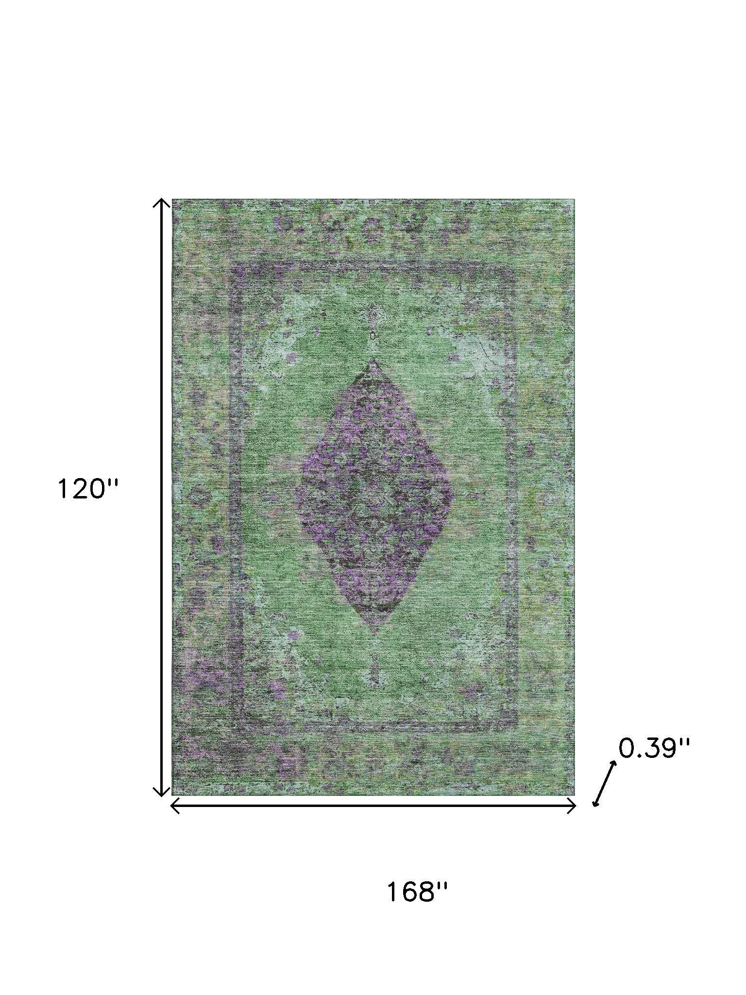 Add great coloration and comfortable texture to your space with this 10-foot x 14-foot lime green and purple medallion washable area rug with uv protection. Ideal for spaces with kids and pets, this rug is stain resistant to help repel dirt and spilled liquids. Built to last, this rug crafted from polyester fibers is known for its durability and long lasting appeal. Rugs are a great way to showcase your style, hide imperfections, warm your home and reduce noise. This larger sized, traditional styled rug is ready to create a focal point or statement piece in your room. 120.00-inch h x 168.00-inch w x 0.39-inch d.