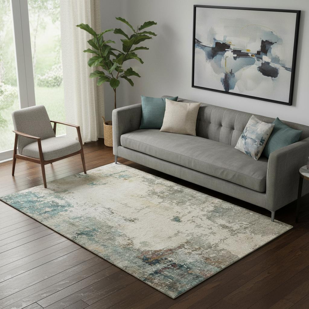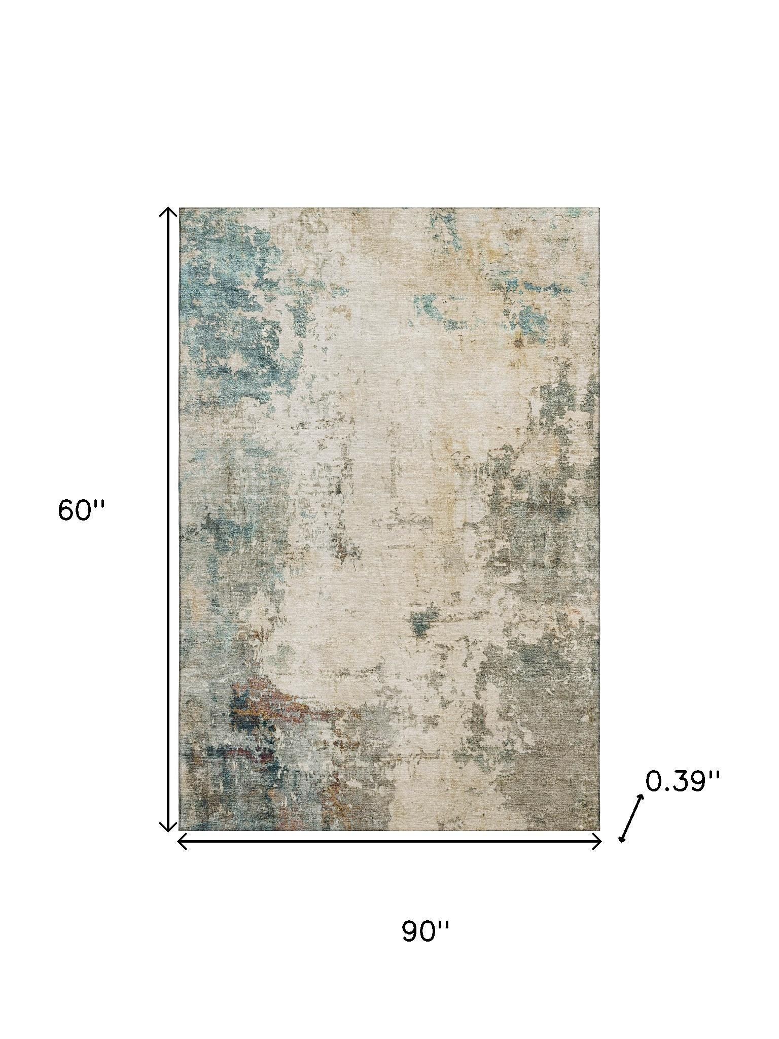 Add some artistry to your room with this 5-foot x 8-foot ivory and teal abstract washable area rug with uv protection. Ideal for spaces with kids and pets, this rug is stain resistant to help repel dirt and spilled liquids. Built to last, this rug crafted from polyester fibers is known for its durability and long lasting appeal. Rugs are a great way to showcase your style, hide imperfections, warm your home and reduce noise. This larger sized, transitional styled rug is ready to create a focal point or statement piece in your room. 60.00-inch h x 90.00-inch w x 0.39-inch d.