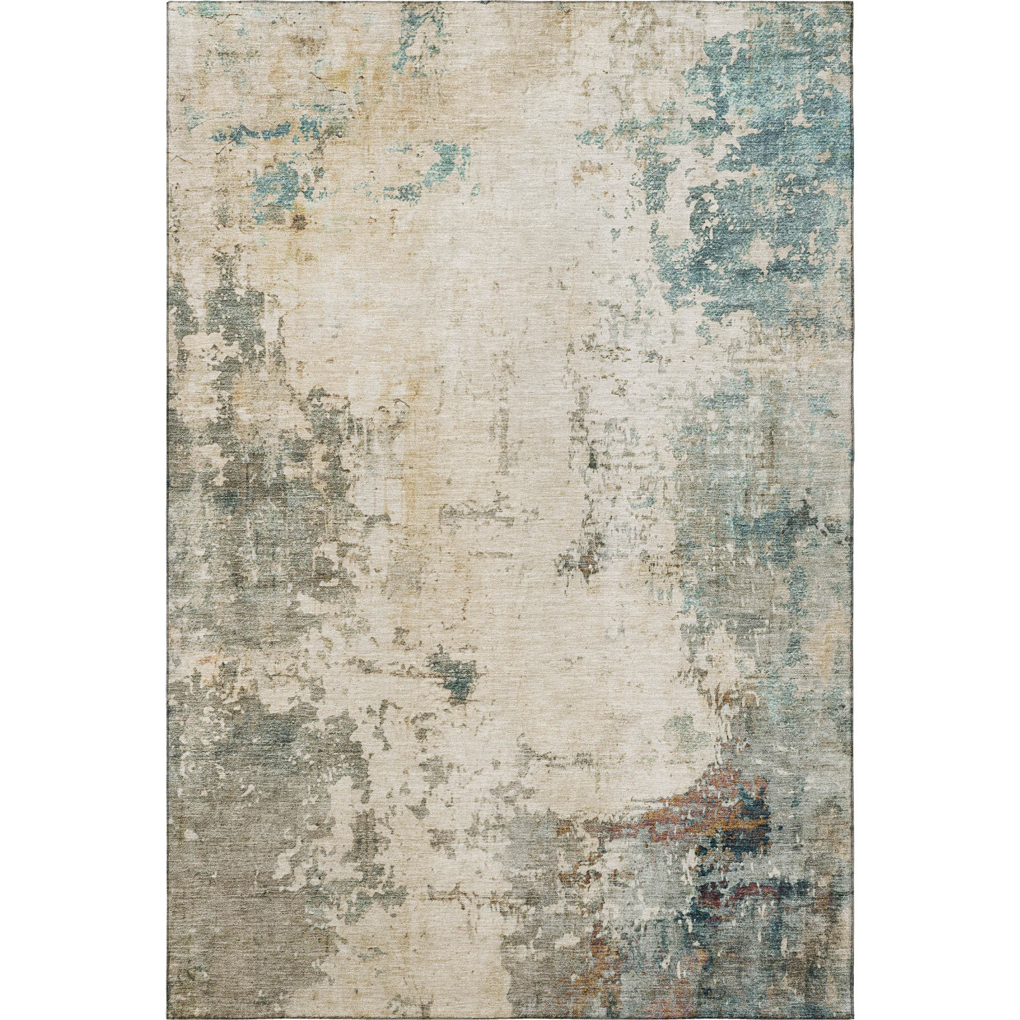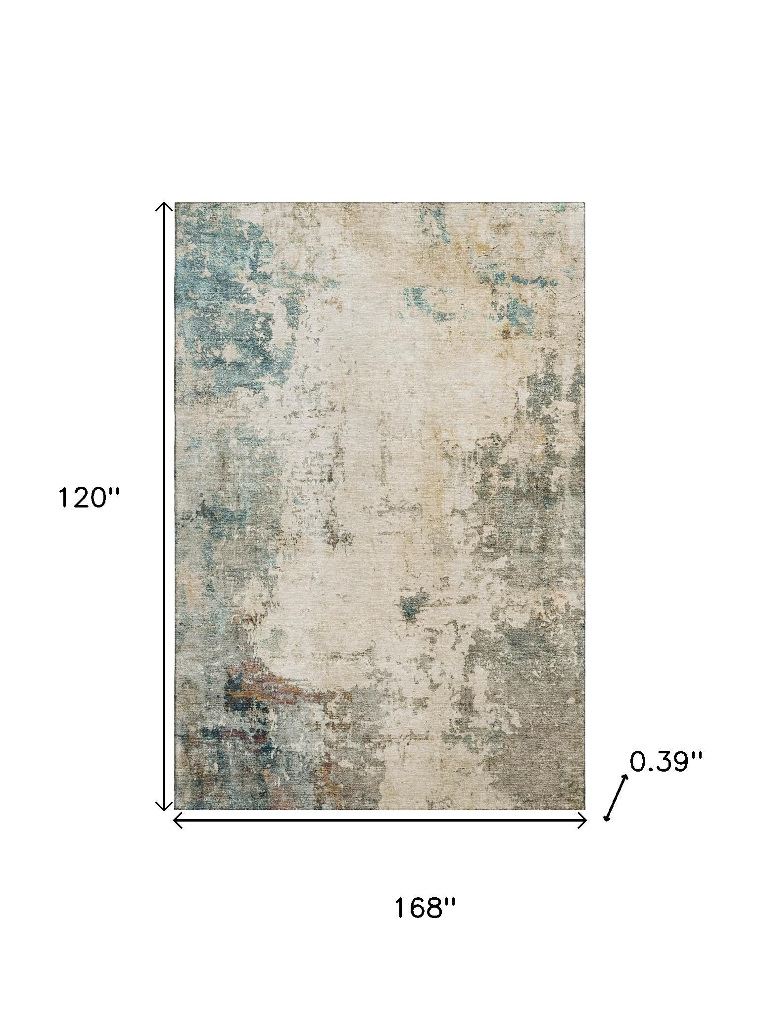 Add some artistry to your room with this 10-foot x 14-foot ivory and teal abstract washable area rug with uv protection. Ideal for spaces with kids and pets, this rug is stain resistant to help repel dirt and spilled liquids. Built to last, this rug crafted from polyester fibers is known for its durability and long lasting appeal. Rugs are a great way to showcase your style, hide imperfections, warm your home and reduce noise. This larger sized, transitional styled rug is ready to create a focal point or statement piece in your room. 120.00-inch h x 168.00-inch w x 0.39-inch d.