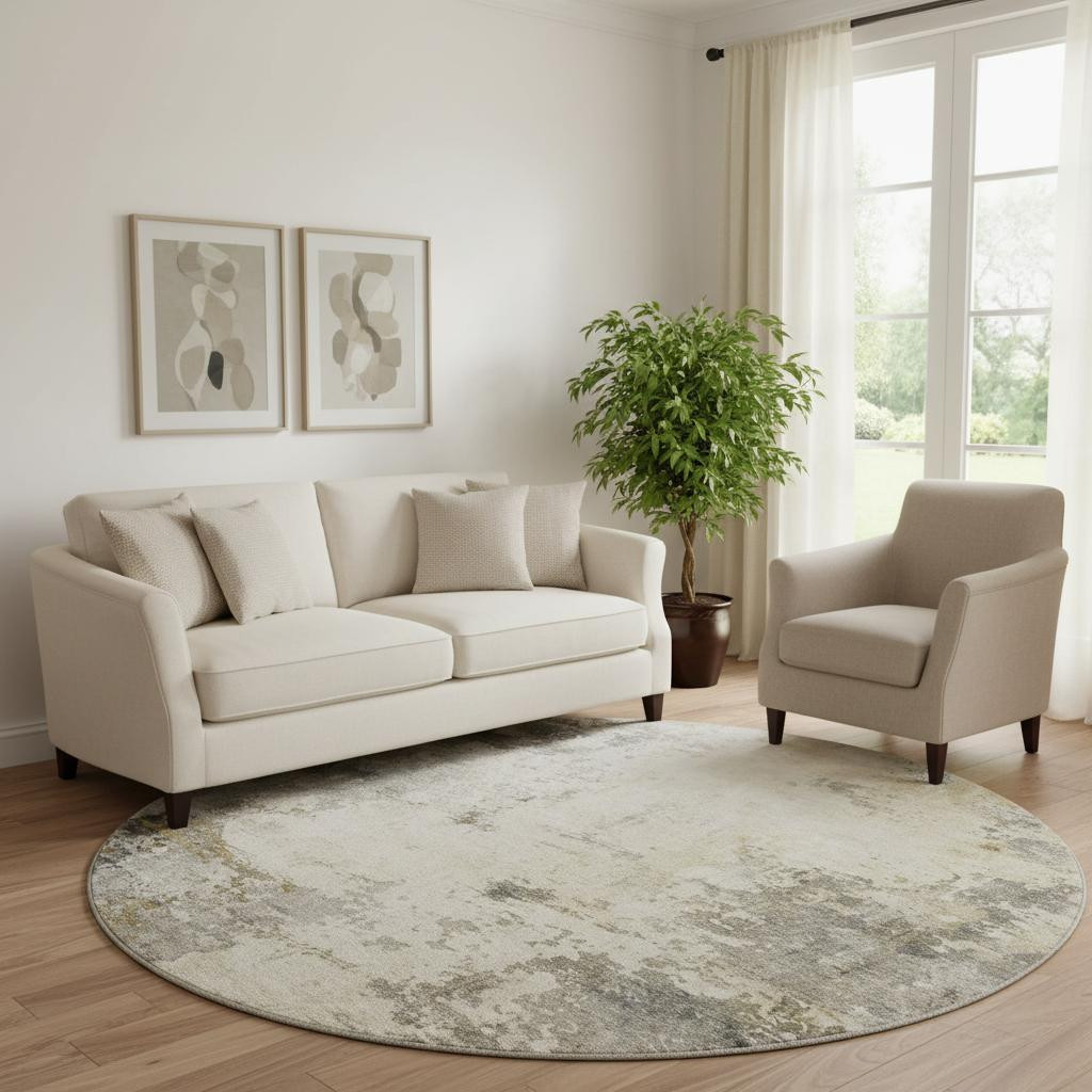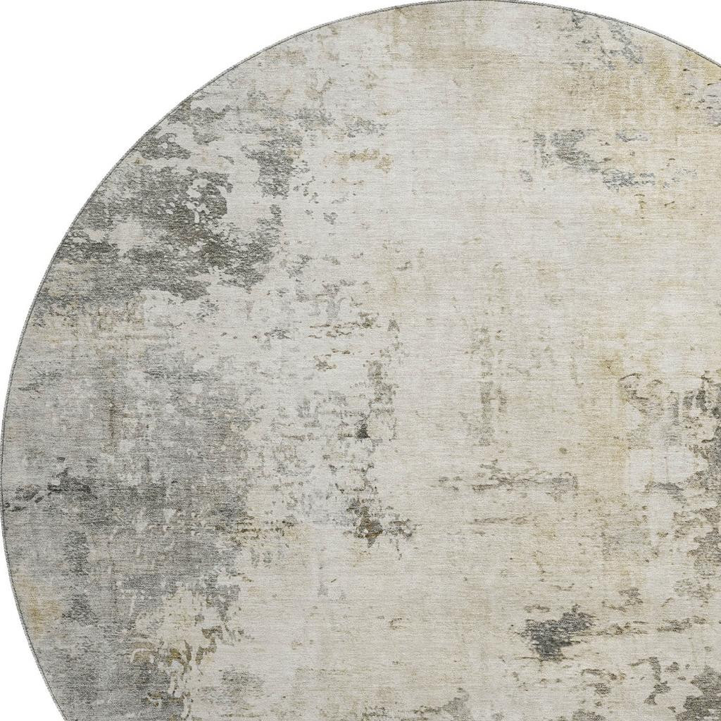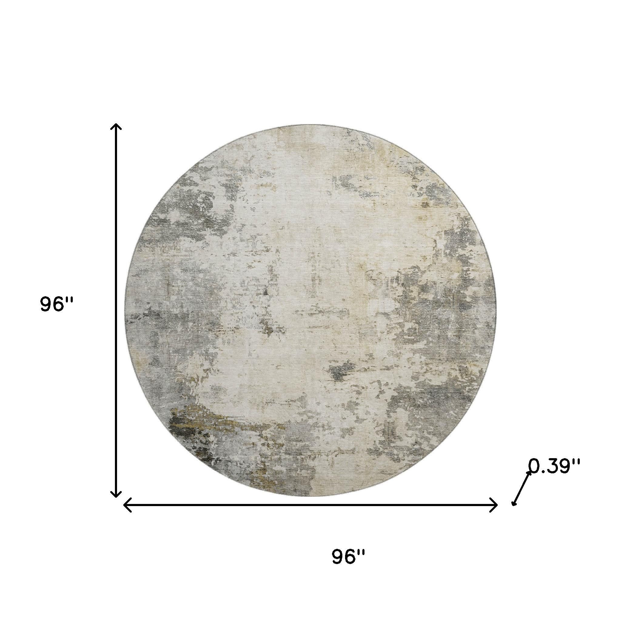 Add some artistry to your room with this 8-foot pewter and ivory abstract washable round rug with uv protection. Ideal for spaces with kids and pets, this rug is stain resistant to help repel dirt and spilled liquids. Built to last, this rug crafted from polyester fibers is known for its durability and long lasting appeal. Rugs are a great way to showcase your style, hide imperfections, warm your home and reduce noise. This larger sized, transitional styled rug is ready to create a focal point or statement piece in your room. 96.00-inch h x 96.00-inch w x 0.39-inch d.