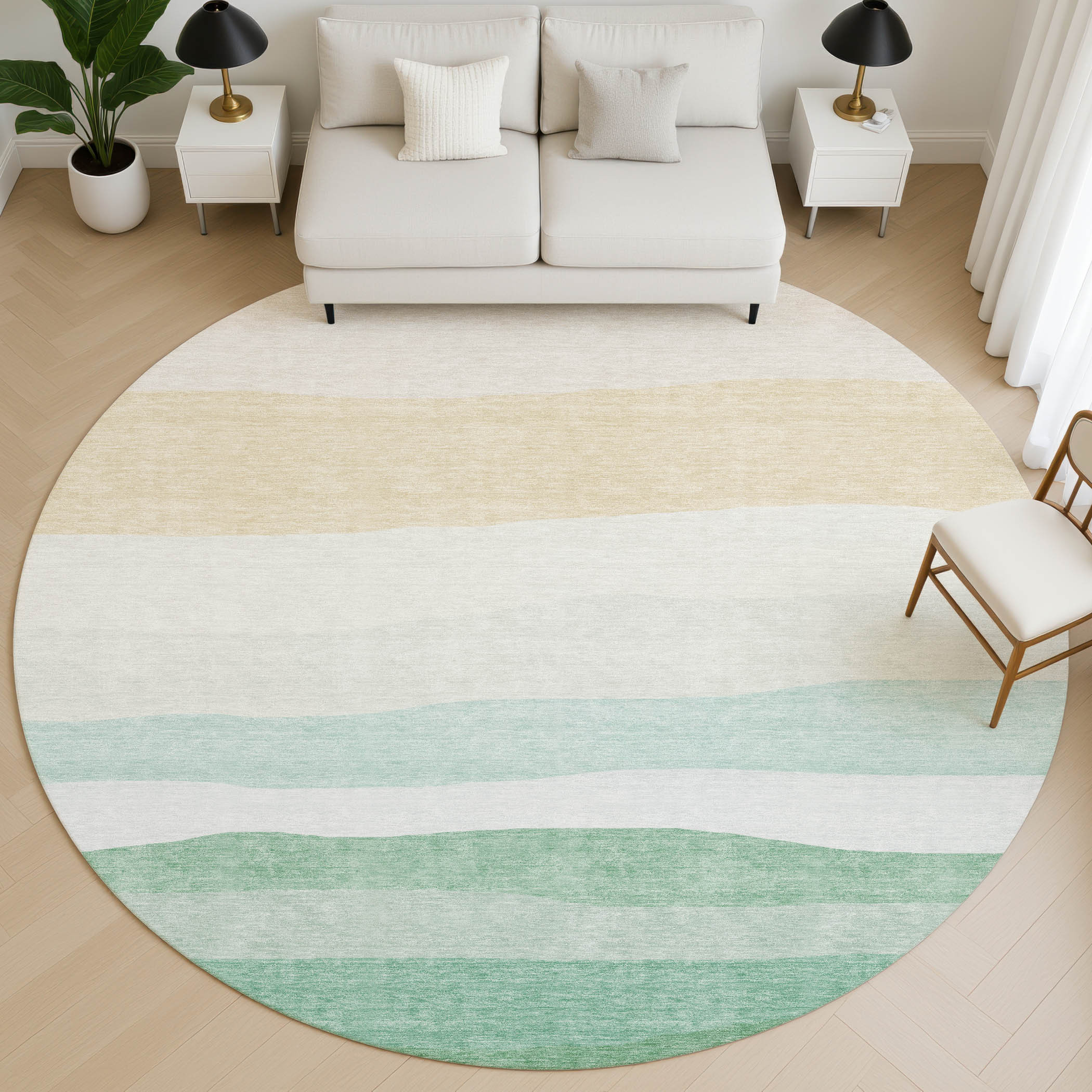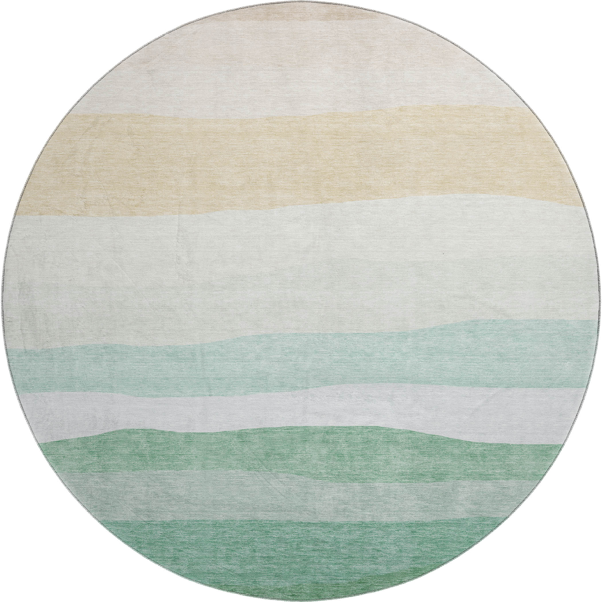 Set an inviting tone in your space with this 8-foot teal and green striped washable round rug with uv protection. Ideal for spaces with kids and pets, this rug is stain resistant to help repel dirt and spilled liquids. Built to last, this rug crafted from polyester fibers is known for its durability and long lasting appeal. Rugs are a great way to showcase your style, hide imperfections, warm your home and reduce noise. This larger sized, transitional styled rug is ready to create a focal point or statement piece in your room. 96.00-inch h x 96.00-inch w x 0.39-inch d.