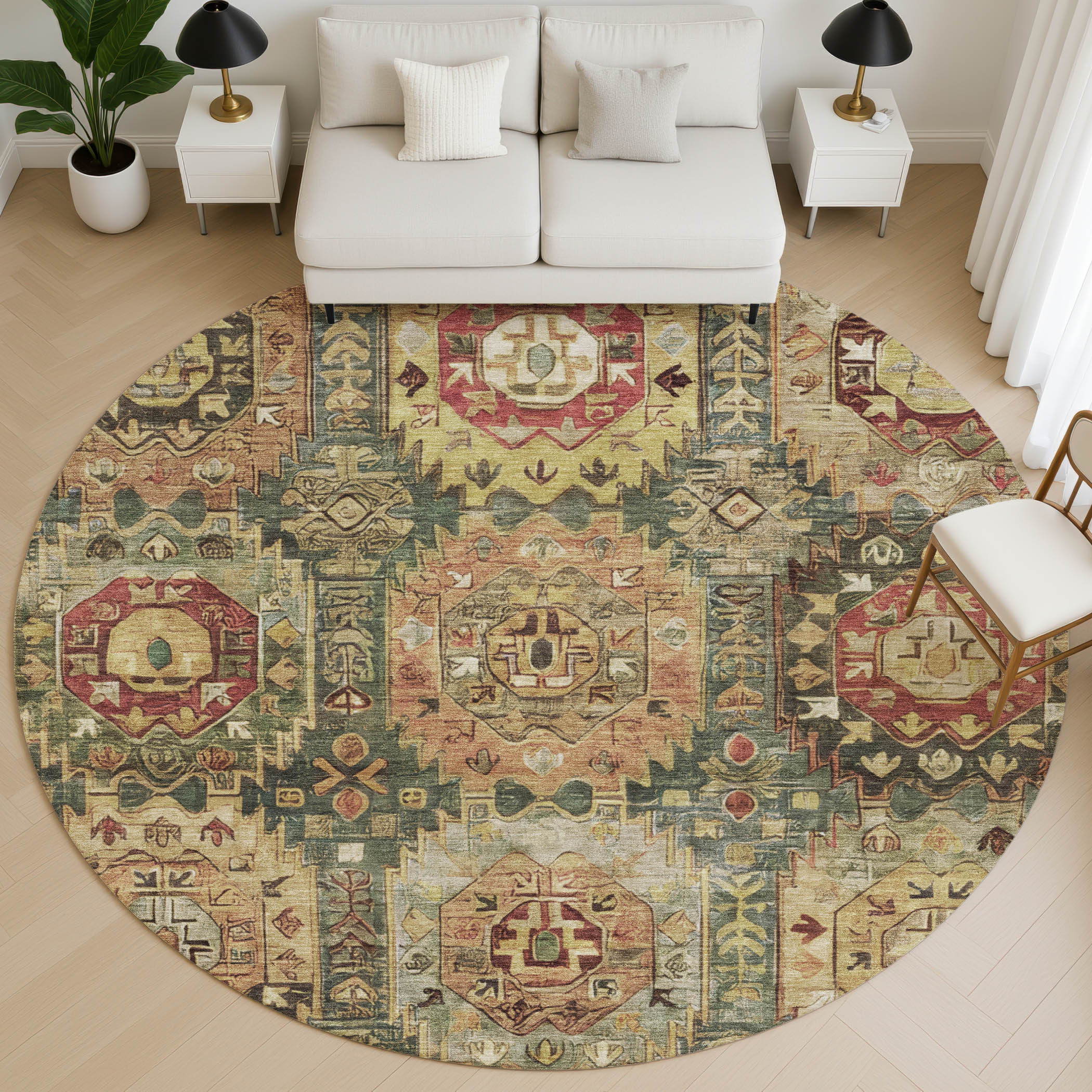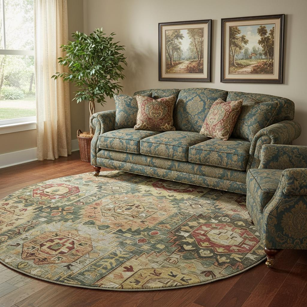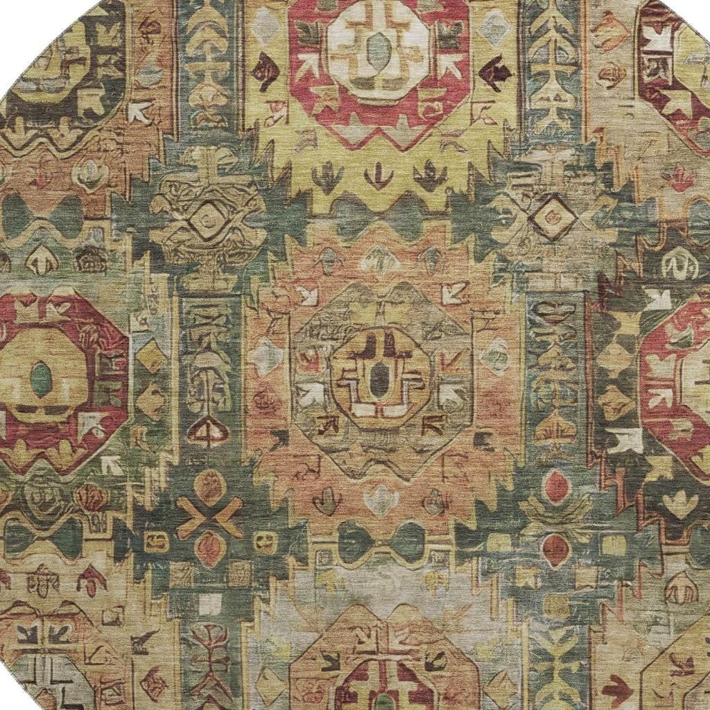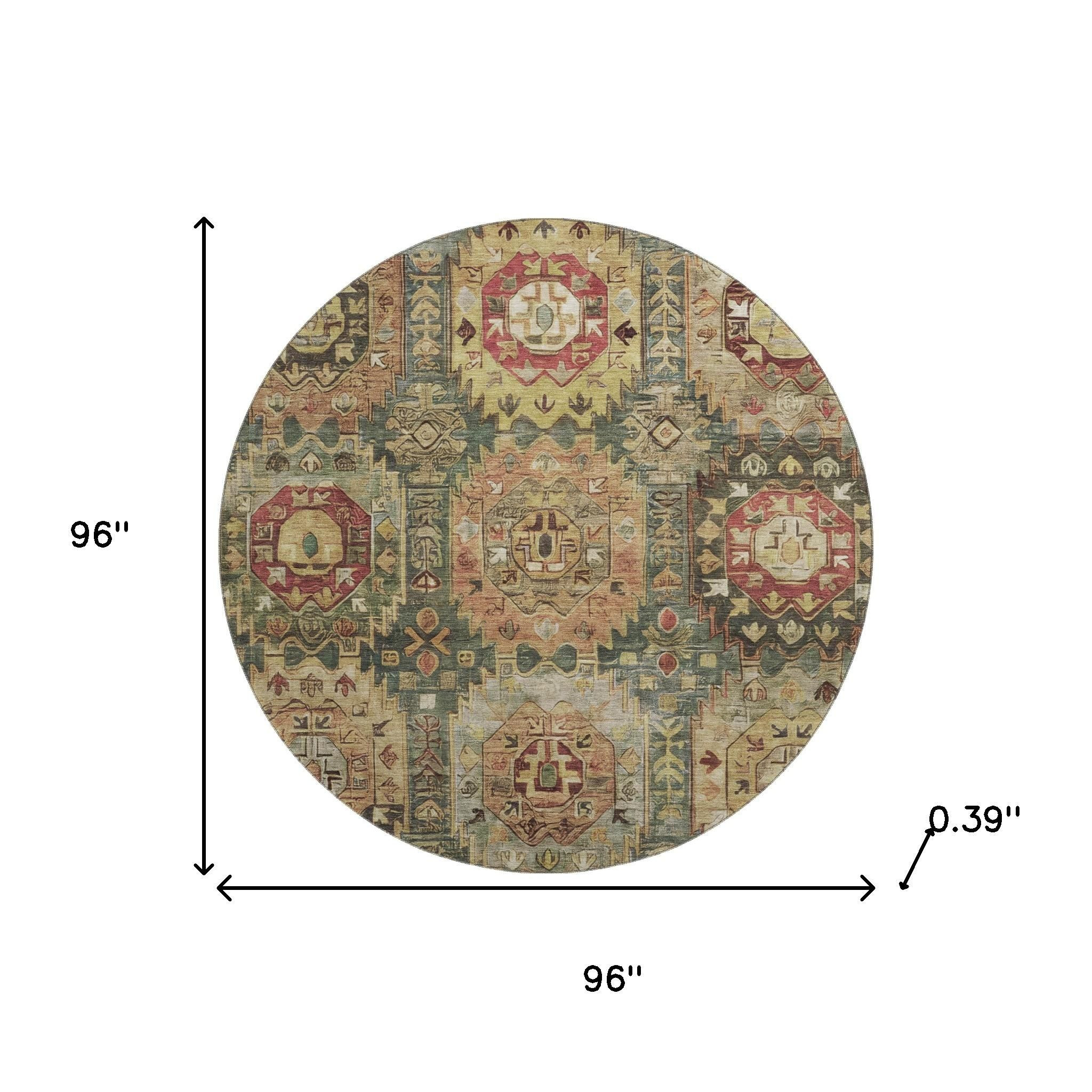 Set an inviting tone in your space with this 8-foot sage and copper medallion washable round rug with uv protection. Ideal for spaces with kids and pets, this rug is stain resistant to help repel dirt and spilled liquids. Built to last, this rug crafted from polyester fibers is known for its durability and long lasting appeal. Rugs are a great way to showcase your style, hide imperfections, warm your home and reduce noise. This larger sized, traditional styled rug is ready to create a focal point or statement piece in your room. 96.00-inch h x 96.00-inch w x 0.39-inch d.