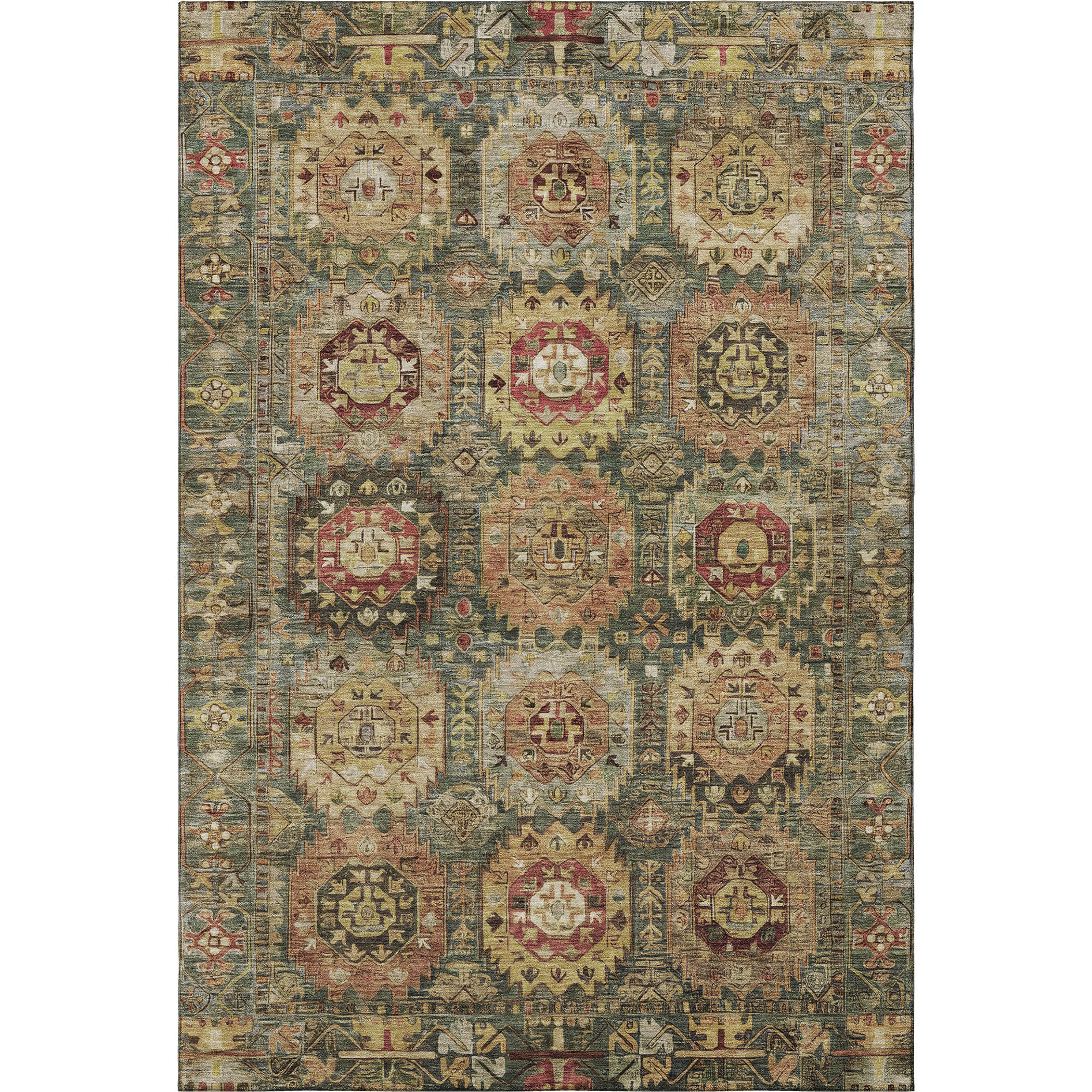 This 8-foot x 10-foot sage and copper medallion washable area rug with uv protection, is a great way to add warmth to a room. Ideal for spaces with kids and pets, this rug is stain resistant to help repel dirt and spilled liquids. Built to last, this rug crafted from polyester fibers is known for its durability and long lasting appeal. Rugs are a great way to showcase your style, hide imperfections, warm your home and reduce noise. This larger sized, traditional styled rug is ready to create a focal point or statement piece in your room. 96.00-inch h x 120.00-inch w x 0.39-inch d.