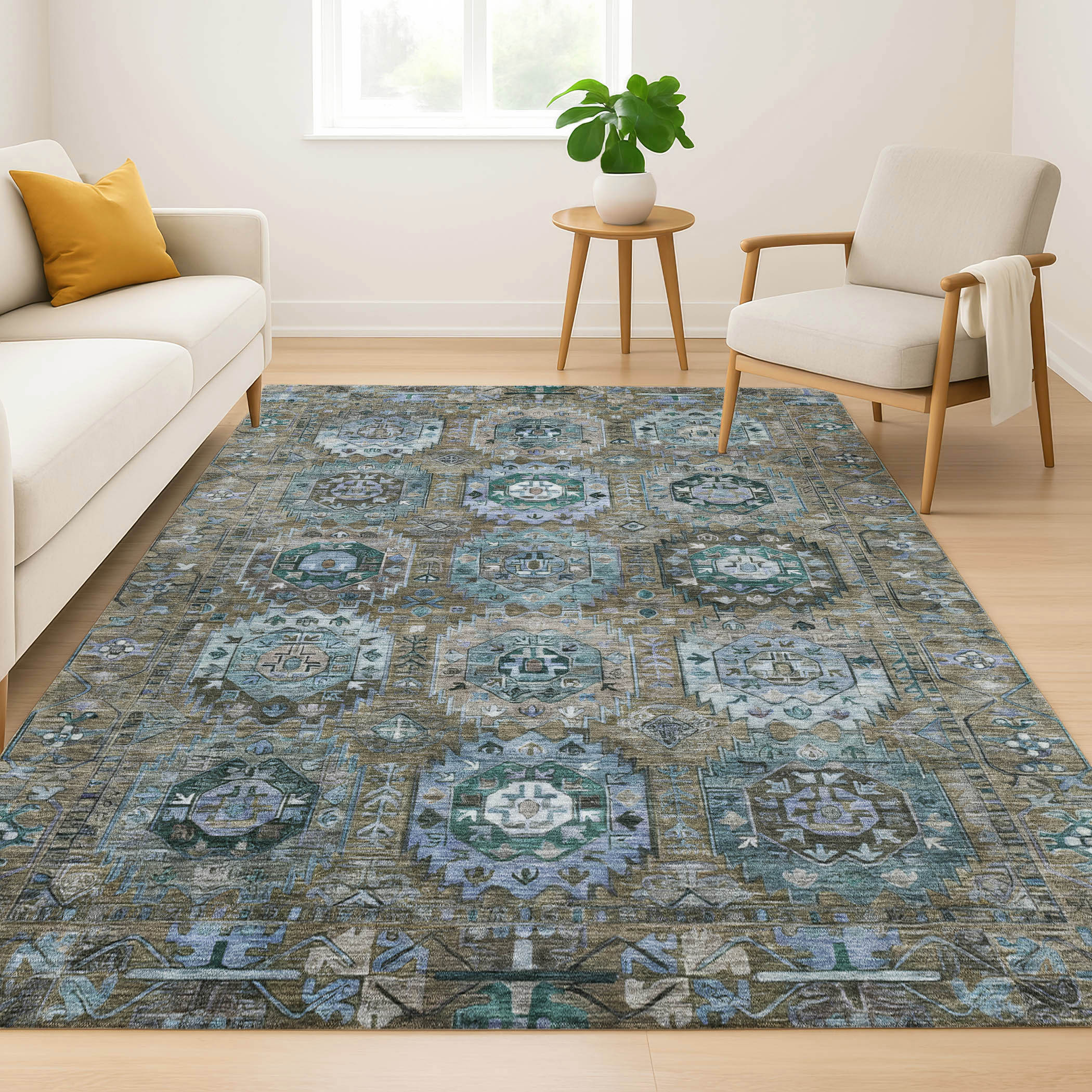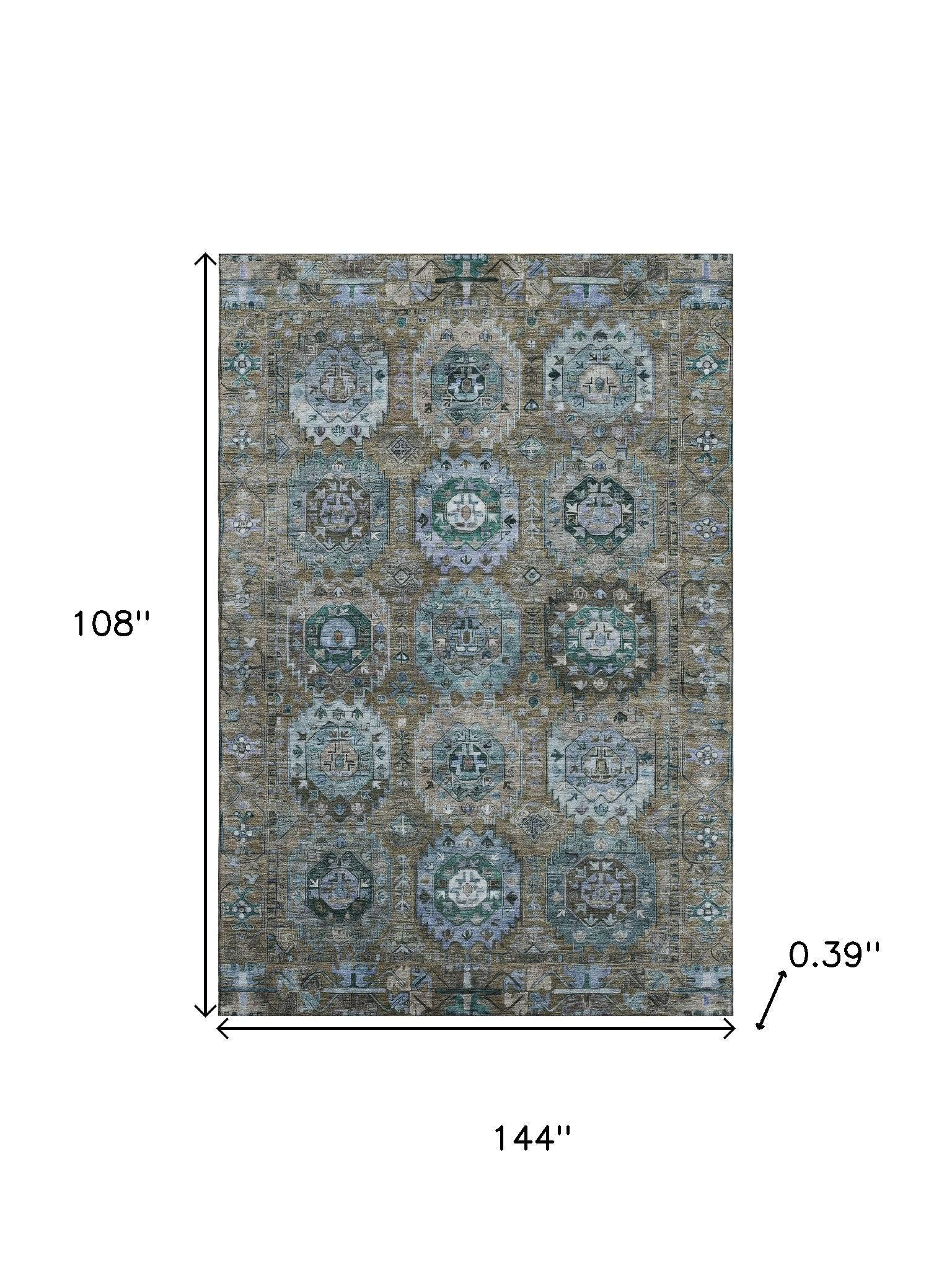 This 9-foot x 12-foot brown and blue medallion washable area rug with uv protection, is a great way to add warmth to a room. Ideal for spaces with kids and pets, this rug is stain resistant to help repel dirt and spilled liquids. Built to last, this rug crafted from polyester fibers is known for its durability and long lasting appeal. Rugs are a great way to showcase your style, hide imperfections, warm your home and reduce noise. This larger sized, traditional styled rug is ready to create a focal point or statement piece in your room. 108.00-inch h x 144.00-inch w x 0.39-inch d.