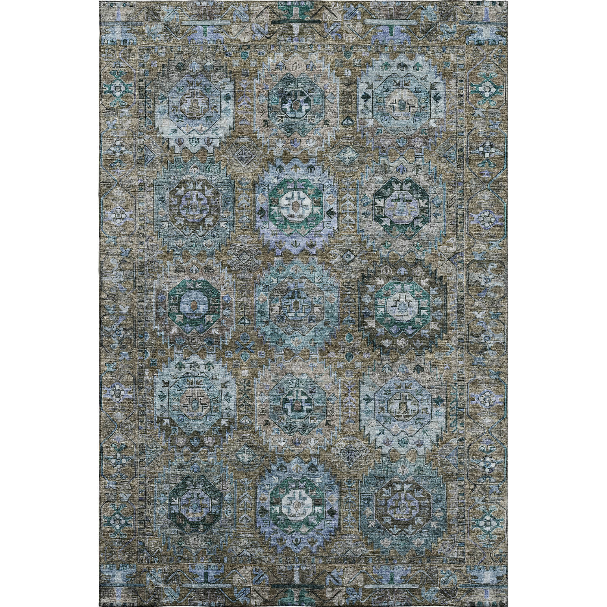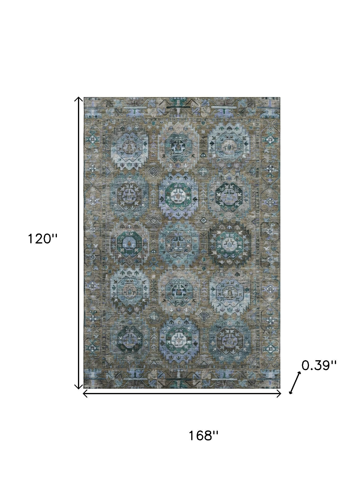 This 10-foot x 14-foot brown and blue medallion washable area rug with uv protection, is a great way to add warmth to a room. Ideal for spaces with kids and pets, this rug is stain resistant to help repel dirt and spilled liquids. Built to last, this rug crafted from polyester fibers is known for its durability and long lasting appeal. Rugs are a great way to showcase your style, hide imperfections, warm your home and reduce noise. This larger sized, traditional styled rug is ready to create a focal point or statement piece in your room. 120.00-inch h x 168.00-inch w x 0.39-inch d.
