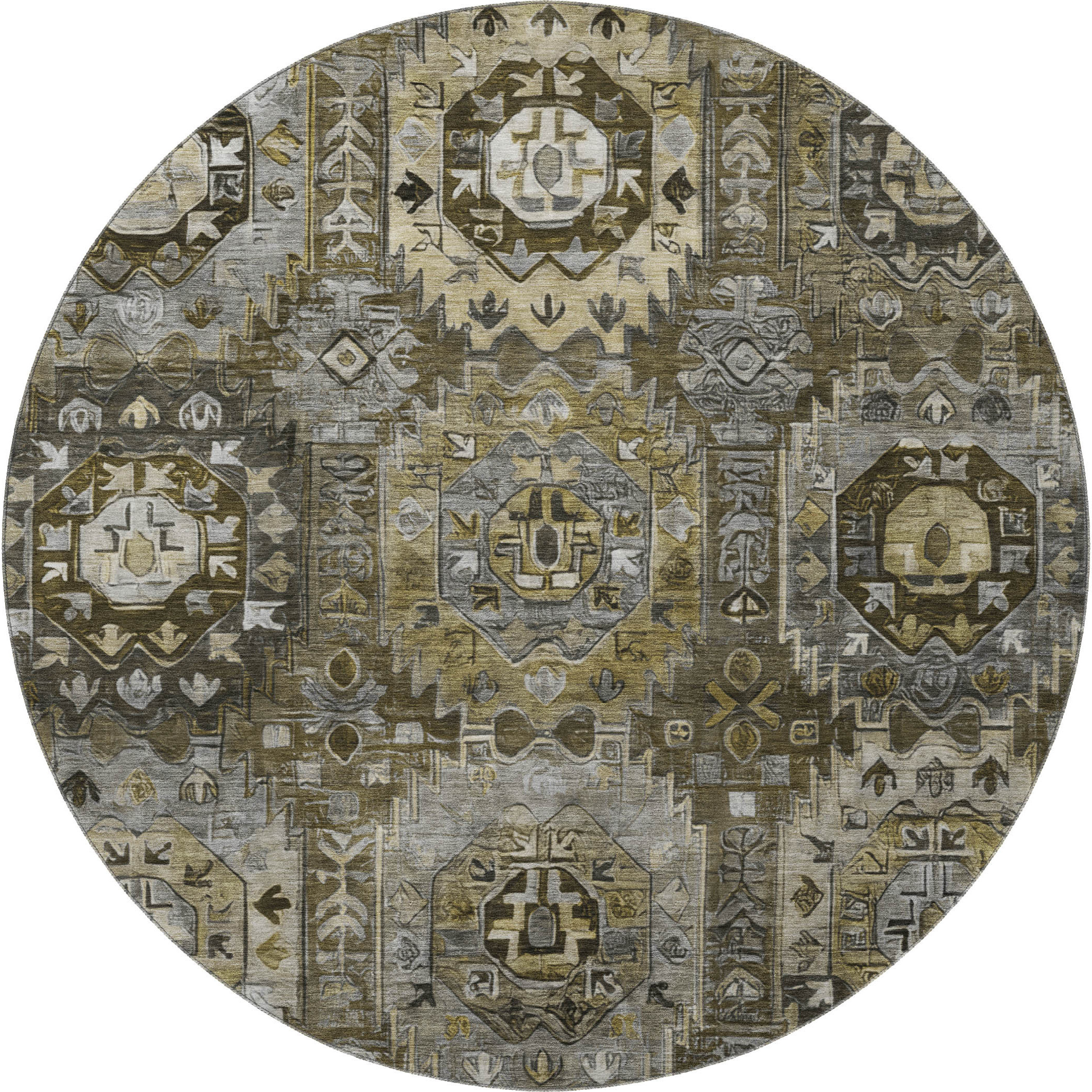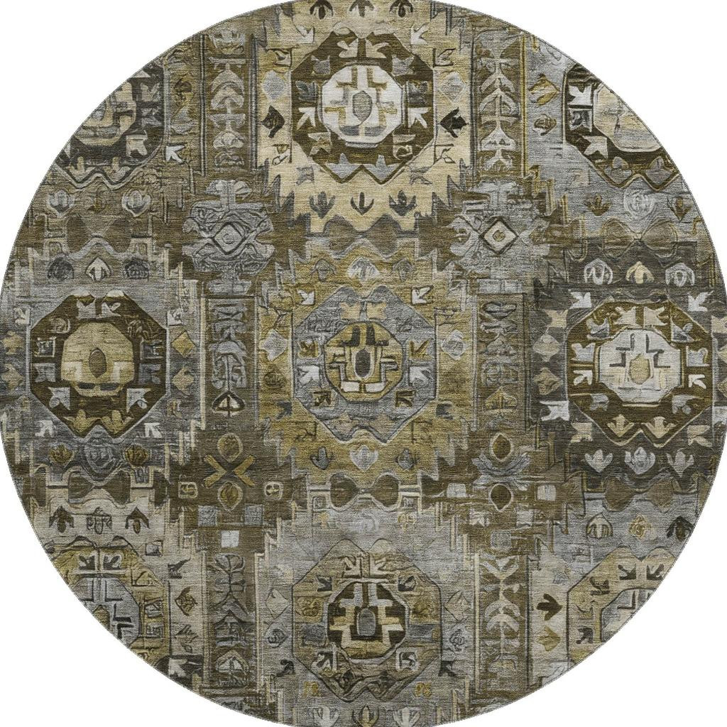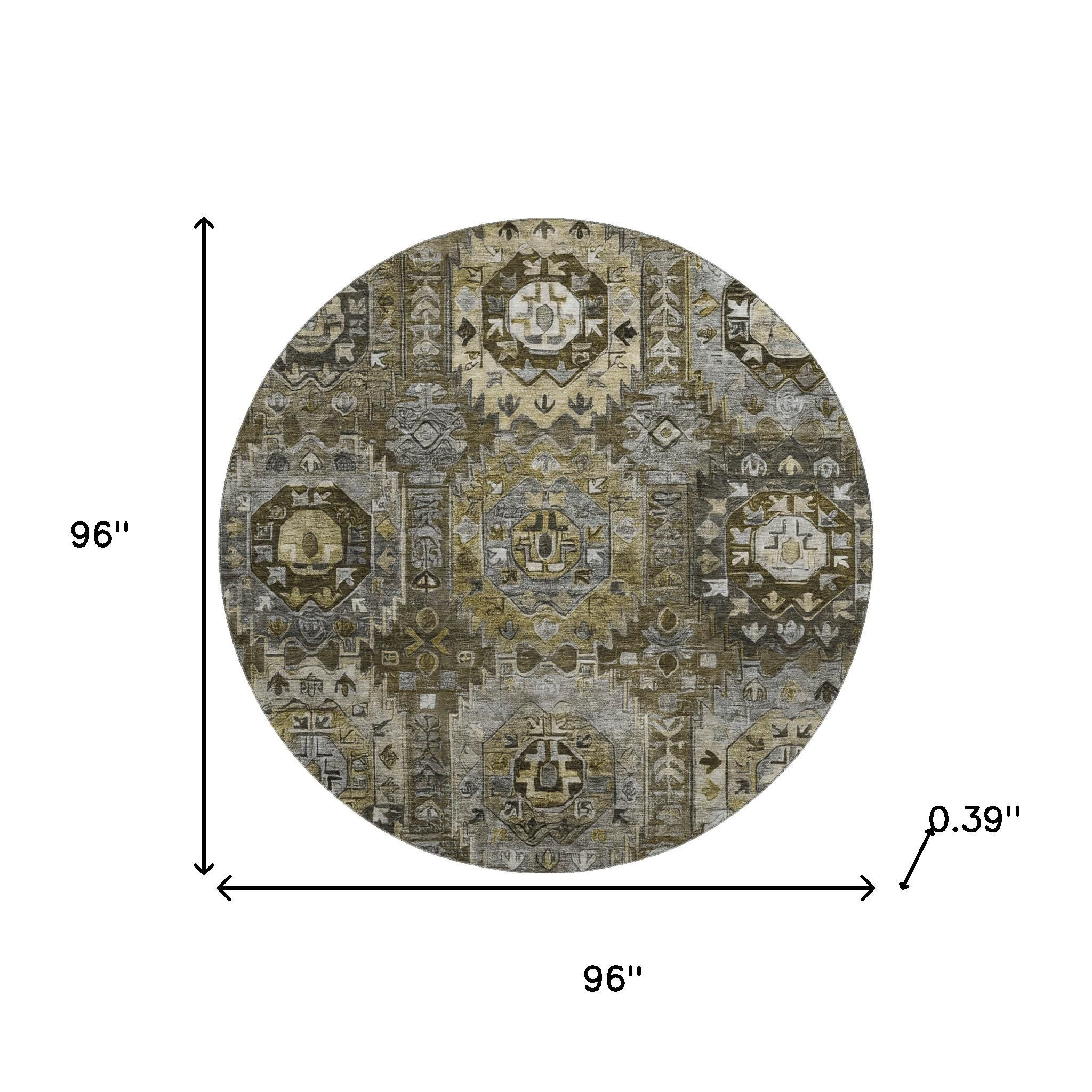 Add some artistry to your room with this 8-foot coffee and charcoal medallion washable round rug with uv protection. Ideal for spaces with kids and pets, this rug is stain resistant to help repel dirt and spilled liquids. Built to last, this rug crafted from polyester fibers is known for its durability and long lasting appeal. Rugs are a great way to showcase your style, hide imperfections, warm your home and reduce noise. This larger sized, traditional styled rug is ready to create a focal point or statement piece in your room. 96.00-inch h x 96.00-inch w x 0.39-inch d.