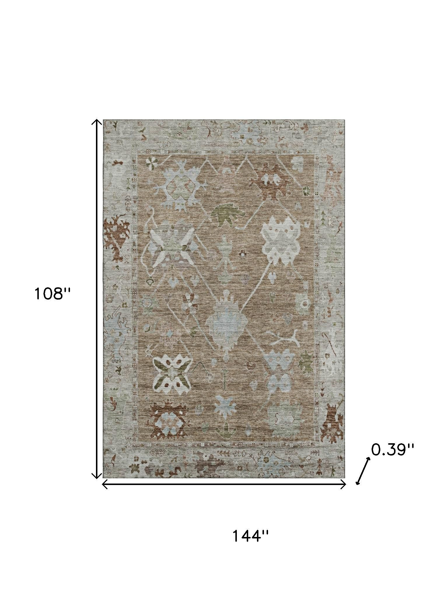 Add some artistry to your room with this 9-foot x 12-foot brown and gray oriental washable area rug with uv protection. Ideal for spaces with kids and pets, this rug is stain resistant to help repel dirt and spilled liquids. Built to last, this rug crafted from polyester fibers is known for its durability and long lasting appeal. Rugs are a great way to showcase your style, hide imperfections, warm your home and reduce noise. This larger sized, traditional styled rug is ready to create a focal point or statement piece in your room. 108.00-inch h x 144.00-inch w x 0.39-inch d.