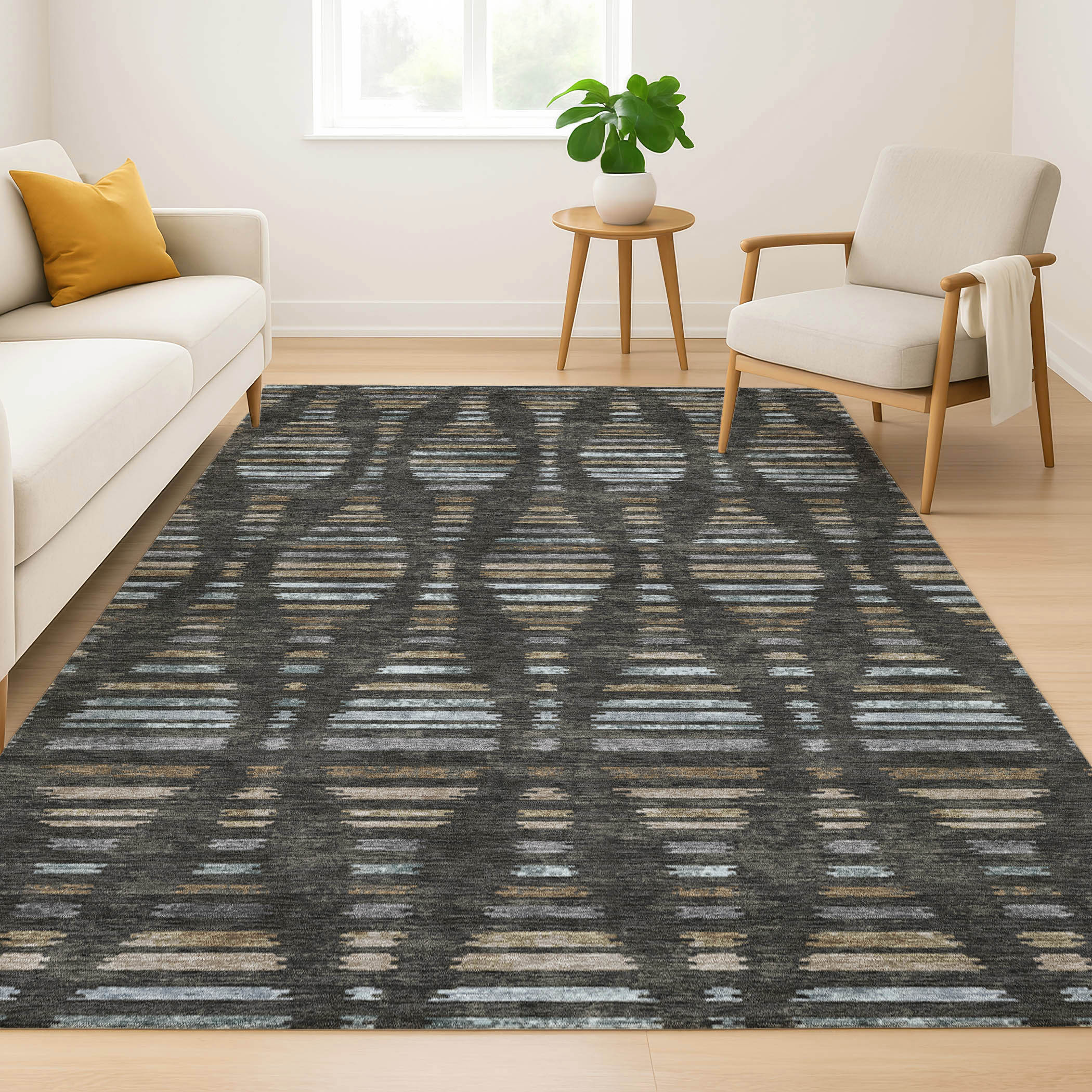 Set an inviting tone in your space with this 3-foot x 5-foot coffee and gray striped washable area rug with uv protection. Ideal for spaces with kids and pets, this rug is stain resistant to help repel dirt and spilled liquids. Built to last, this rug crafted from polyester fibers is known for its durability and long lasting appeal. Rugs are a great way to showcase your style, hide imperfections, warm your home and reduce noise. This smaller sized, transitional styled rug is just what you need for your walkway, bedside, in front of door, cabinet, refrigerator, or chair. 36.00-inch h x 60.00-inch w x 0.39-inch d.