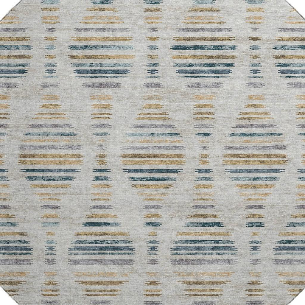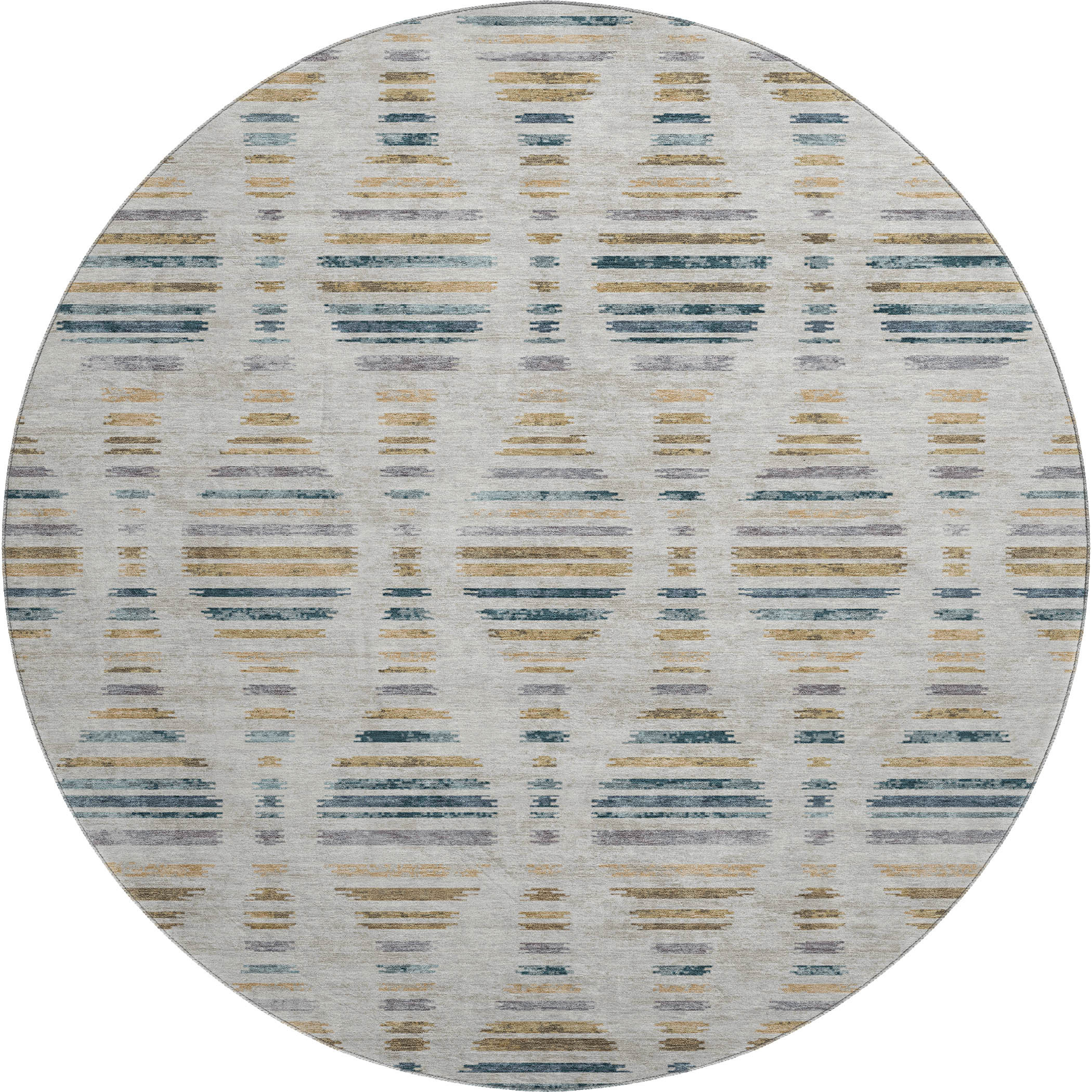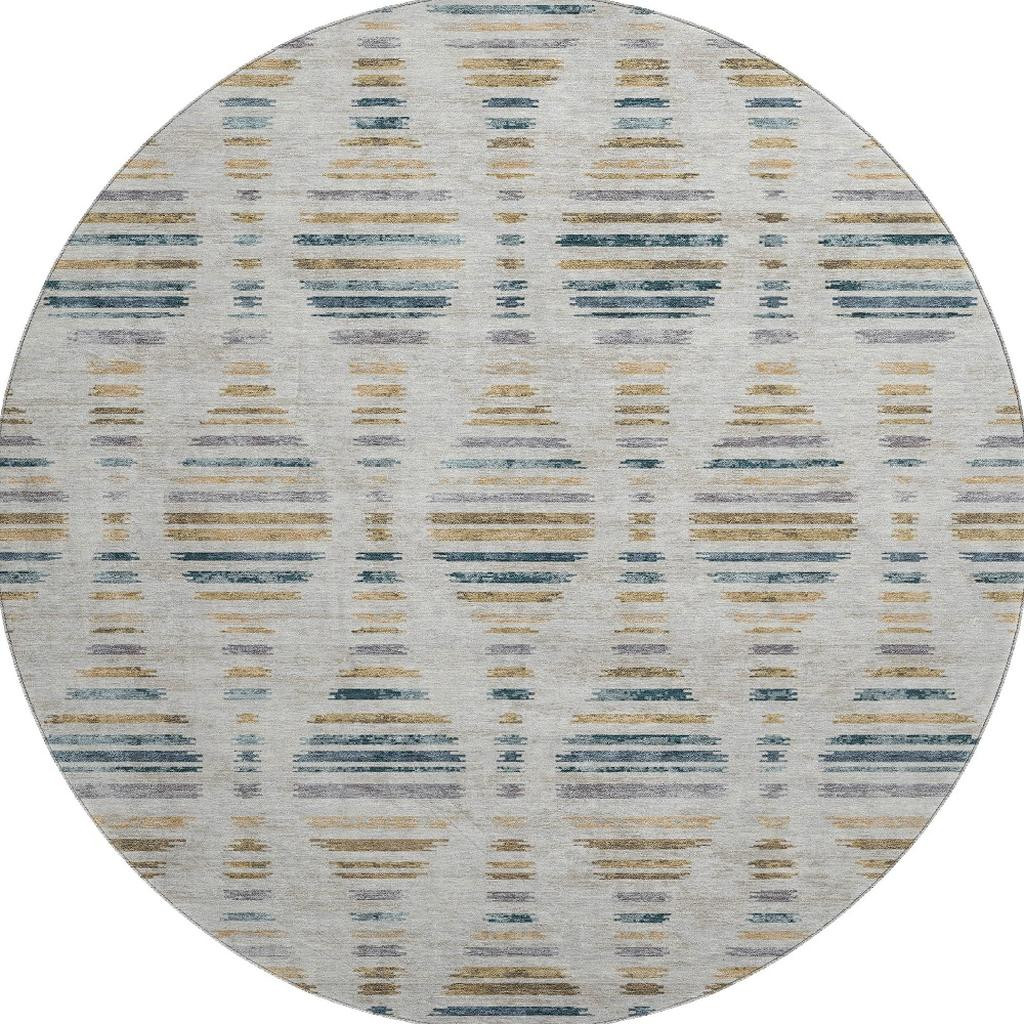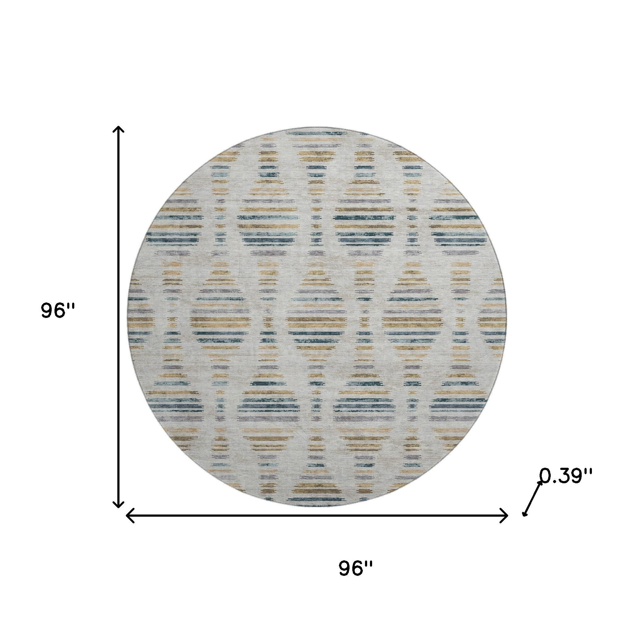 This 8-foot linen and blue striped washable round rug with uv protection, is a great way to add warmth to a room. Ideal for spaces with kids and pets, this rug is stain resistant to help repel dirt and spilled liquids. Built to last, this rug crafted from polyester fibers is known for its durability and long lasting appeal. Rugs are a great way to showcase your style, hide imperfections, warm your home and reduce noise. This larger sized, transitional styled rug is ready to create a focal point or statement piece in your room. 96.00-inch h x 96.00-inch w x 0.39-inch d.