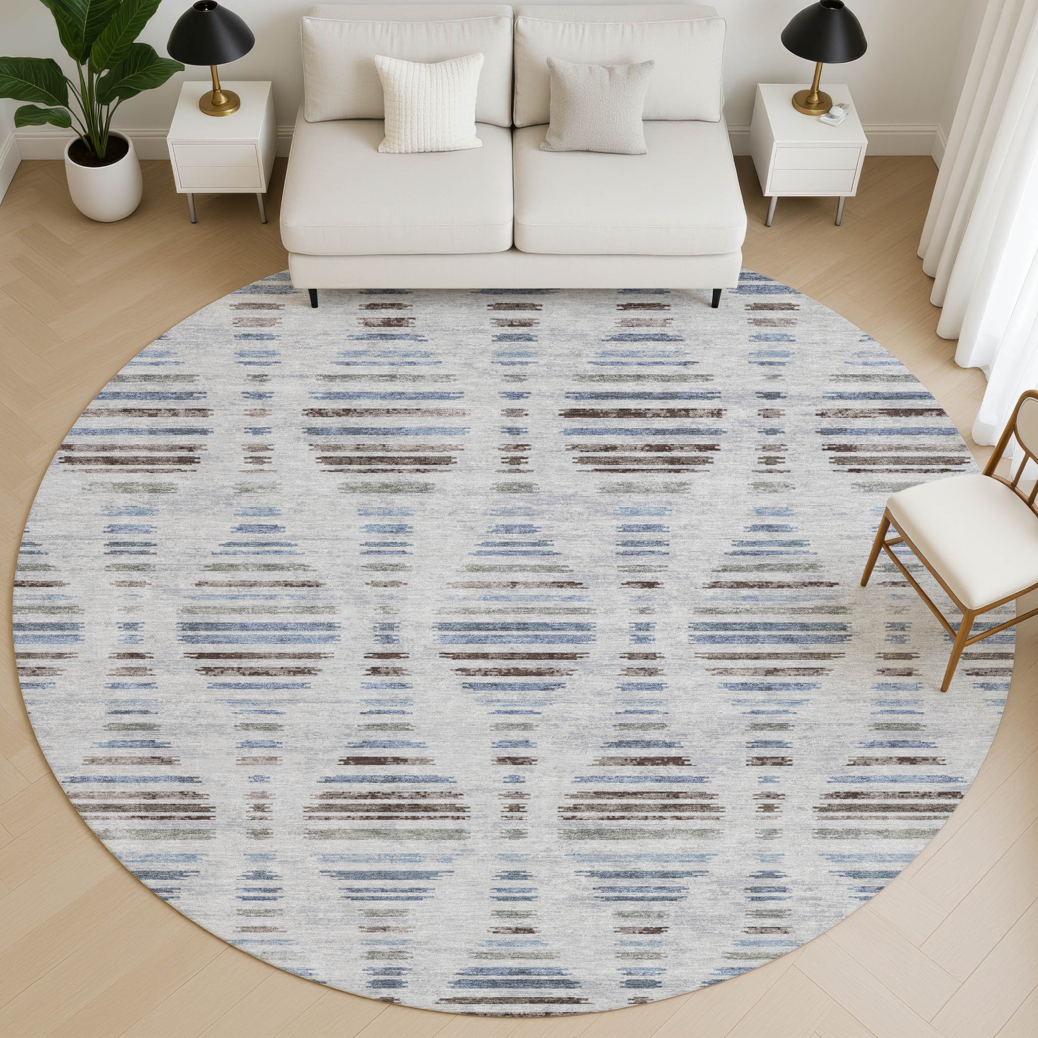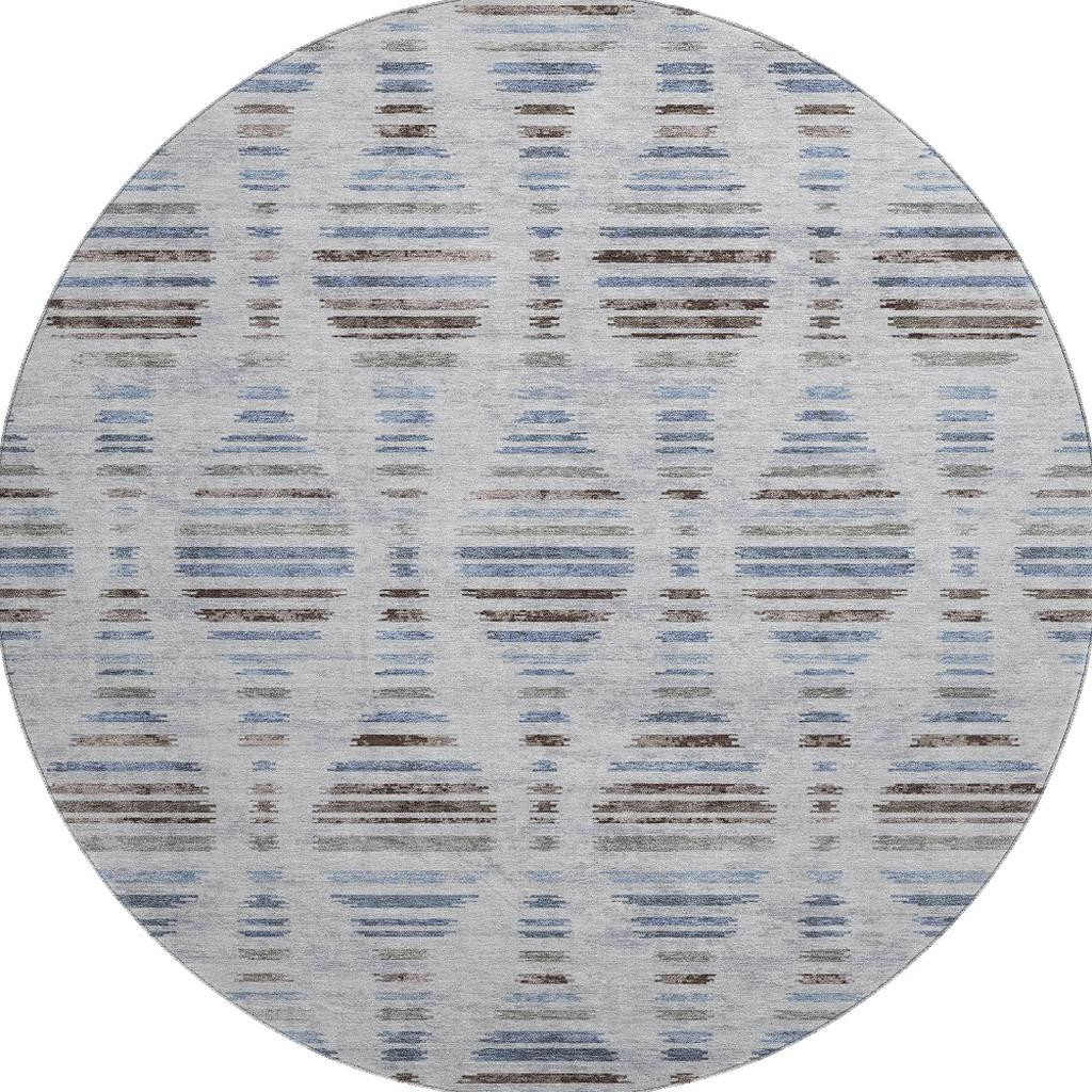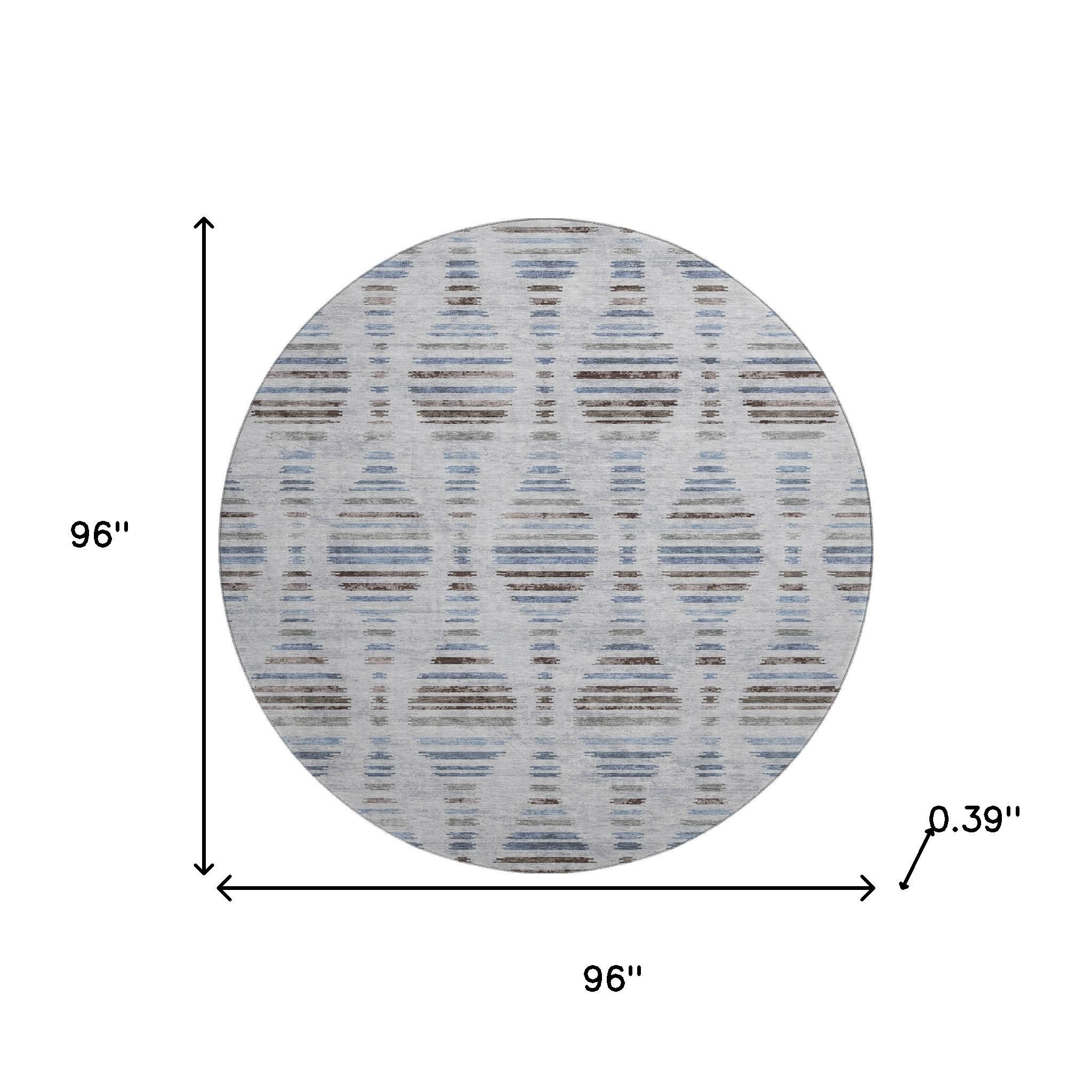 Set an inviting tone in your space with this 8-foot light taupe and blue striped washable round rug with uv protection. Ideal for spaces with kids and pets, this rug is stain resistant to help repel dirt and spilled liquids. Built to last, this rug crafted from polyester fibers is known for its durability and long lasting appeal. Rugs are a great way to showcase your style, hide imperfections, warm your home and reduce noise. This larger sized, transitional styled rug is ready to create a focal point or statement piece in your room. 96.00-inch h x 96.00-inch w x 0.39-inch d.