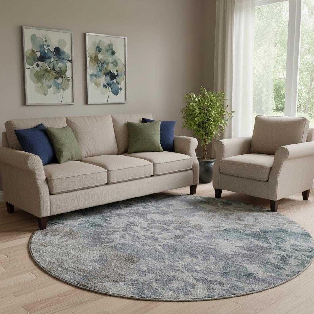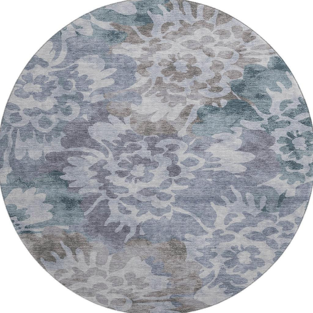 Set an inviting tone in your space with this 8-foot blue and silver floral washable round rug with uv protection. Ideal for spaces with kids and pets, this rug is stain resistant to help repel dirt and spilled liquids. Built to last, this rug crafted from polyester fibers is known for its durability and long lasting appeal. Rugs are a great way to showcase your style, hide imperfections, warm your home and reduce noise. This larger sized, transitional styled rug is ready to create a focal point or statement piece in your room. 96.00-inch h x 96.00-inch w x 0.39-inch d.