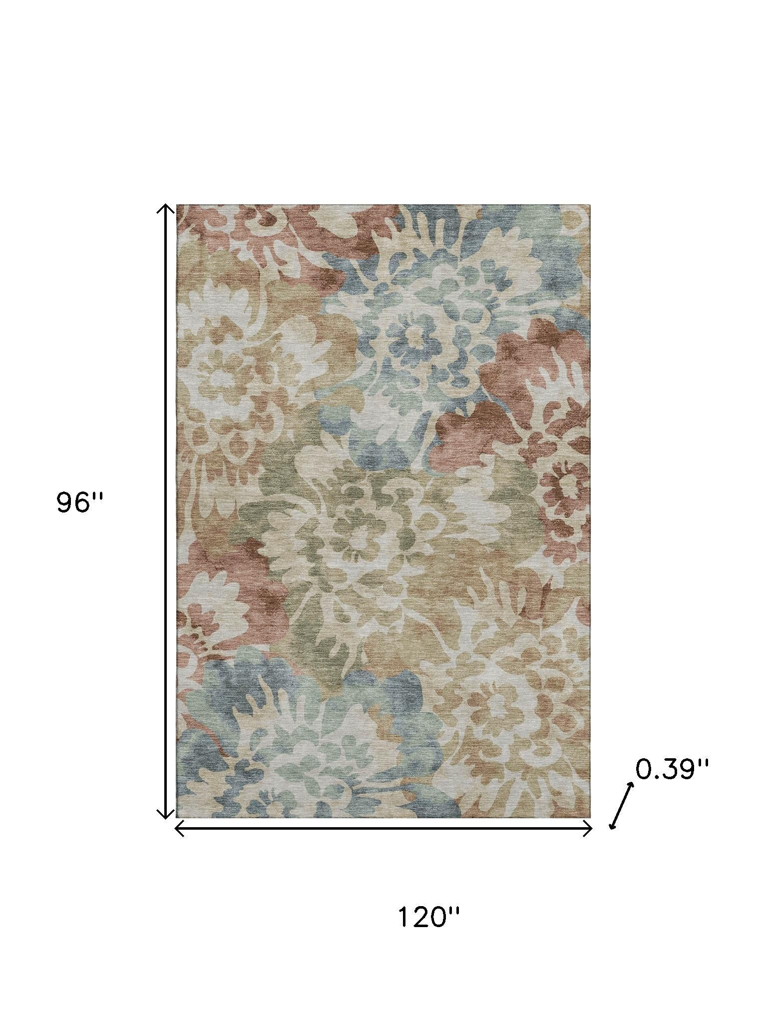 Set an inviting tone in your space with this 8-foot x 10-foot rust and blue floral washable area rug with uv protection. Ideal for spaces with kids and pets, this rug is stain resistant to help repel dirt and spilled liquids. Built to last, this rug crafted from polyester fibers is known for its durability and long lasting appeal. Rugs are a great way to showcase your style, hide imperfections, warm your home and reduce noise. This larger sized, transitional styled rug is ready to create a focal point or statement piece in your room. 96.00-inch h x 120.00-inch w x 0.39-inch d.