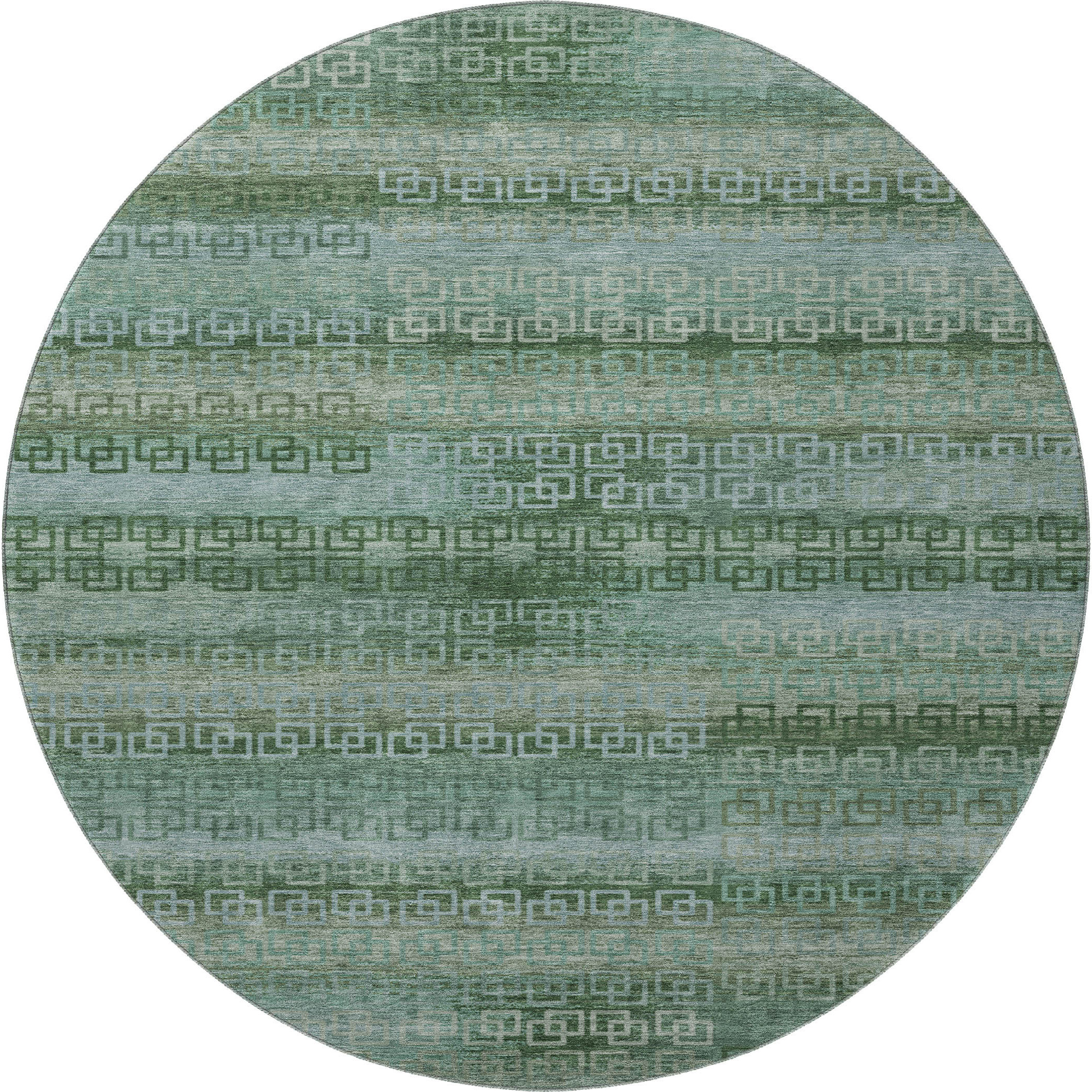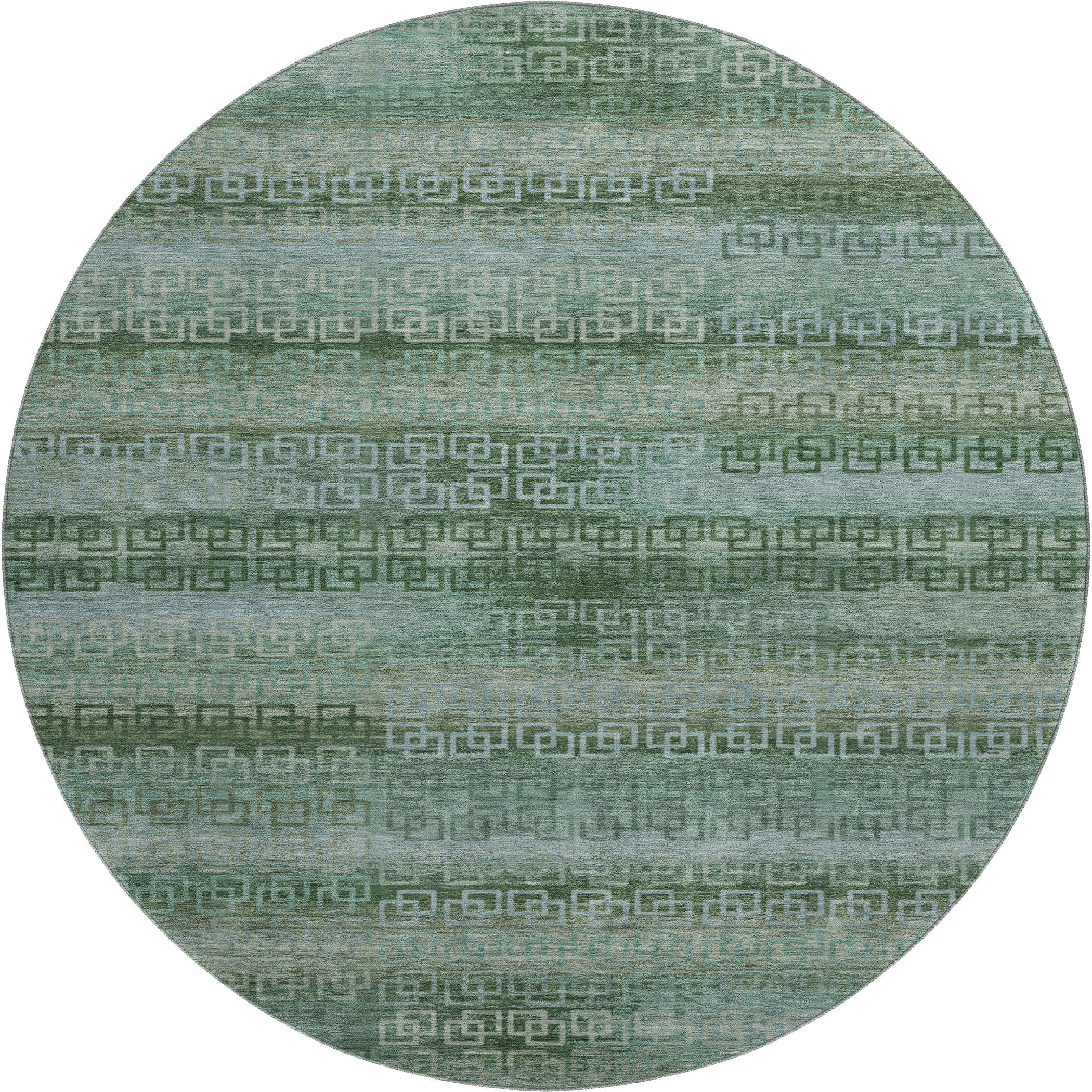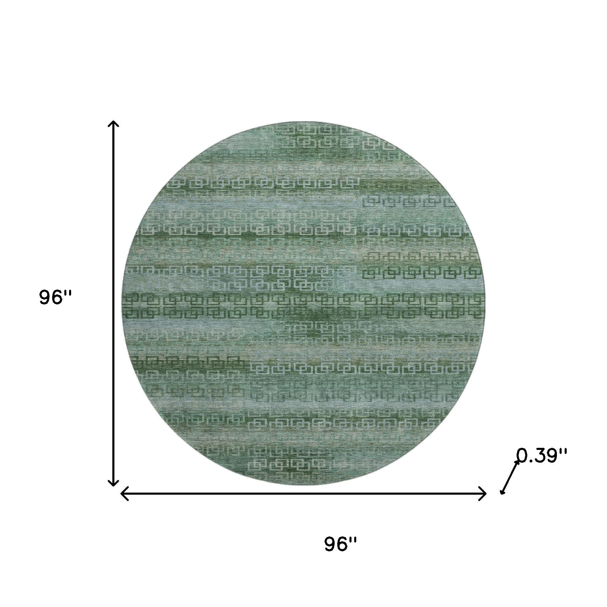 This 8-foot sage and blue striped washable round rug with uv protection, is a great way to add warmth to a room. Ideal for spaces with kids and pets, this rug is stain resistant to help repel dirt and spilled liquids. Built to last, this rug crafted from polyester fibers is known for its durability and long lasting appeal. Rugs are a great way to showcase your style, hide imperfections, warm your home and reduce noise. This larger sized, transitional styled rug is ready to create a focal point or statement piece in your room. 96.00-inch h x 96.00-inch w x 0.39-inch d.