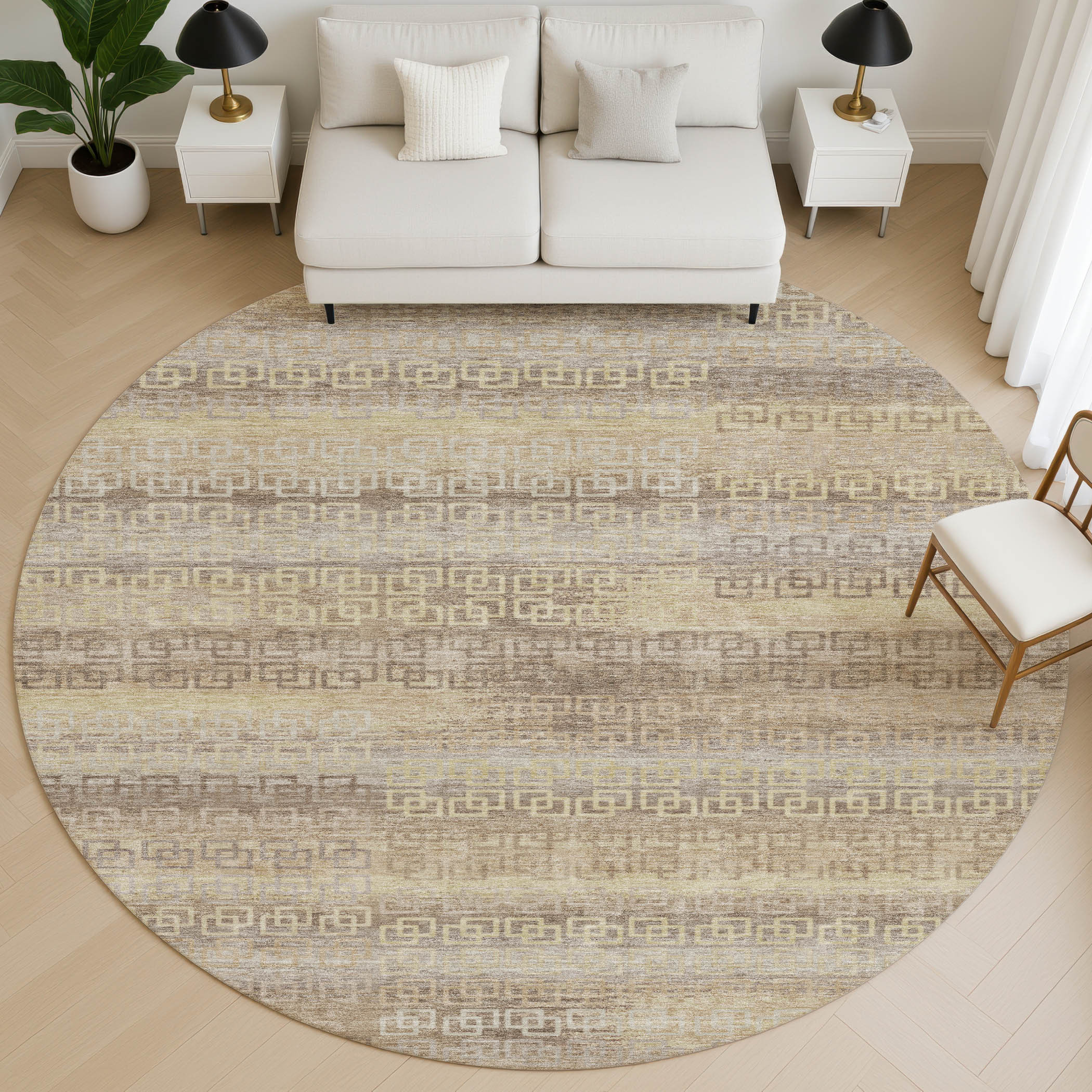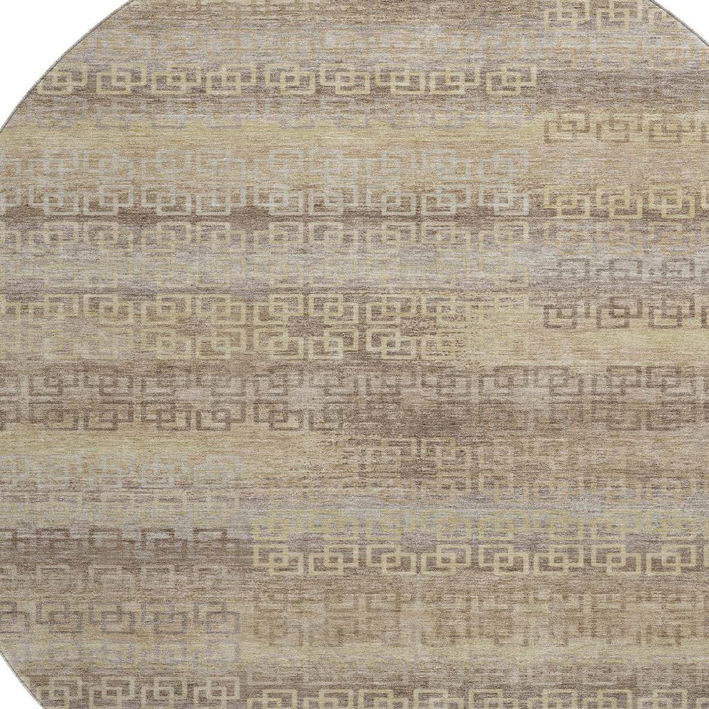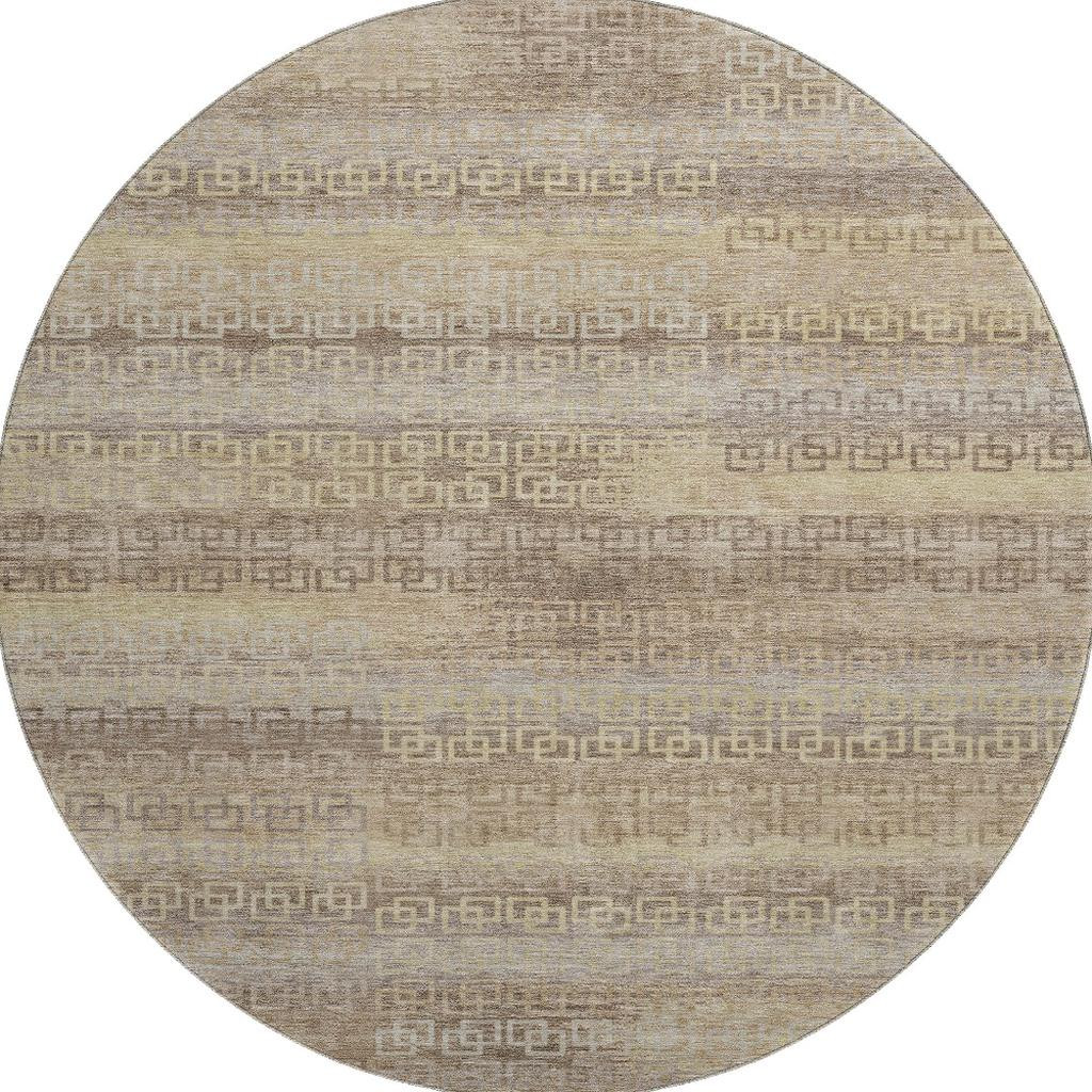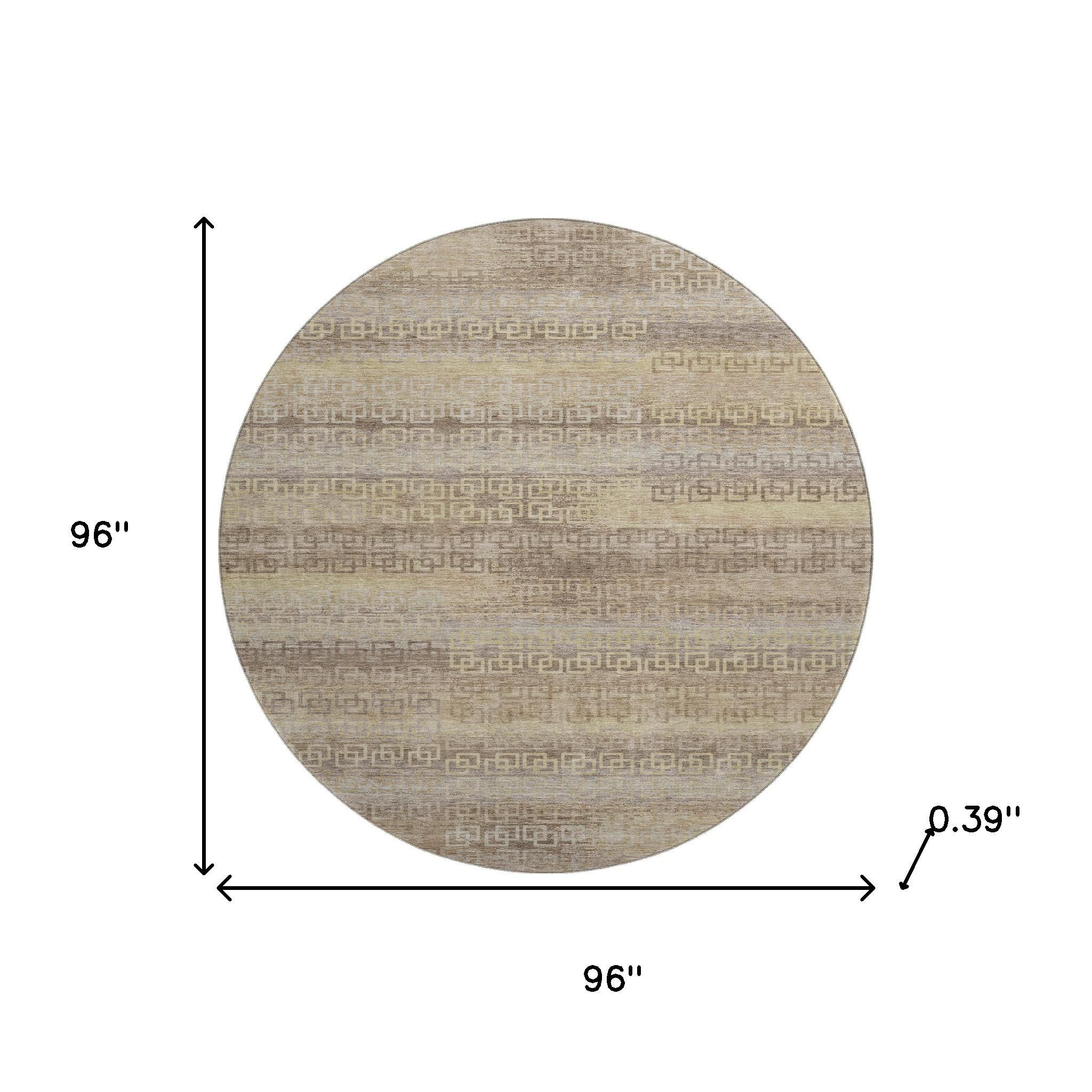 This 8-foot beige and brown striped washable round rug with uv protection, is a great way to add warmth to a room. Ideal for spaces with kids and pets, this rug is stain resistant to help repel dirt and spilled liquids. Built to last, this rug crafted from polyester fibers is known for its durability and long lasting appeal. Rugs are a great way to showcase your style, hide imperfections, warm your home and reduce noise. This larger sized, transitional styled rug is ready to create a focal point or statement piece in your room. 96.00-inch h x 96.00-inch w x 0.39-inch d.