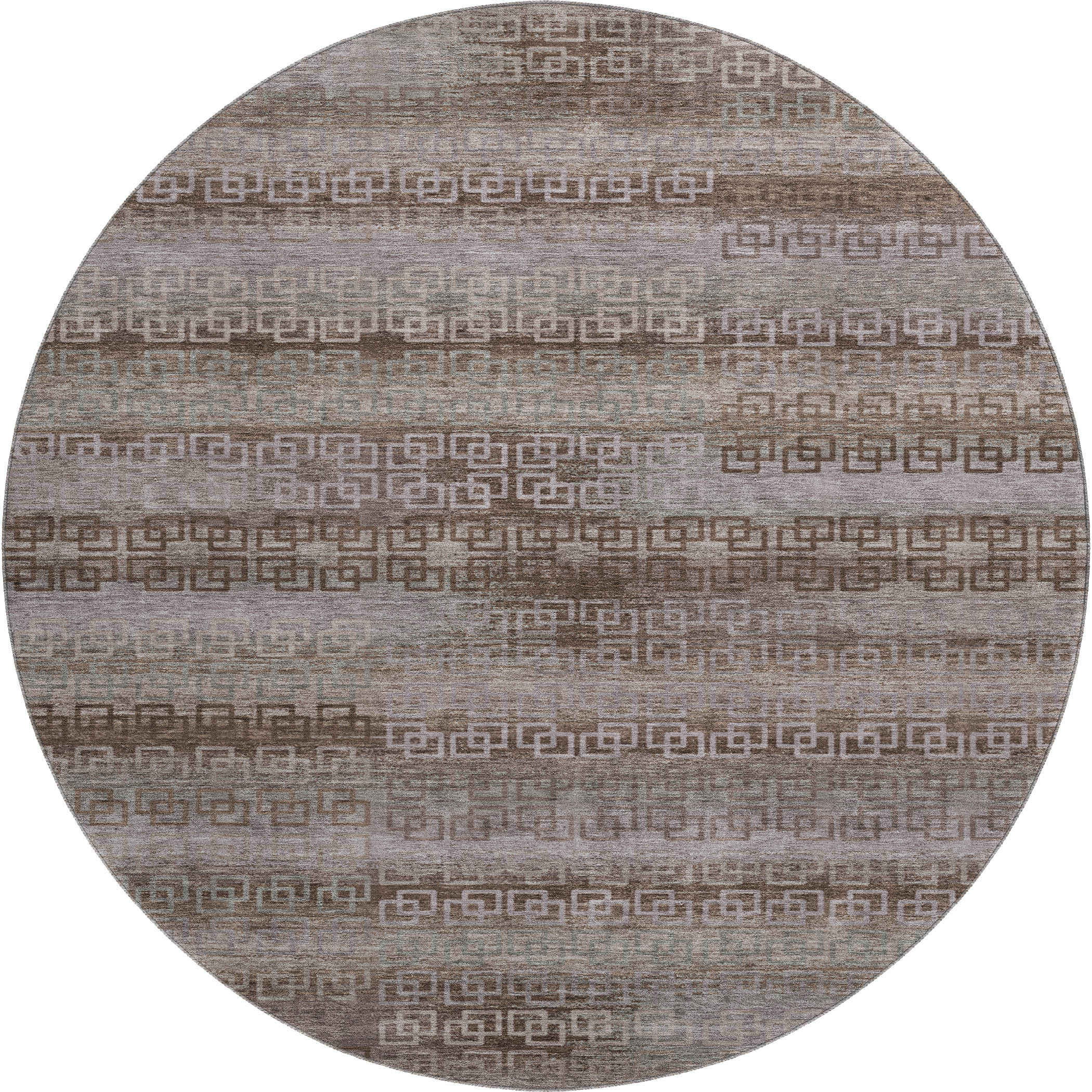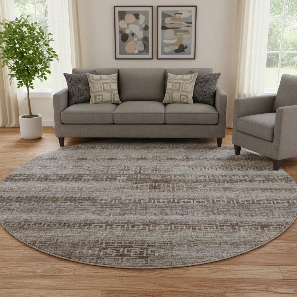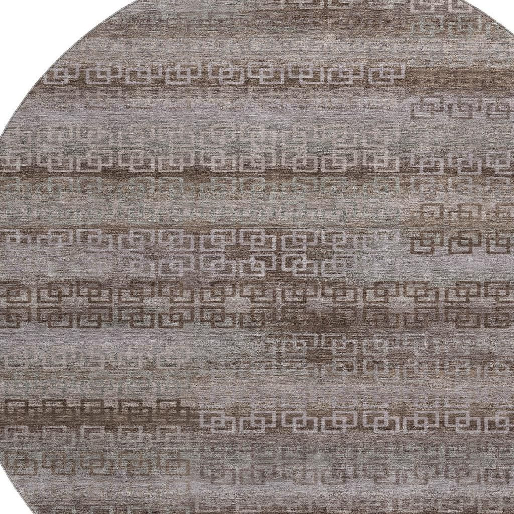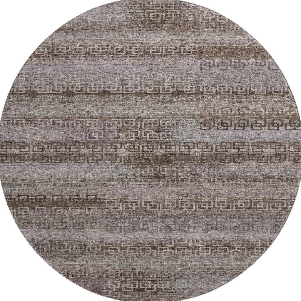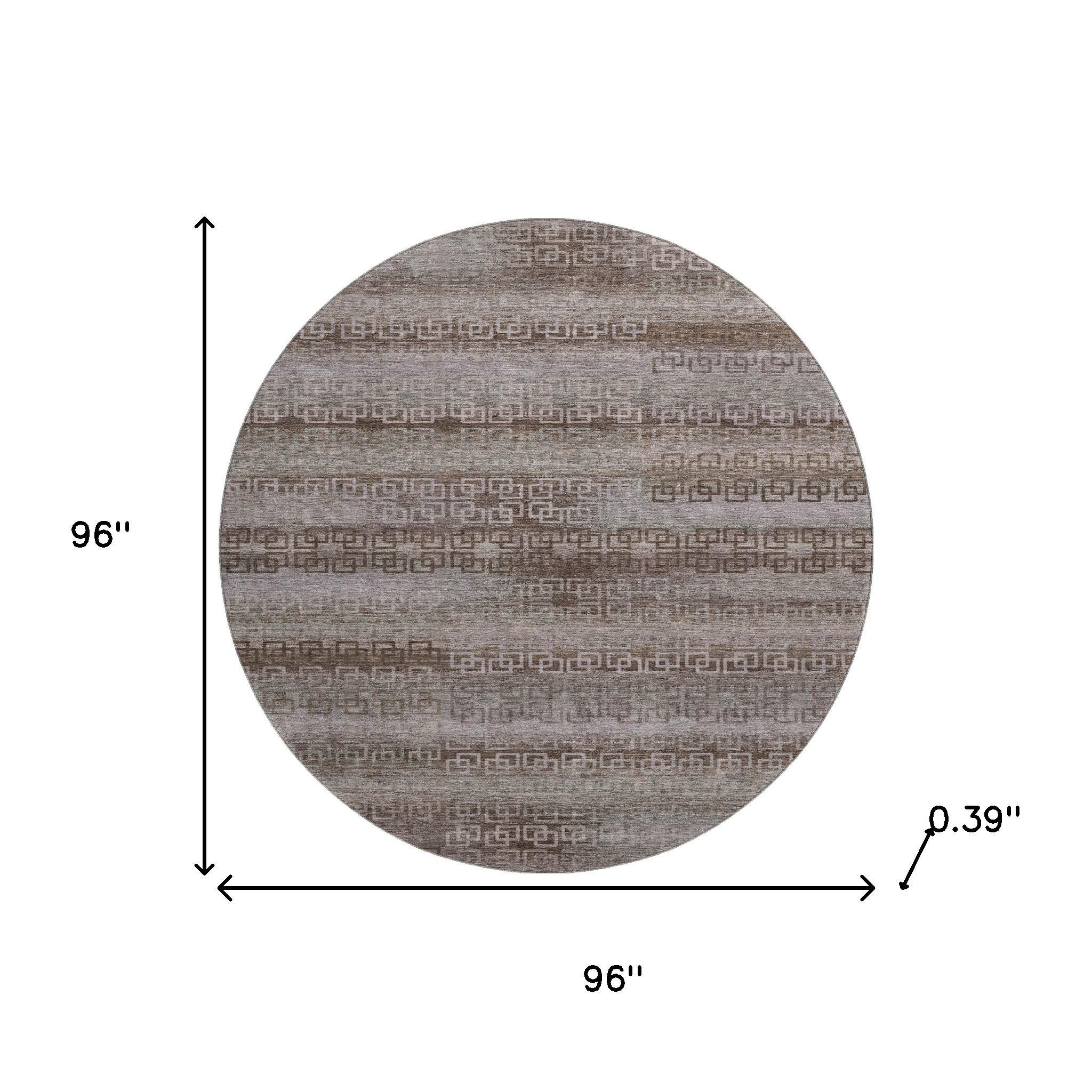 Add great coloration and comfortable texture to your space with this 8-foot chocolate and gray striped washable round rug with uv protection. Ideal for spaces with kids and pets, this rug is stain resistant to help repel dirt and spilled liquids. Built to last, this rug crafted from polyester fibers is known for its durability and long lasting appeal. Rugs are a great way to showcase your style, hide imperfections, warm your home and reduce noise. This larger sized, transitional styled rug is ready to create a focal point or statement piece in your room. 96.00-inch h x 96.00-inch w x 0.39-inch d.