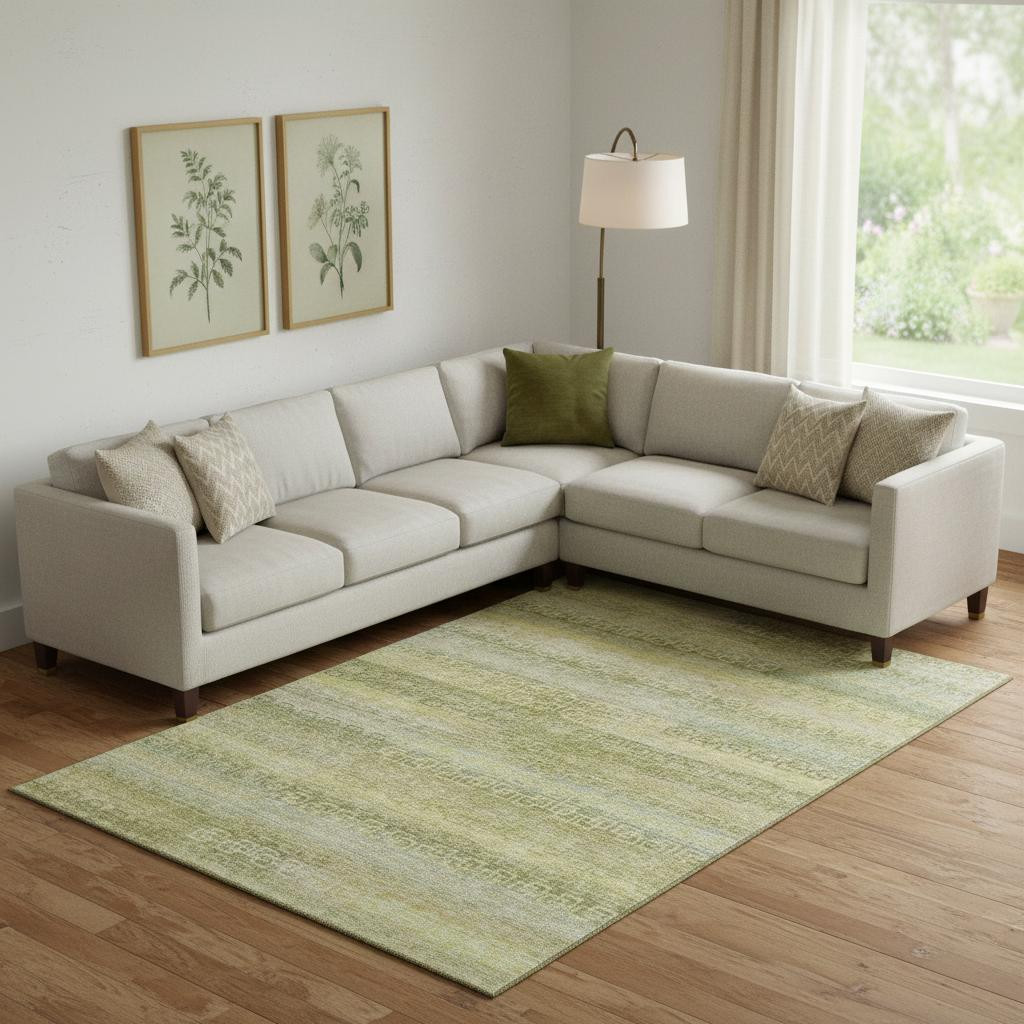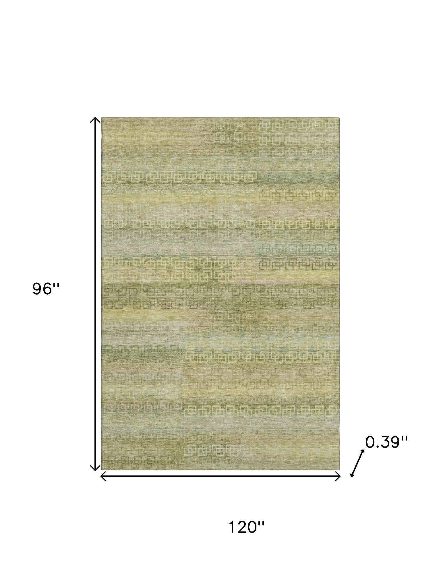Add some artistry to your room with this 8-foot x 10-foot sage and gold striped washable area rug with uv protection. Ideal for spaces with kids and pets, this rug is stain resistant to help repel dirt and spilled liquids. Built to last, this rug crafted from polyester fibers is known for its durability and long lasting appeal. Rugs are a great way to showcase your style, hide imperfections, warm your home and reduce noise. This larger sized, transitional styled rug is ready to create a focal point or statement piece in your room. 96.00-inch h x 120.00-inch w x 0.39-inch d.