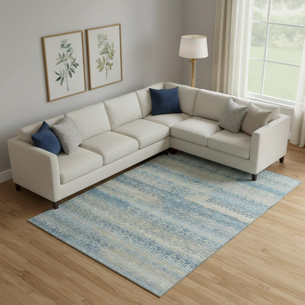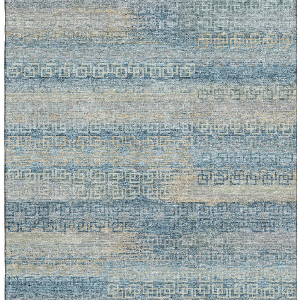 Add some artistry to your room with this 8-foot x 10-foot teal and beige striped washable area rug with uv protection. Ideal for spaces with kids and pets, this rug is stain resistant to help repel dirt and spilled liquids. Built to last, this rug crafted from polyester fibers is known for its durability and long lasting appeal. Rugs are a great way to showcase your style, hide imperfections, warm your home and reduce noise. This larger sized, transitional styled rug is ready to create a focal point or statement piece in your room. 96.00-inch h x 120.00-inch w x 0.39-inch d.