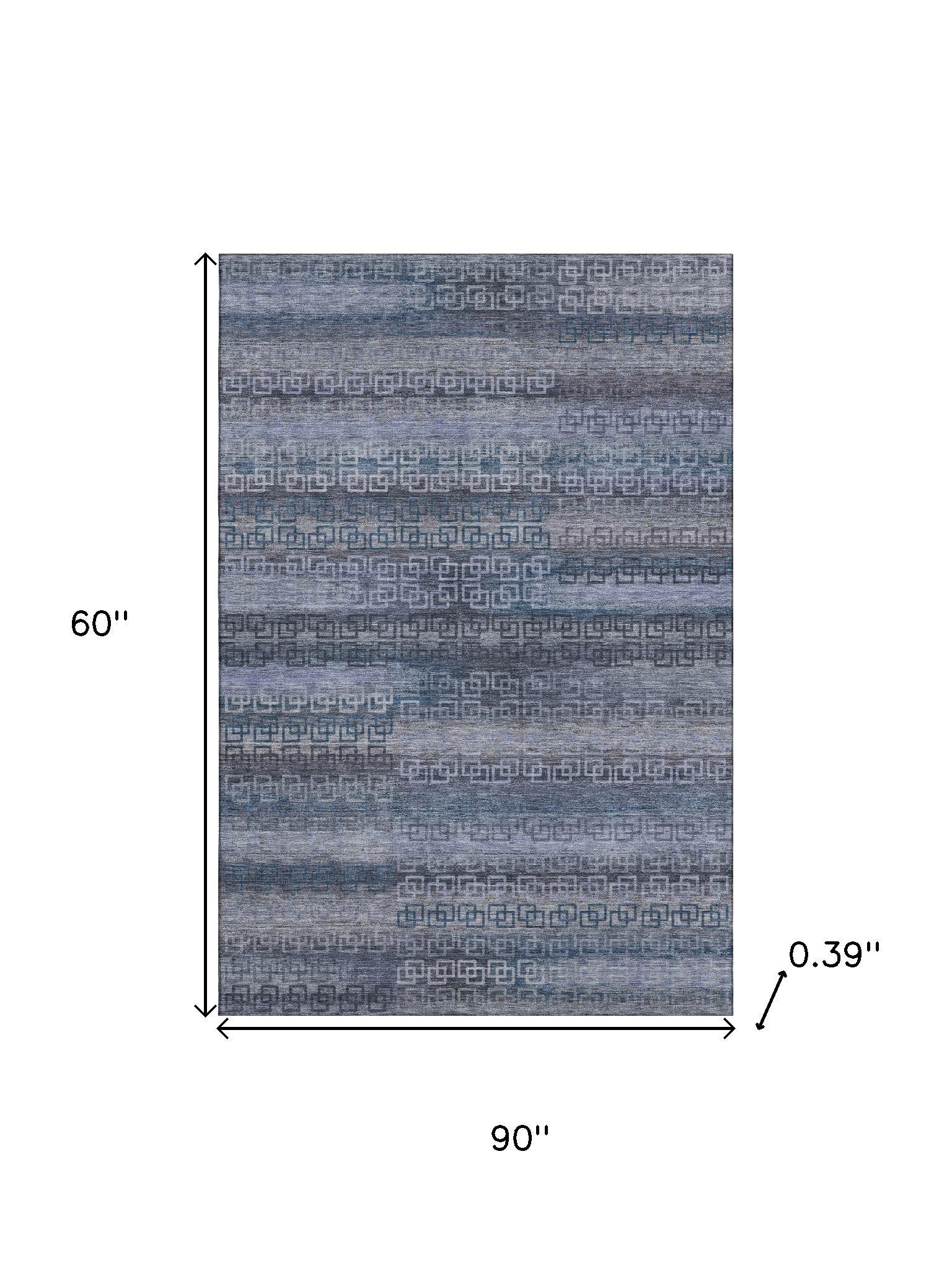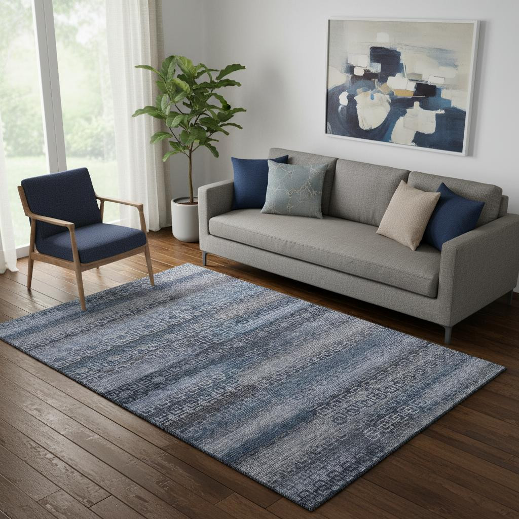 Add some artistry to your room with this 5-foot x 8-foot taupe and blue striped washable area rug with uv protection. Ideal for spaces with kids and pets, this rug is stain resistant to help repel dirt and spilled liquids. Built to last, this rug crafted from polyester fibers is known for its durability and long lasting appeal. Rugs are a great way to showcase your style, hide imperfections, warm your home and reduce noise. This larger sized, transitional styled rug is ready to create a focal point or statement piece in your room. 60.00-inch h x 90.00-inch w x 0.39-inch d.