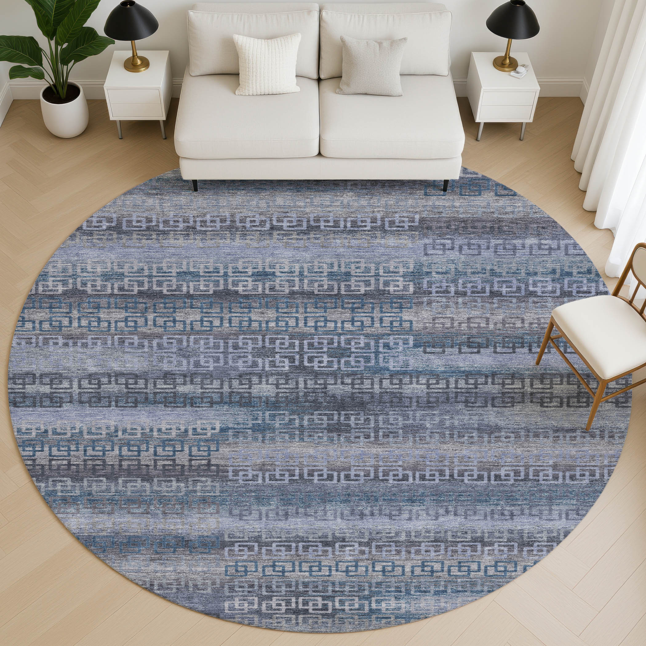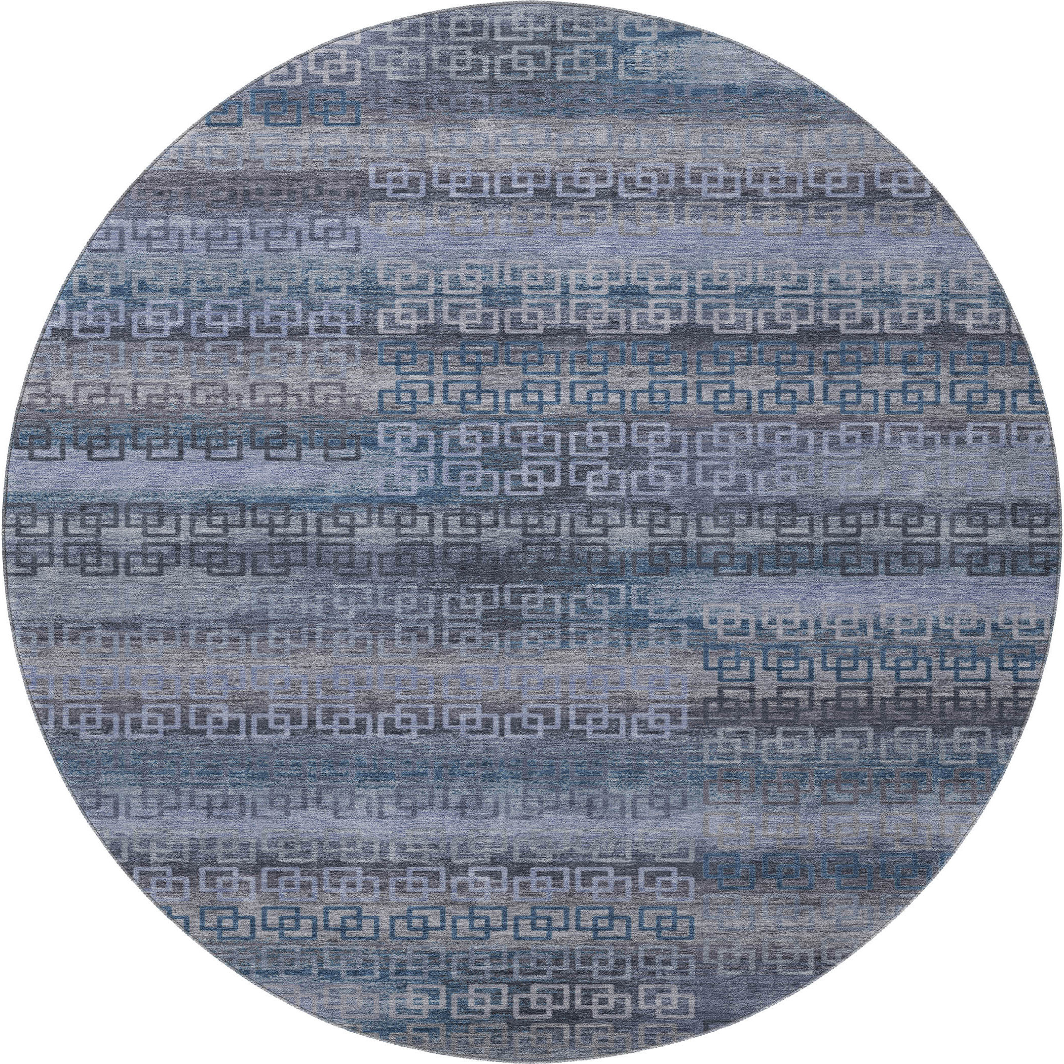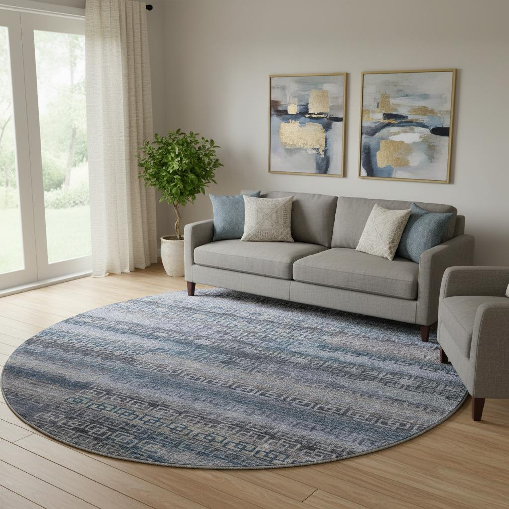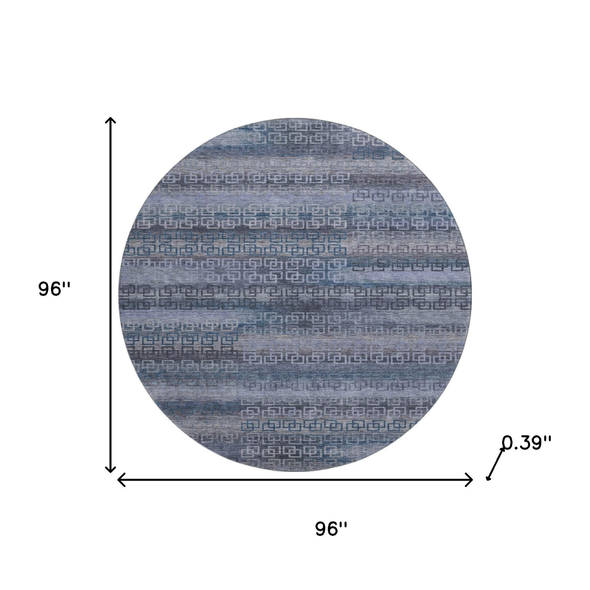 Set an inviting tone in your space with this 8-foot taupe and blue striped washable round rug with uv protection. Ideal for spaces with kids and pets, this rug is stain resistant to help repel dirt and spilled liquids. Built to last, this rug crafted from polyester fibers is known for its durability and long lasting appeal. Rugs are a great way to showcase your style, hide imperfections, warm your home and reduce noise. This larger sized, transitional styled rug is ready to create a focal point or statement piece in your room. 96.00-inch h x 96.00-inch w x 0.39-inch d.