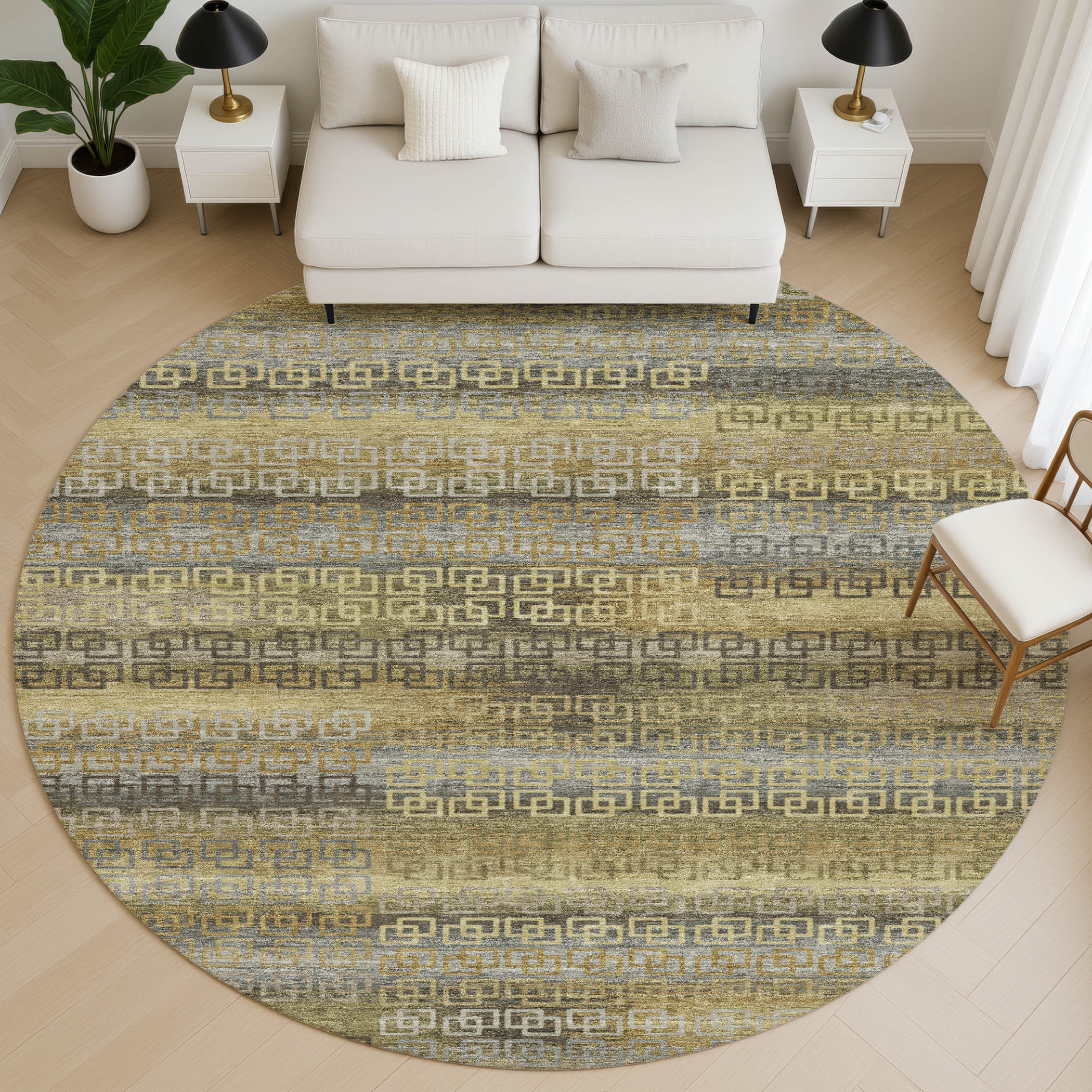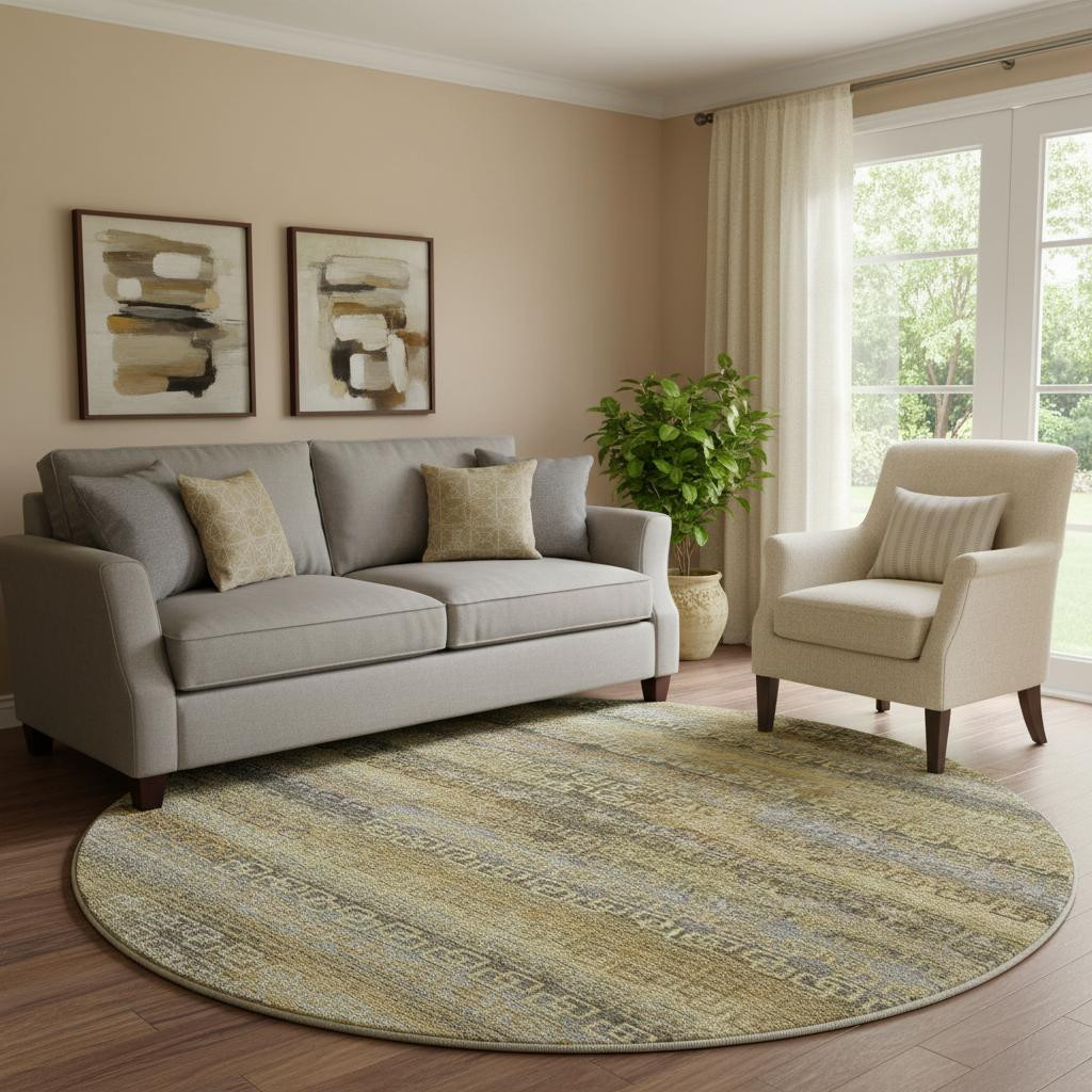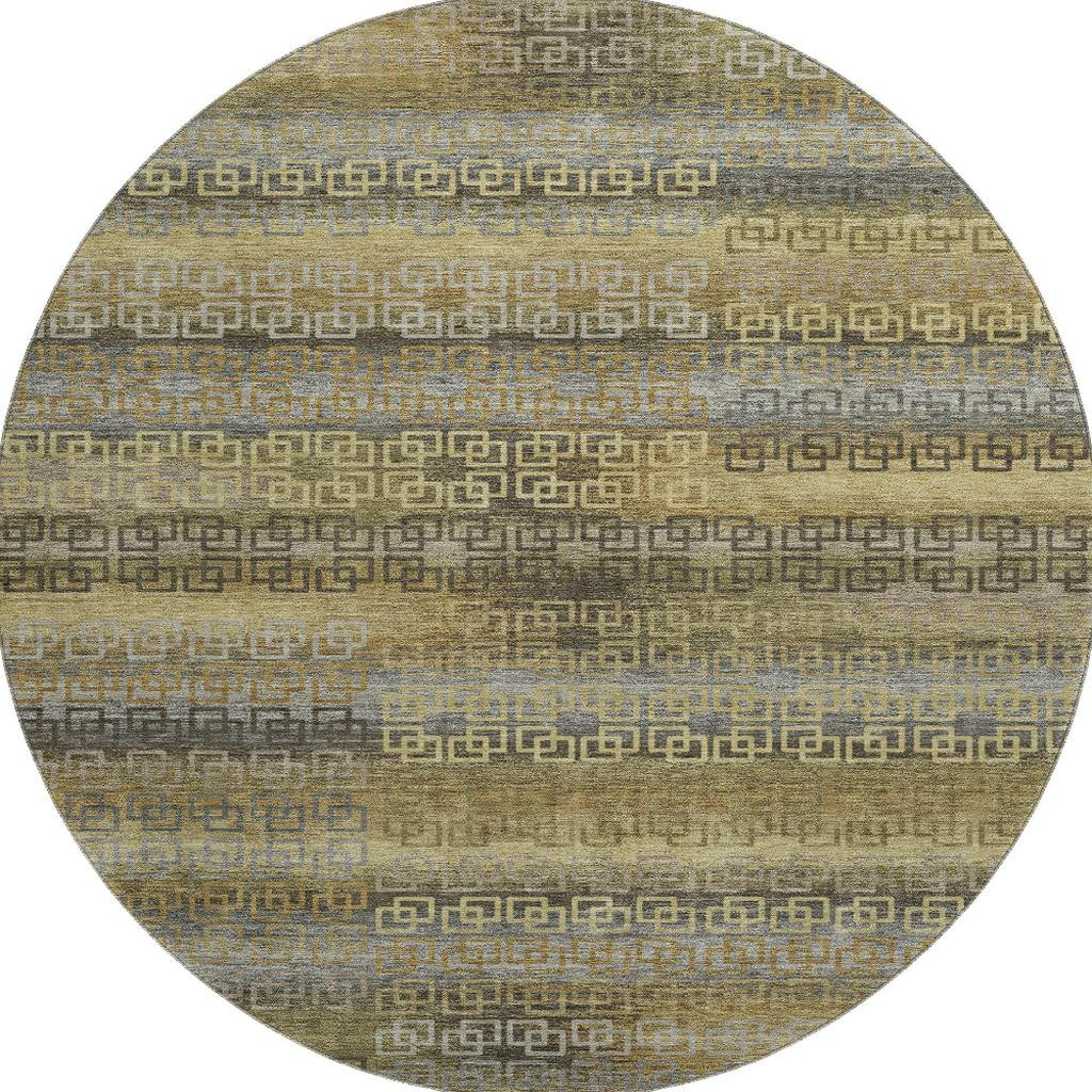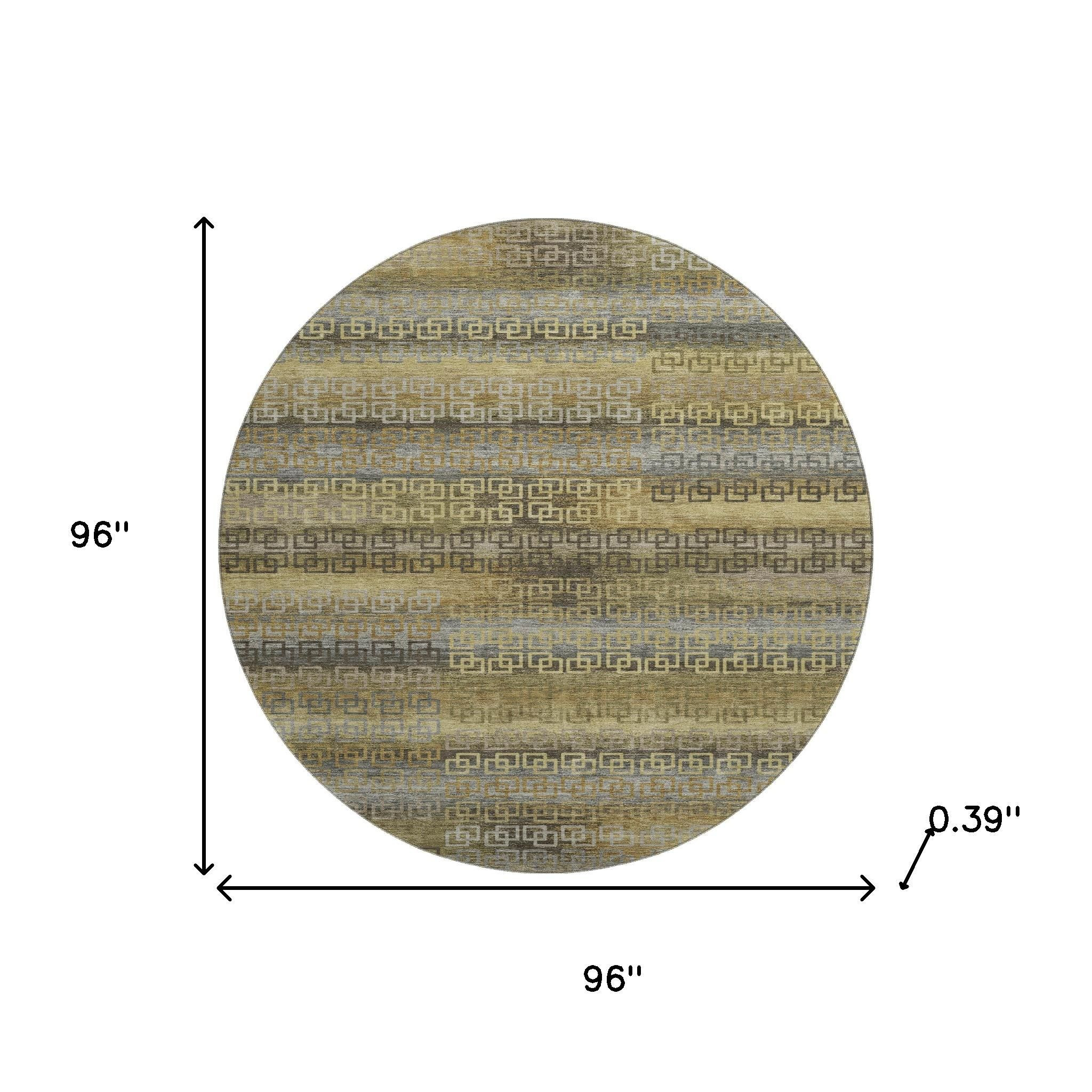 Add some artistry to your room with this 8-foot wheat and brown striped washable round rug with uv protection. Ideal for spaces with kids and pets, this rug is stain resistant to help repel dirt and spilled liquids. Built to last, this rug crafted from polyester fibers is known for its durability and long lasting appeal. Rugs are a great way to showcase your style, hide imperfections, warm your home and reduce noise. This larger sized, transitional styled rug is ready to create a focal point or statement piece in your room. 96.00-inch h x 96.00-inch w x 0.39-inch d.