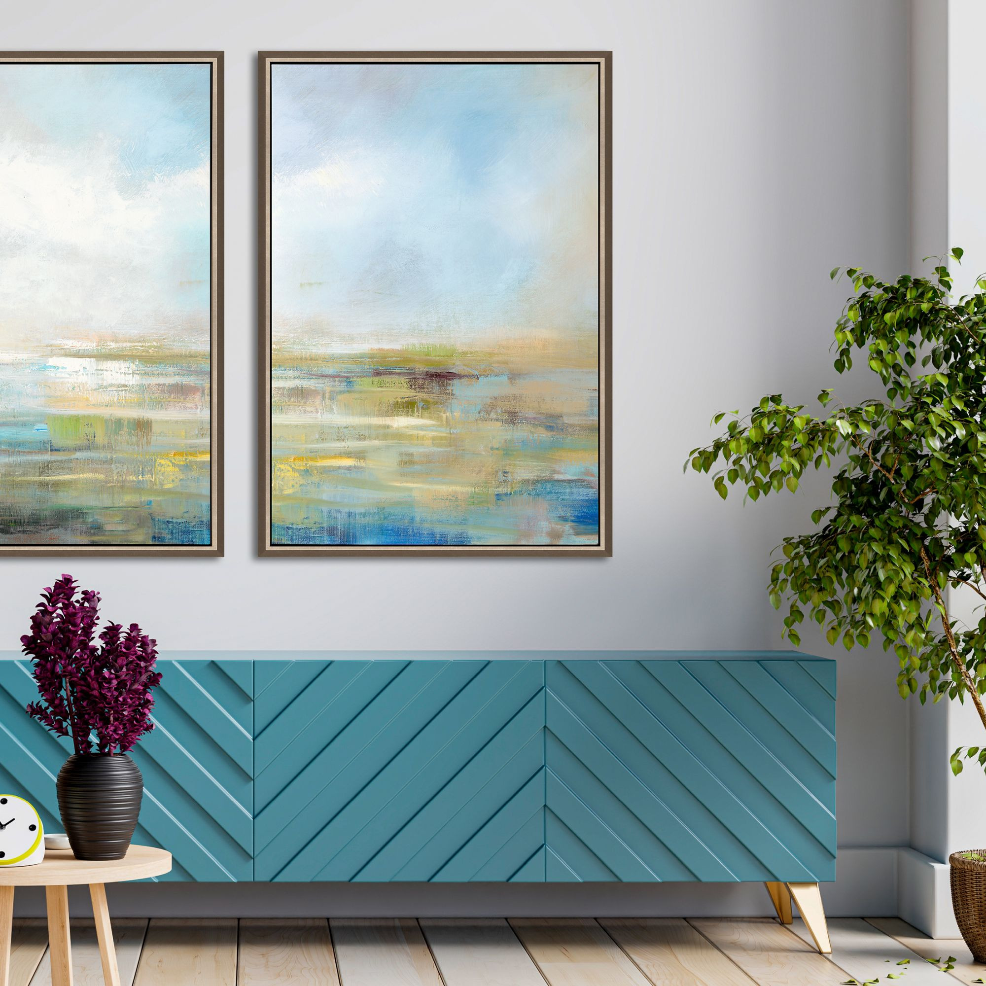 The horizon ii silver floater frame wall art is the perfect decorative accessory for your home. This block print is a way to express your artistic style and add some fashion to your walls. Reproduced for you on canvas, this hanging decorative accent will be a trendy and fashionable way to dress your walls. Adding this hanging wall art to your space to make your room feel more finished and attractive. Instantly liven up your space with this art that brings color and dimension to your walls. 57.00-inch h x 39.00-inch w x 3.00-inch d.