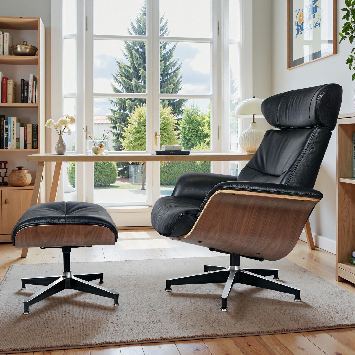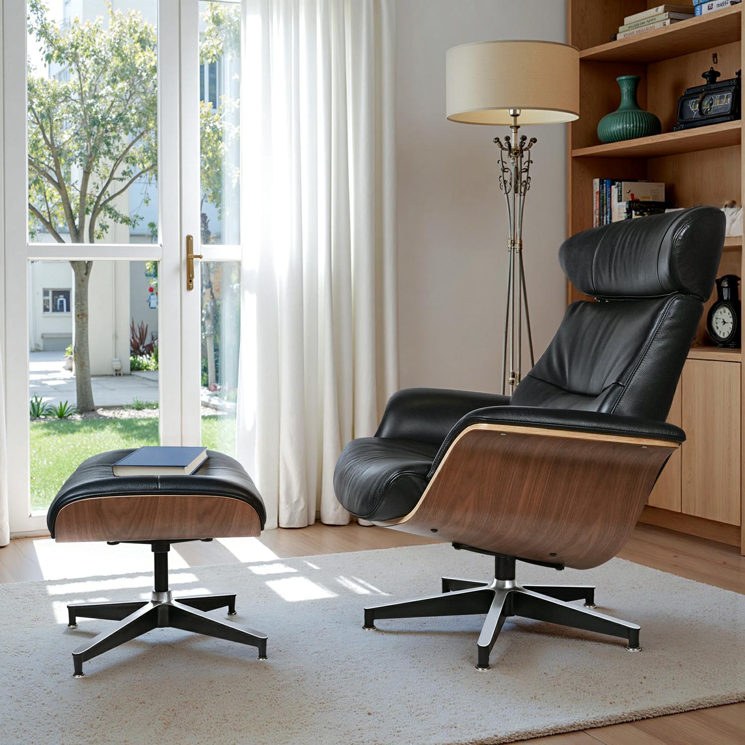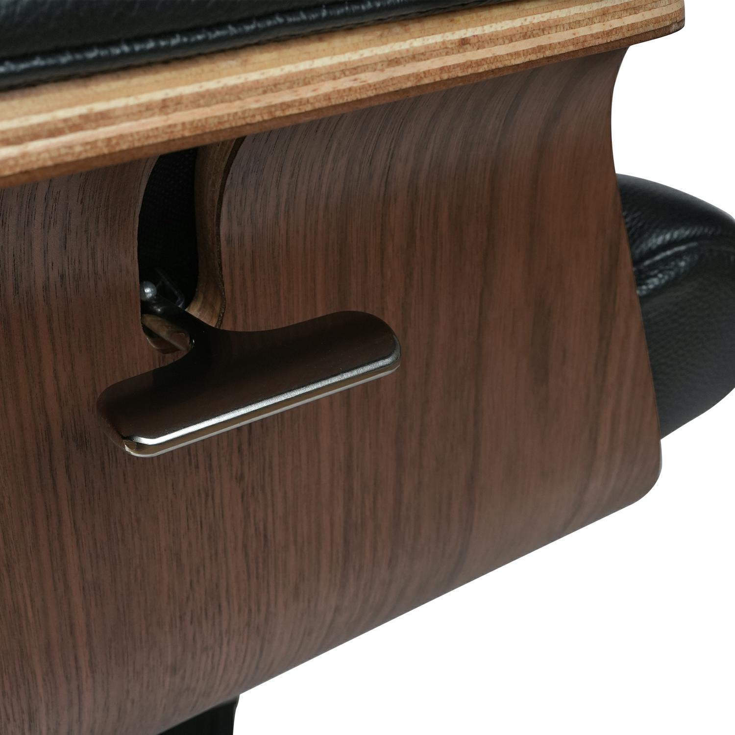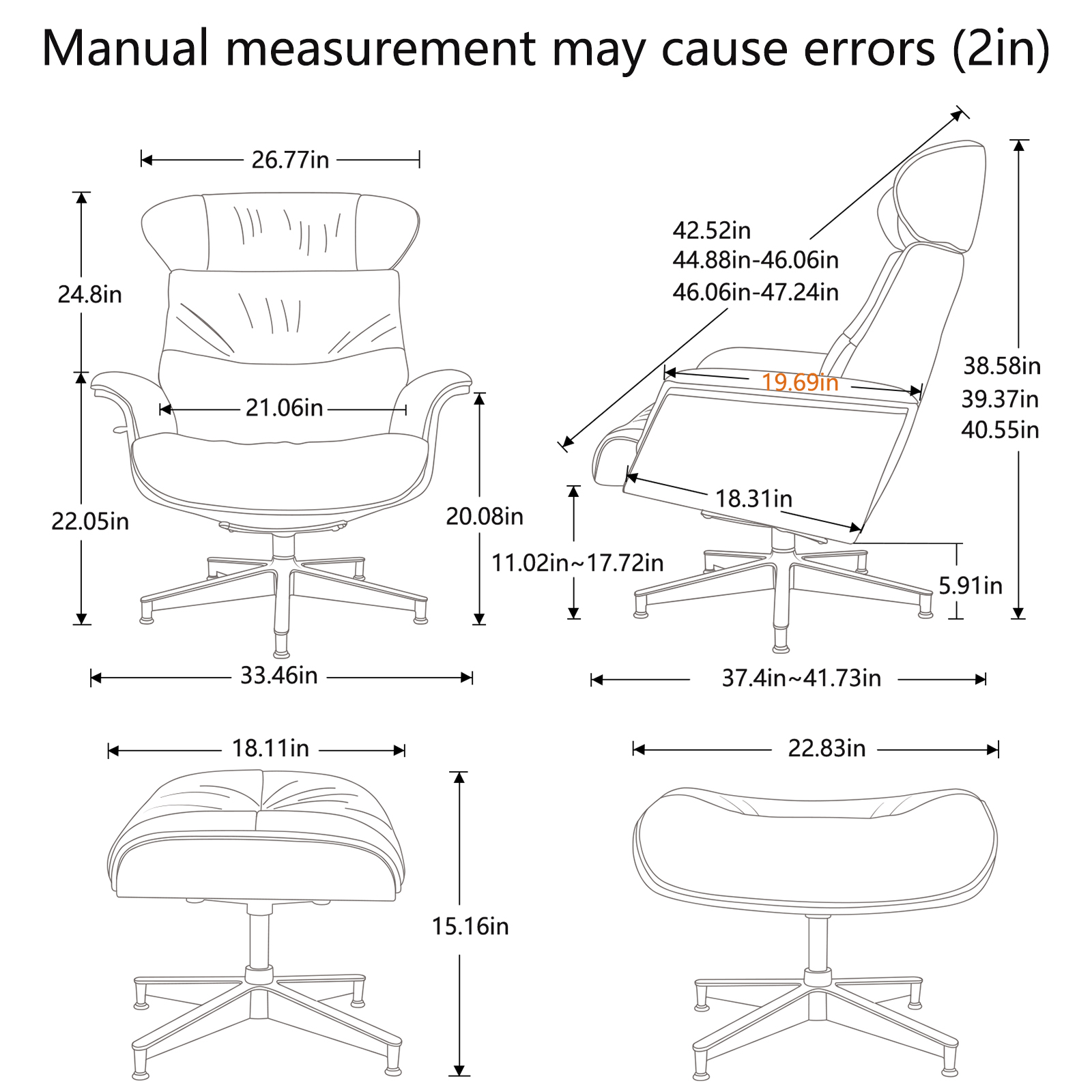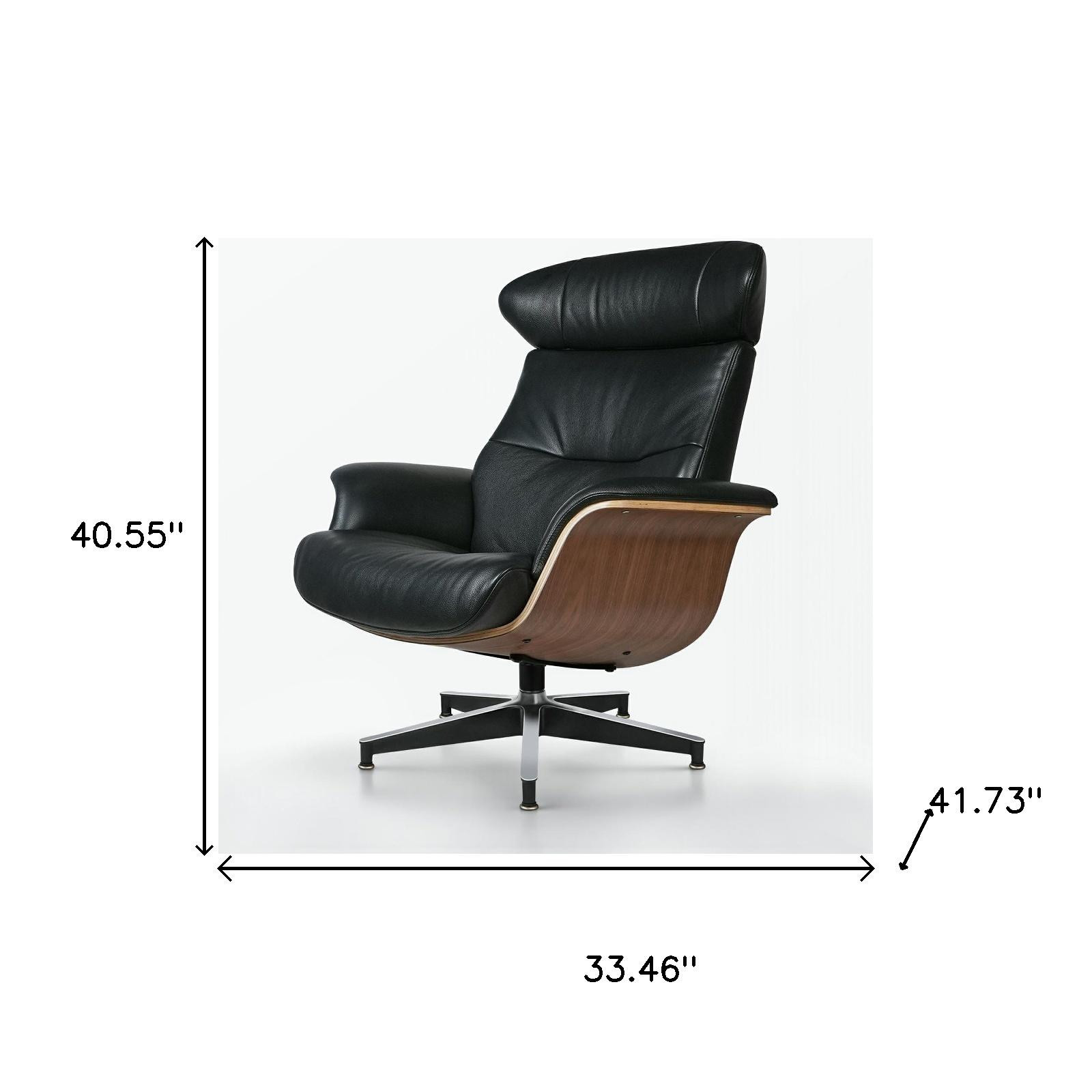 Fill your living room, bedroom, or office with fashionable seating options with this 33-inch black and walnut leather and wood swivel lounge chair with ottoman. This gorgeous lounge chair is masterfully upholstered in durable, heavy stitched tufted genuine leather. The high quality grainy brown faux wood MDF and stainless steel frame flaunts convenient armrests and a fixed back that are complimented by soft and comfortable cushioning. Featuring an adjustable headrest, a manual recline option, and swivel, this versatile lounge chair has lots of bells and whistles to keep your rested and relaxed. Comes complete with a coordinating ottoman to rest your feet. The ottoman can also be used as additional seating option if needed. 40.55-inch h x 33.46-inch w x 41.73-inch d.