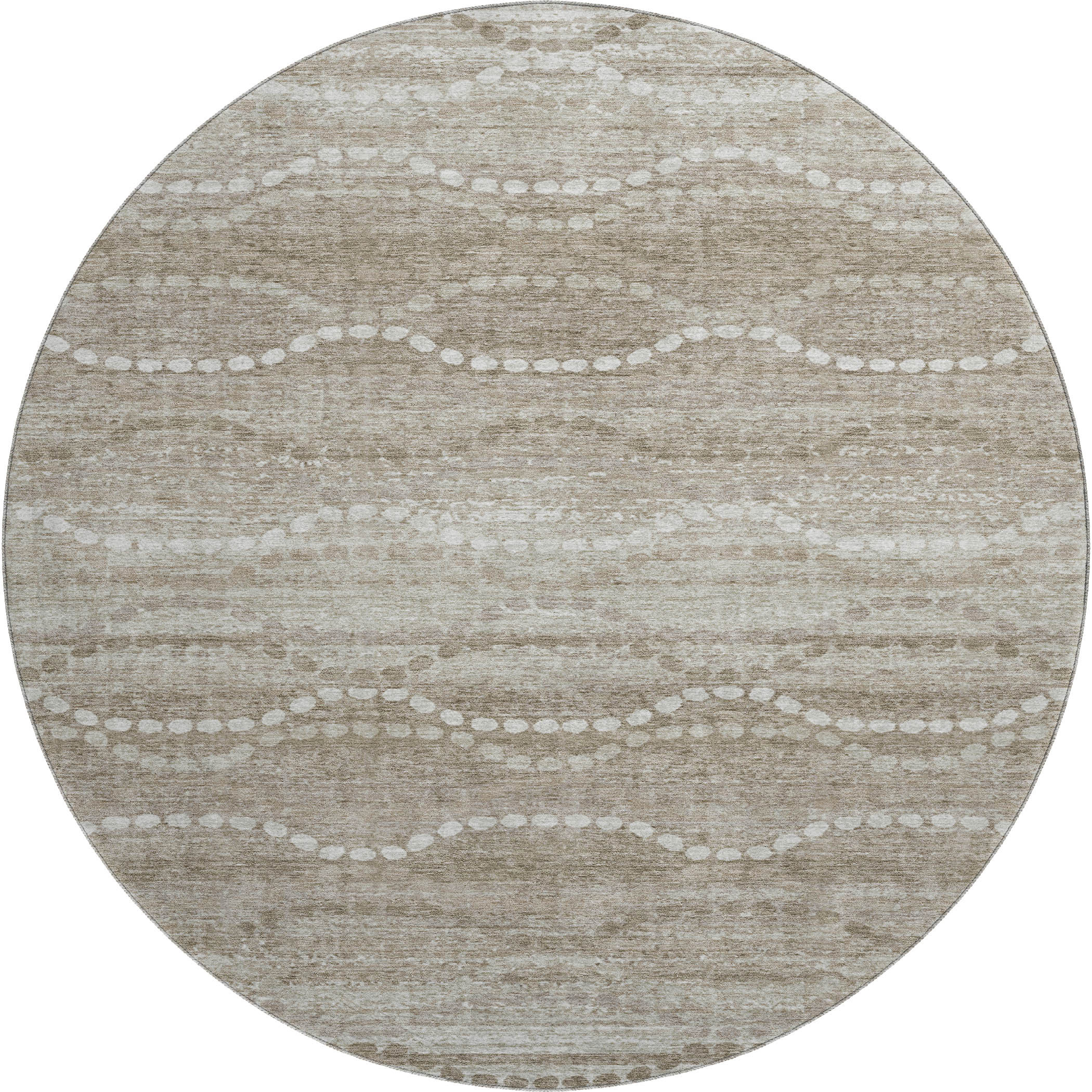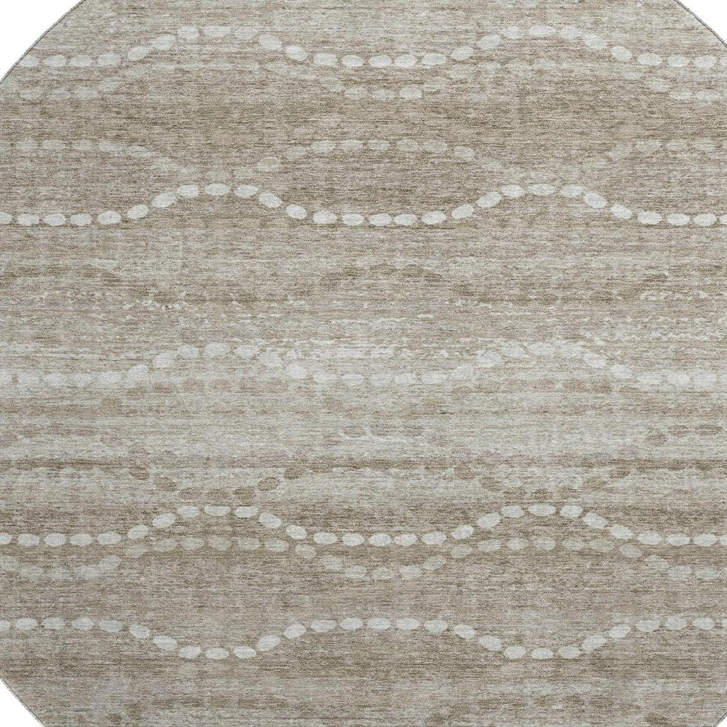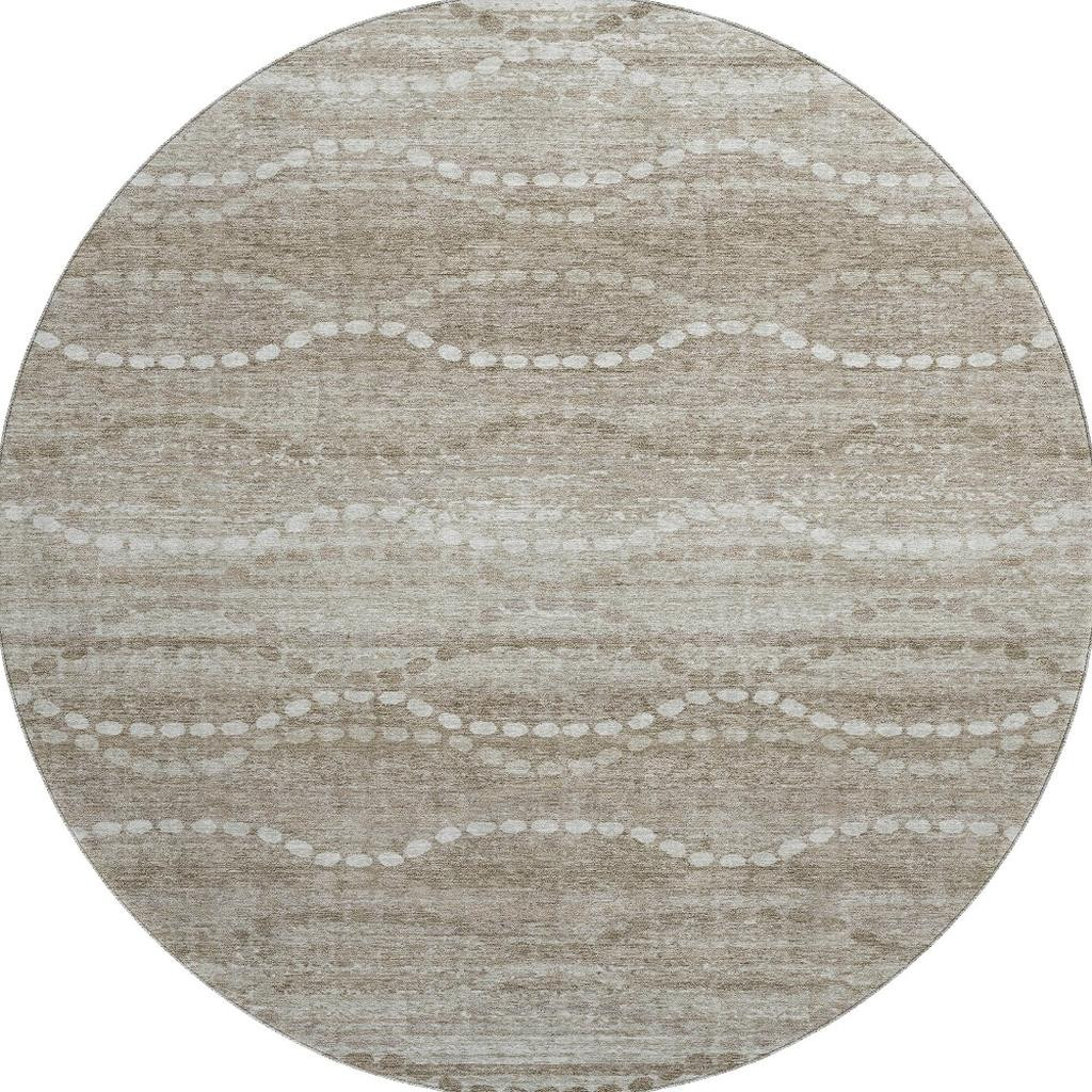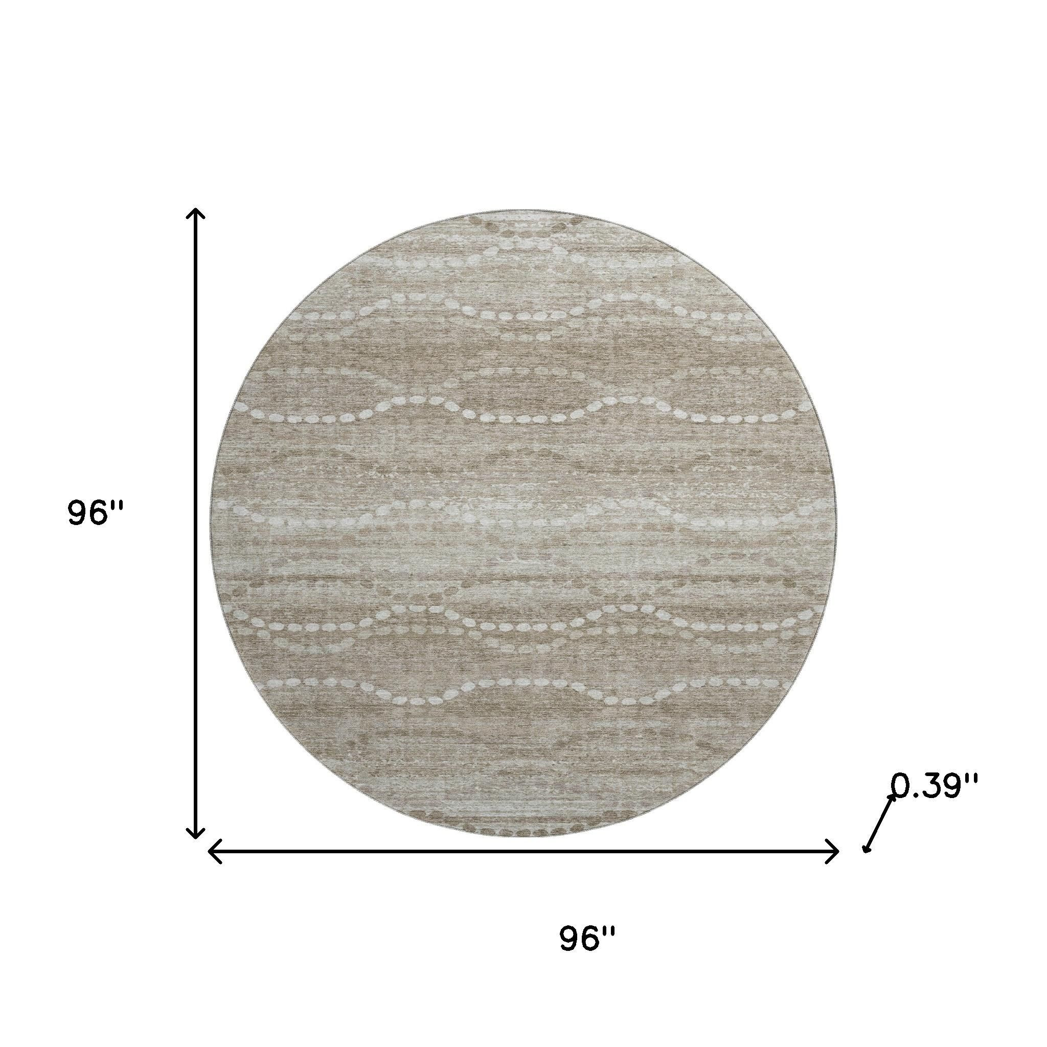 Add some artistry to your room with this 8-foot khaki and ivory abstract geometric washable round rug with uv protection. Ideal for spaces with kids and pets, this rug is stain resistant to help repel dirt and spilled liquids. Built to last, this rug crafted from polyester fibers is known for its durability and long lasting appeal. Rugs are a great way to showcase your style, hide imperfections, warm your home and reduce noise. This larger sized, transitional styled rug is ready to create a focal point or statement piece in your room. 96.00-inch h x 96.00-inch w x 0.39-inch d.