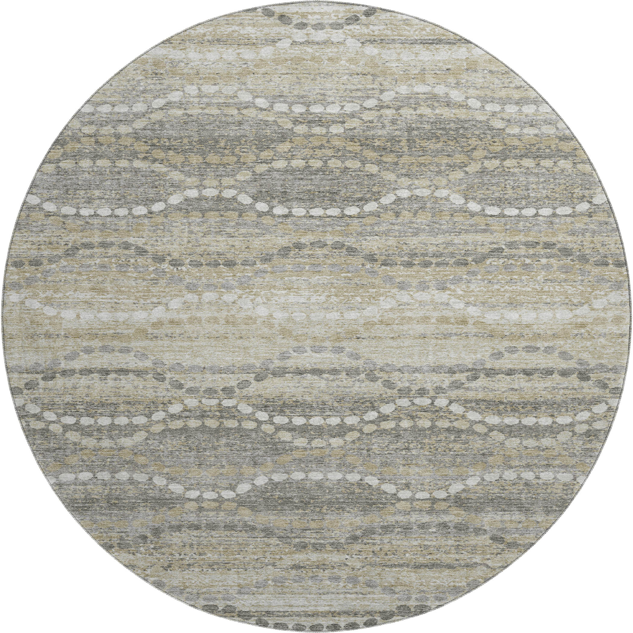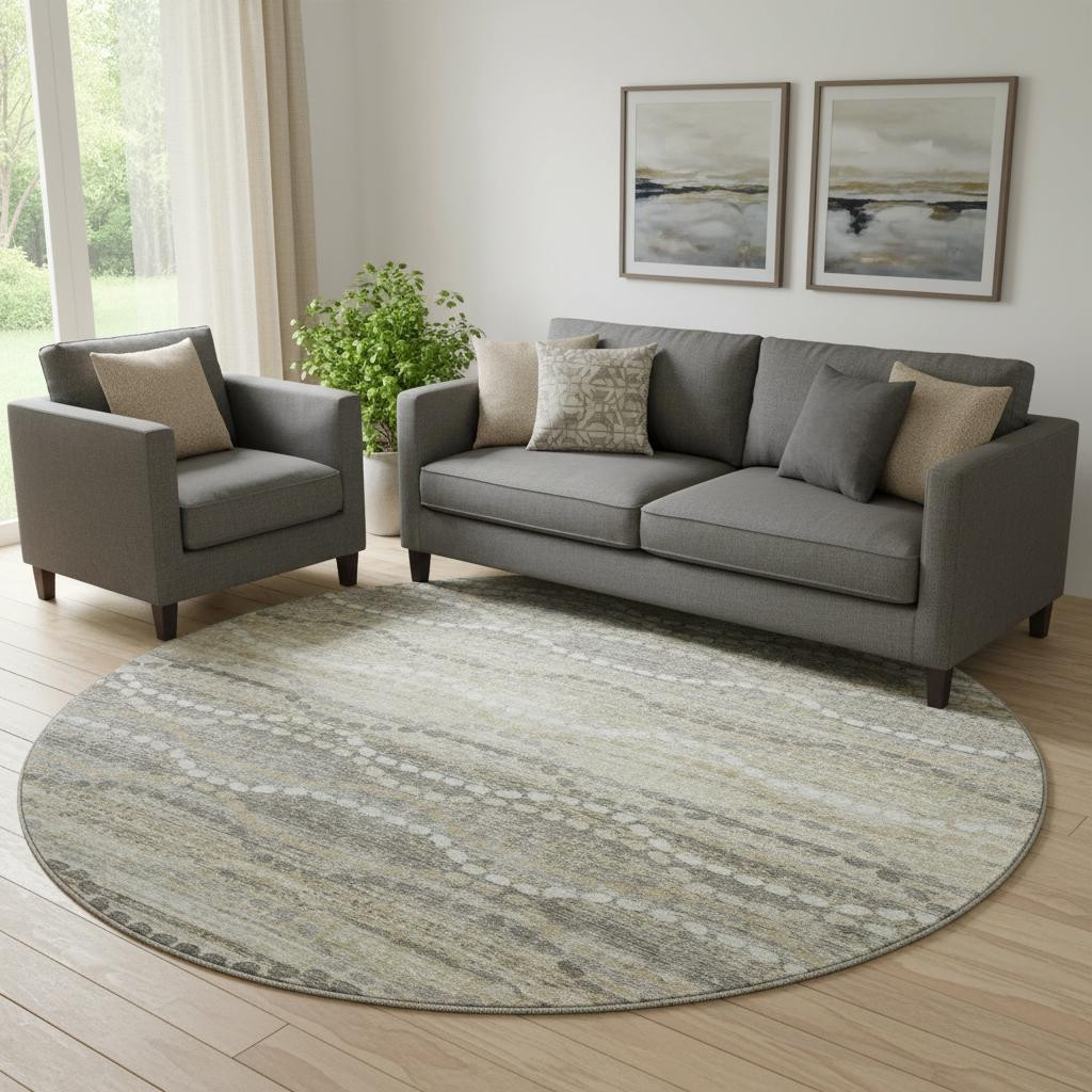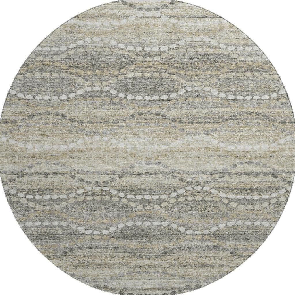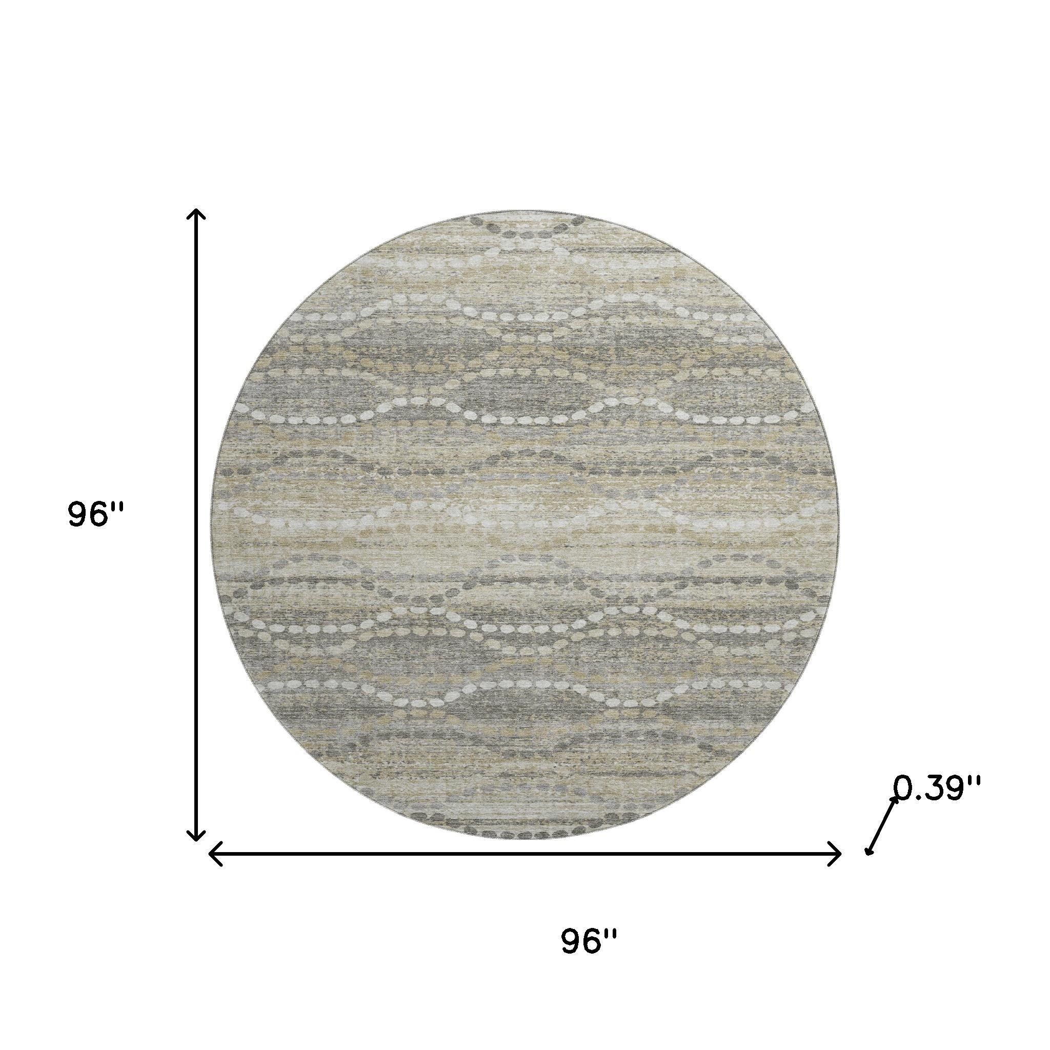 Add great coloration and comfortable texture to your space with this 8-foot pewter and ivory abstract geometric washable round rug with uv protection. Ideal for spaces with kids and pets, this rug is stain resistant to help repel dirt and spilled liquids. Built to last, this rug crafted from polyester fibers is known for its durability and long lasting appeal. Rugs are a great way to showcase your style, hide imperfections, warm your home and reduce noise. This larger sized, transitional styled rug is ready to create a focal point or statement piece in your room. 96.00-inch h x 96.00-inch w x 0.39-inch d.