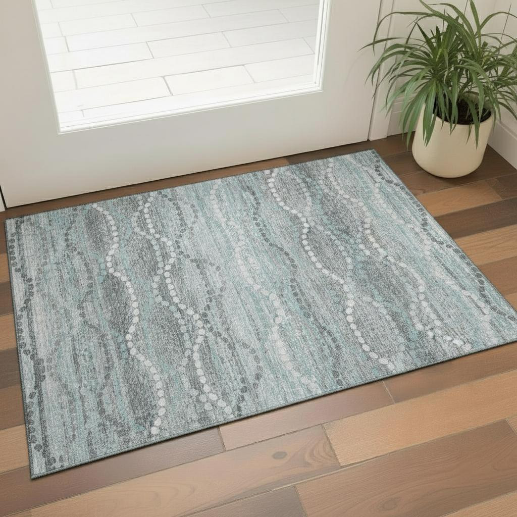 Set an inviting tone in your space with this 3-foot x 5-foot teal and ivory abstract geometric washable area rug with uv protection. Ideal for spaces with kids and pets, this rug is stain resistant to help repel dirt and spilled liquids. Built to last, this rug crafted from polyester fibers is known for its durability and long lasting appeal. Rugs are a great way to showcase your style, hide imperfections, warm your home and reduce noise. This smaller sized, transitional styled rug is just what you need for your walkway, bedside, in front of door, cabinet, refrigerator, or chair. 36.00-inch h x 60.00-inch w x 0.39-inch d.