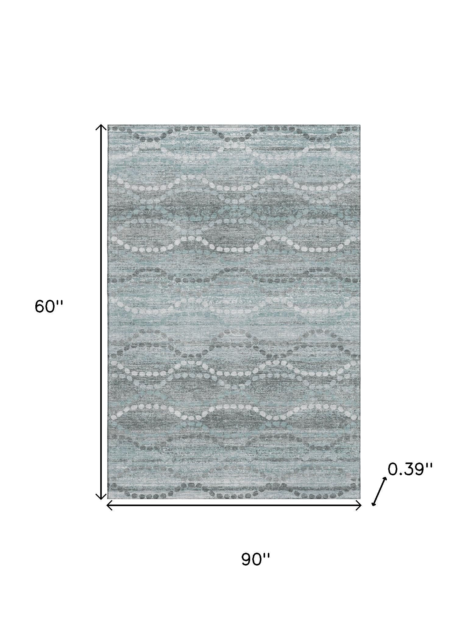 Add some artistry to your room with this 5-foot x 8-foot teal and ivory abstract geometric washable area rug with uv protection. Ideal for spaces with kids and pets, this rug is stain resistant to help repel dirt and spilled liquids. Built to last, this rug crafted from polyester fibers is known for its durability and long lasting appeal. Rugs are a great way to showcase your style, hide imperfections, warm your home and reduce noise. This larger sized, transitional styled rug is ready to create a focal point or statement piece in your room. 60.00-inch h x 90.00-inch w x 0.39-inch d.