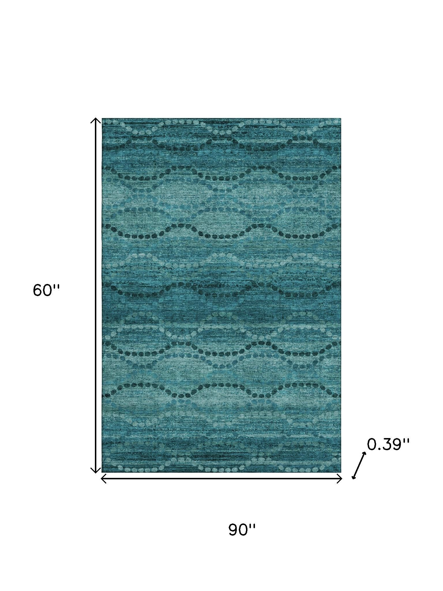 Add some artistry to your room with this 5-foot x 8-foot turquoise and aqua abstract geometric washable area rug with uv protection. Ideal for spaces with kids and pets, this rug is stain resistant to help repel dirt and spilled liquids. Built to last, this rug crafted from polyester fibers is known for its durability and long lasting appeal. Rugs are a great way to showcase your style, hide imperfections, warm your home and reduce noise. This larger sized, transitional styled rug is ready to create a focal point or statement piece in your room. 60.00-inch h x 90.00-inch w x 0.39-inch d.