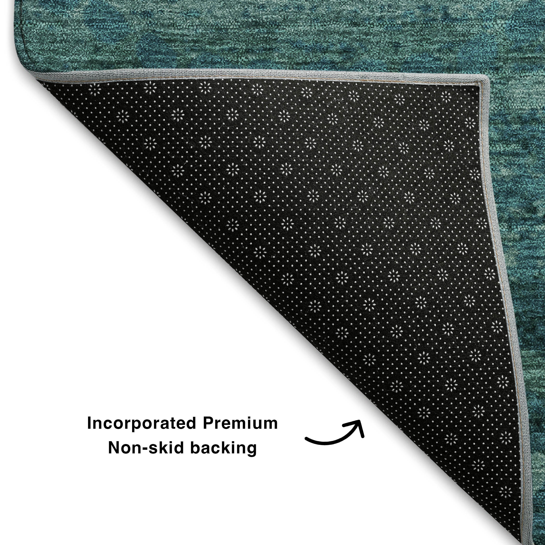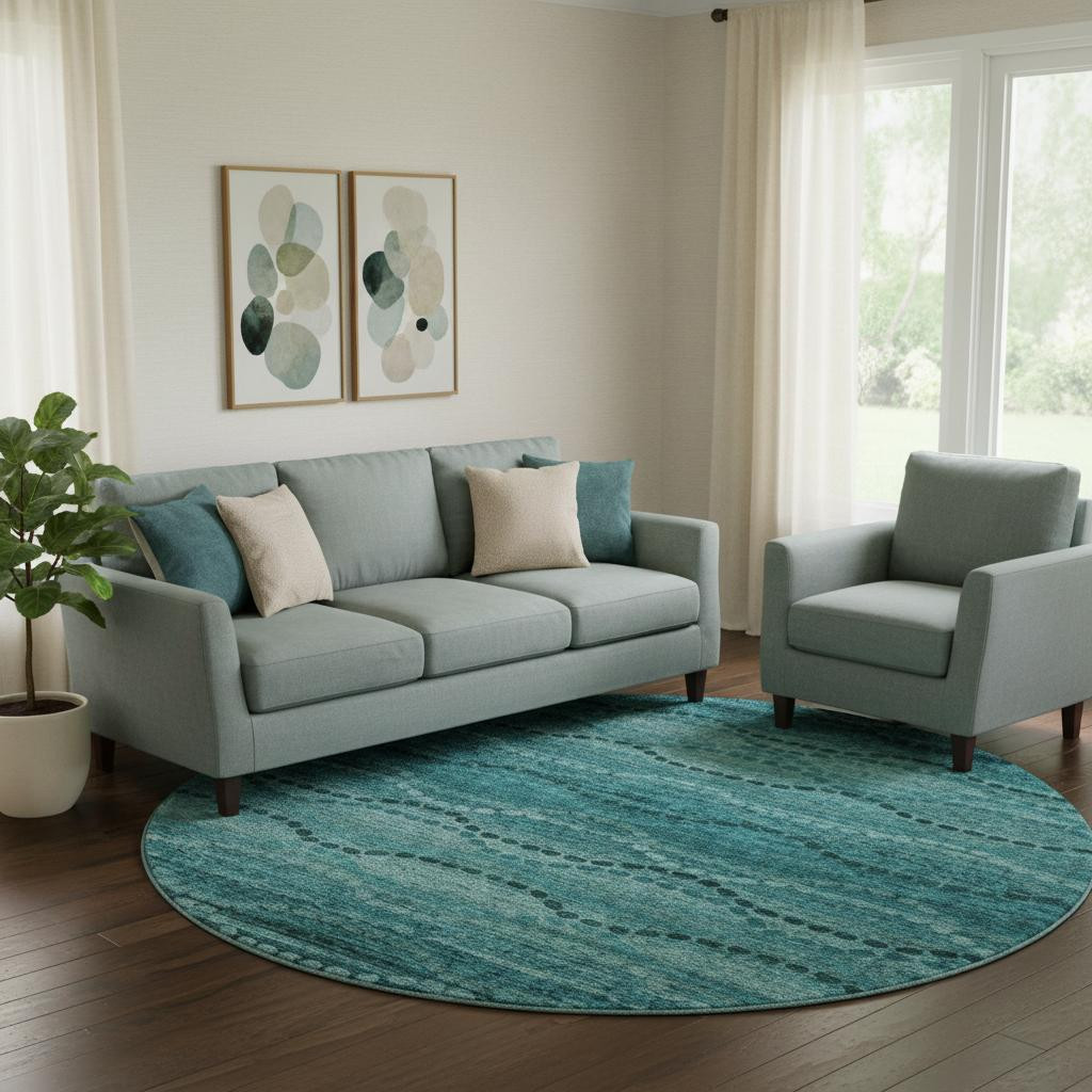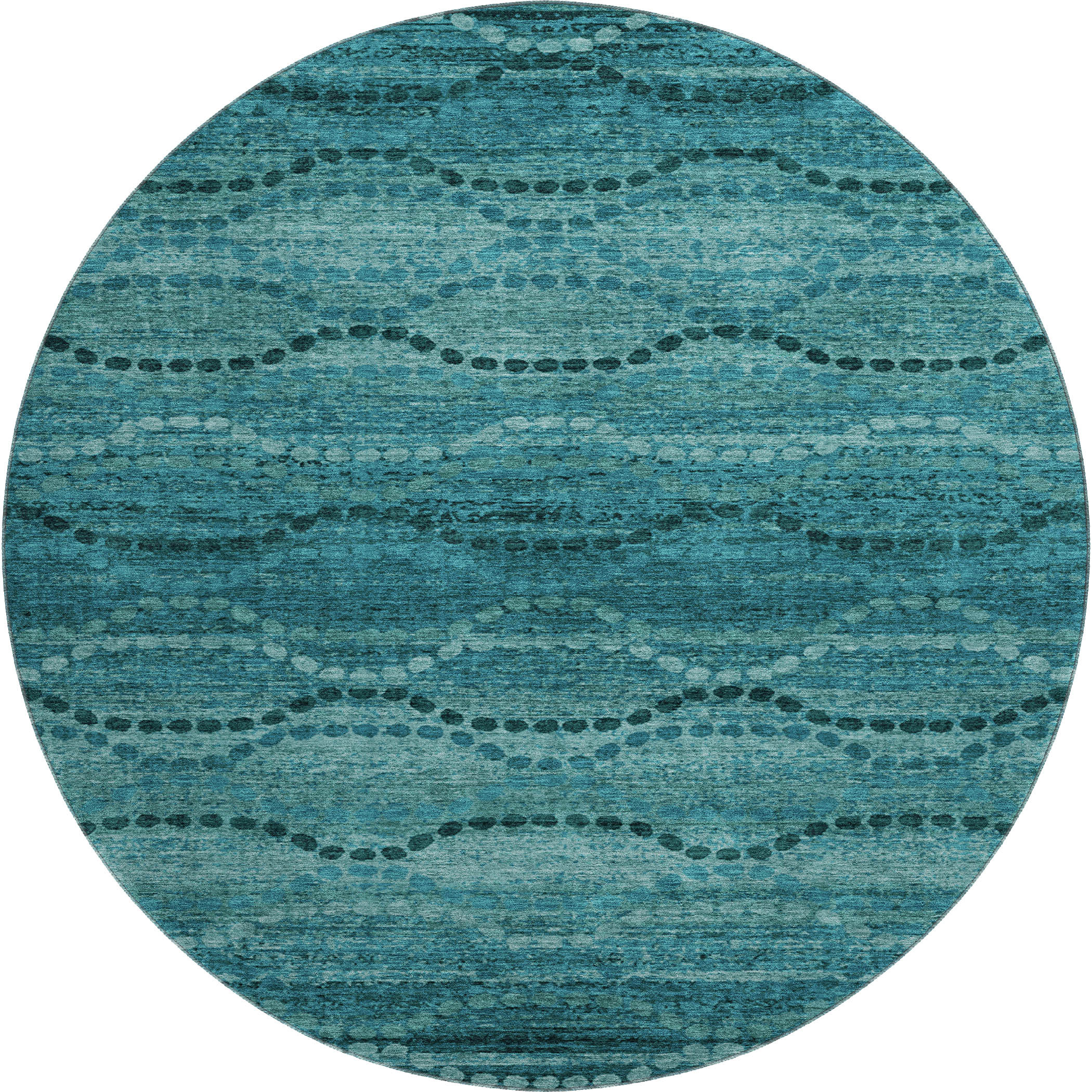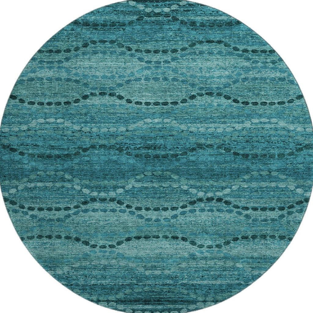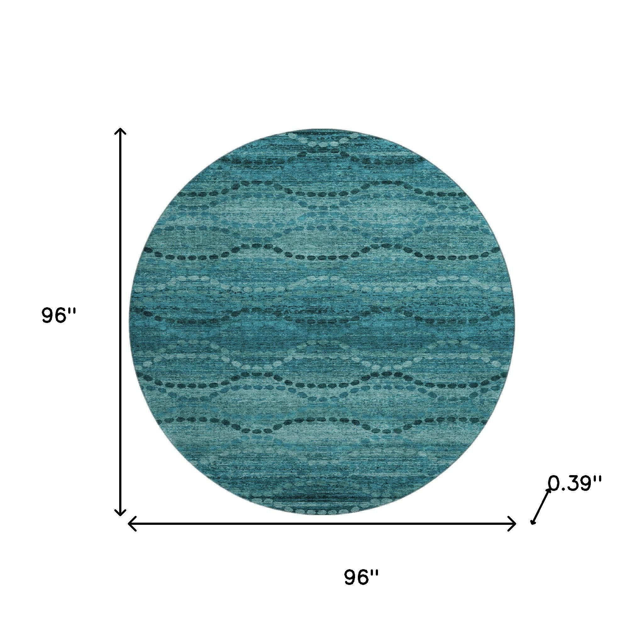 Add some artistry to your room with this 8-foot turquoise and aqua abstract geometric washable round rug with uv protection. Ideal for spaces with kids and pets, this rug is stain resistant to help repel dirt and spilled liquids. Built to last, this rug crafted from polyester fibers is known for its durability and long lasting appeal. Rugs are a great way to showcase your style, hide imperfections, warm your home and reduce noise. This larger sized, transitional styled rug is ready to create a focal point or statement piece in your room. 96.00-inch h x 96.00-inch w x 0.39-inch d.
