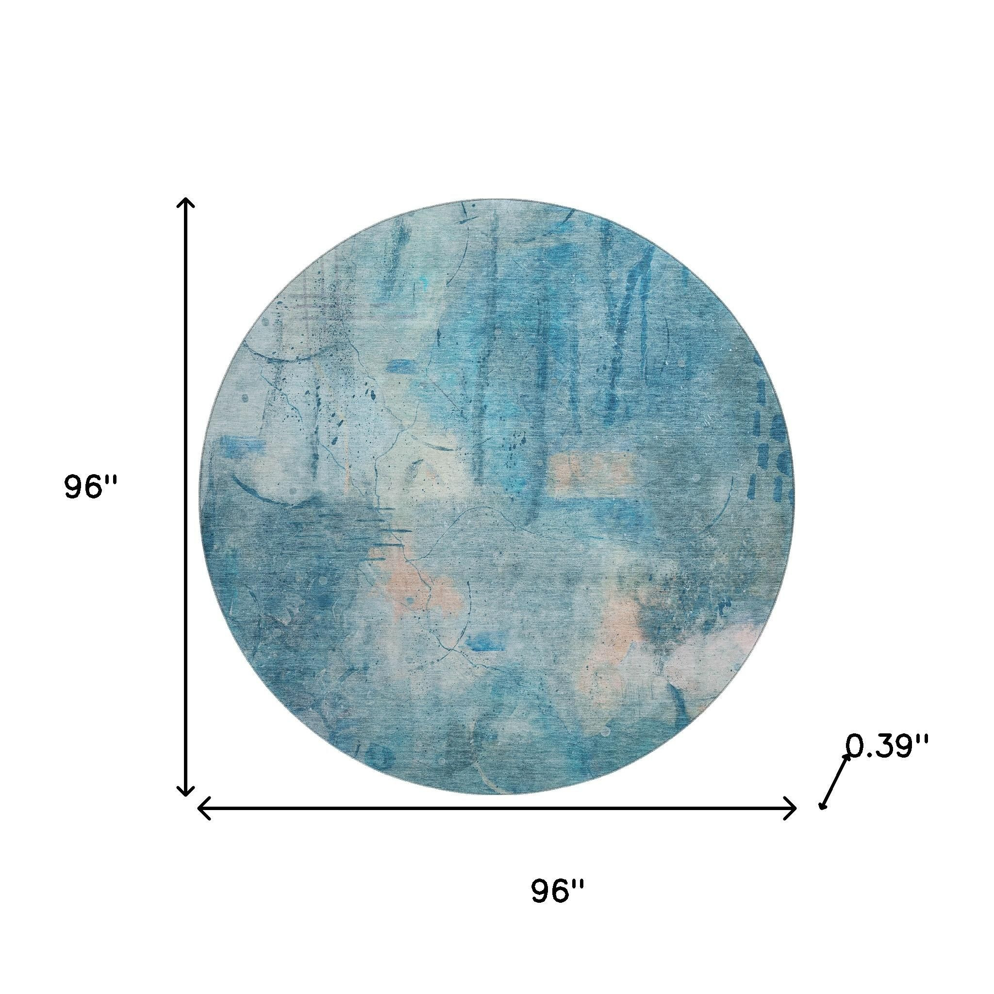 Set an inviting tone in your space with this 8-foot blue and beige abstract washable round rug with uv protection. Ideal for spaces with kids and pets, this rug is stain resistant to help repel dirt and spilled liquids. Built to last, this rug crafted from polyester fibers is known for its durability and long lasting appeal. Rugs are a great way to showcase your style, hide imperfections, warm your home and reduce noise. This larger sized, transitional styled rug is ready to create a focal point or statement piece in your room. 96.00-inch h x 96.00-inch w x 0.39-inch d.