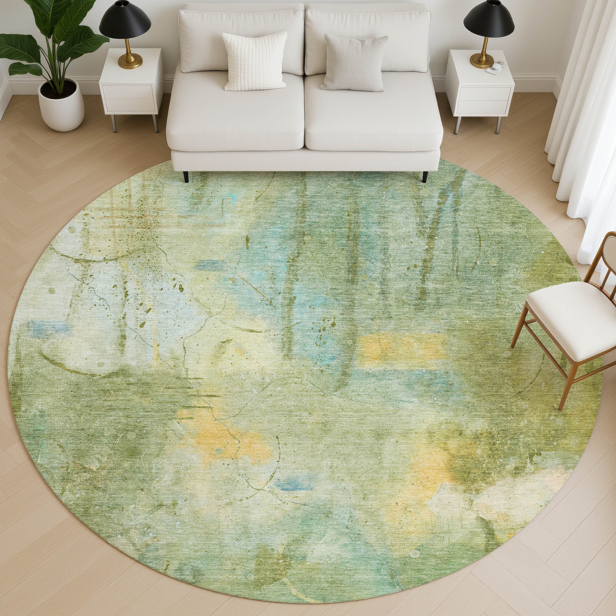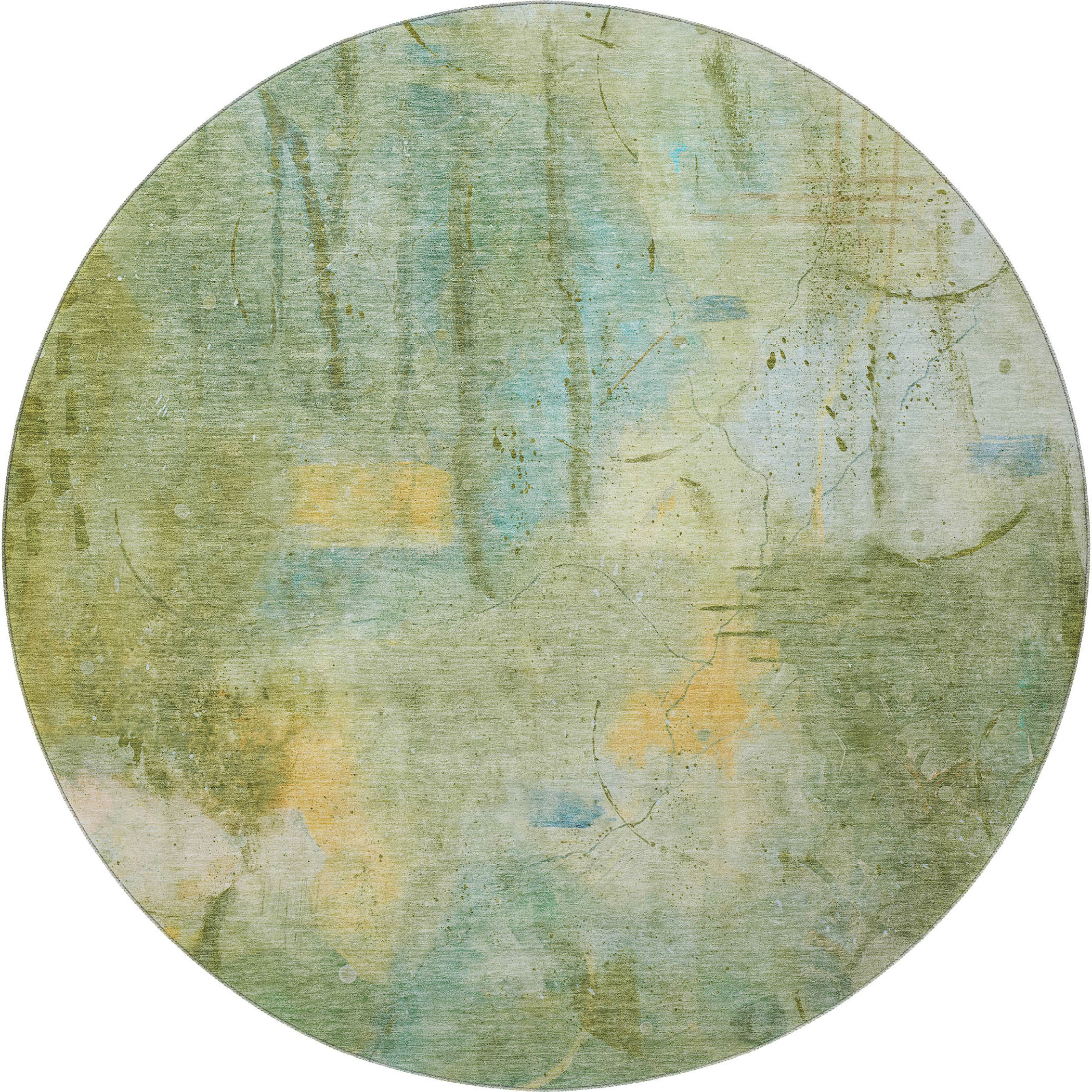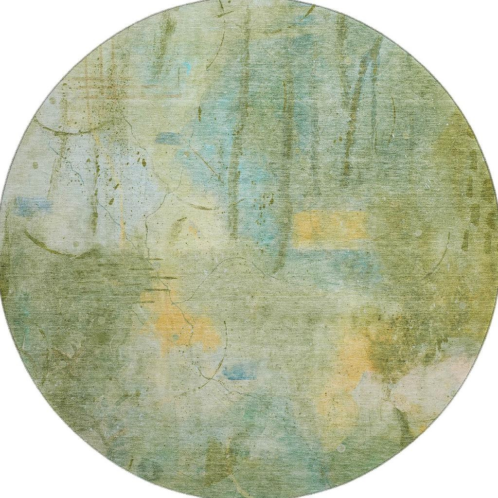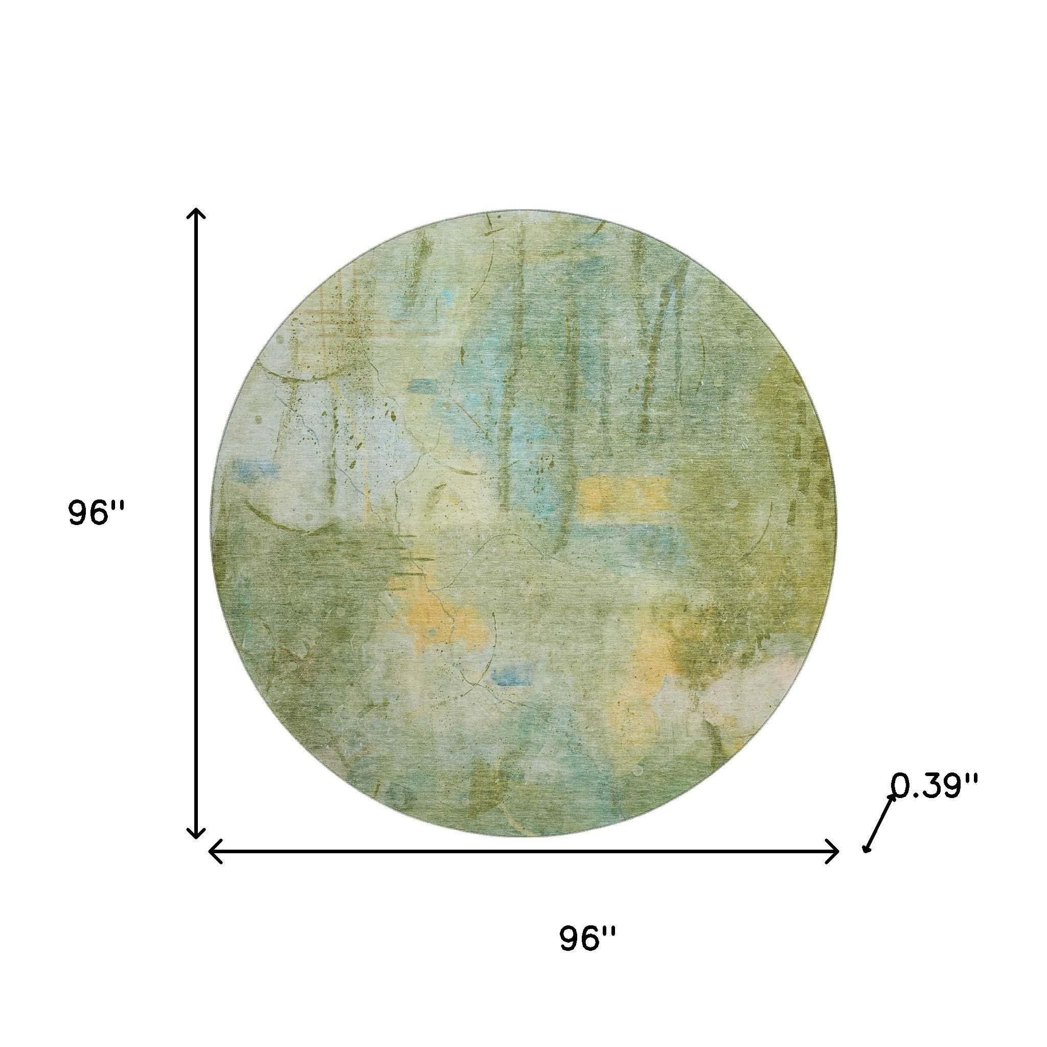 This 8-foot sage and teal abstract washable round rug with uv protection, is a great way to add warmth to a room. Ideal for spaces with kids and pets, this rug is stain resistant to help repel dirt and spilled liquids. Built to last, this rug crafted from polyester fibers is known for its durability and long lasting appeal. Rugs are a great way to showcase your style, hide imperfections, warm your home and reduce noise. This larger sized, transitional styled rug is ready to create a focal point or statement piece in your room. 96.00-inch h x 96.00-inch w x 0.39-inch d.