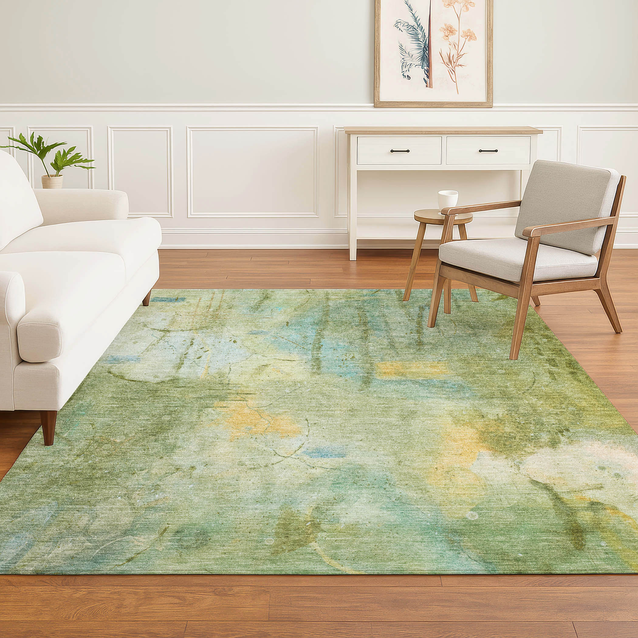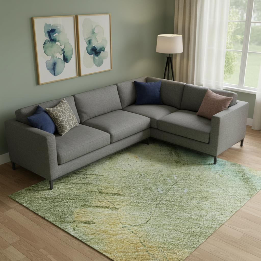 This 9-foot x 12-foot sage and teal abstract washable area rug with uv protection, is a great way to add warmth to a room. Ideal for spaces with kids and pets, this rug is stain resistant to help repel dirt and spilled liquids. Built to last, this rug crafted from polyester fibers is known for its durability and long lasting appeal. Rugs are a great way to showcase your style, hide imperfections, warm your home and reduce noise. This larger sized, transitional styled rug is ready to create a focal point or statement piece in your room. 108.00-inch h x 144.00-inch w x 0.39-inch d.