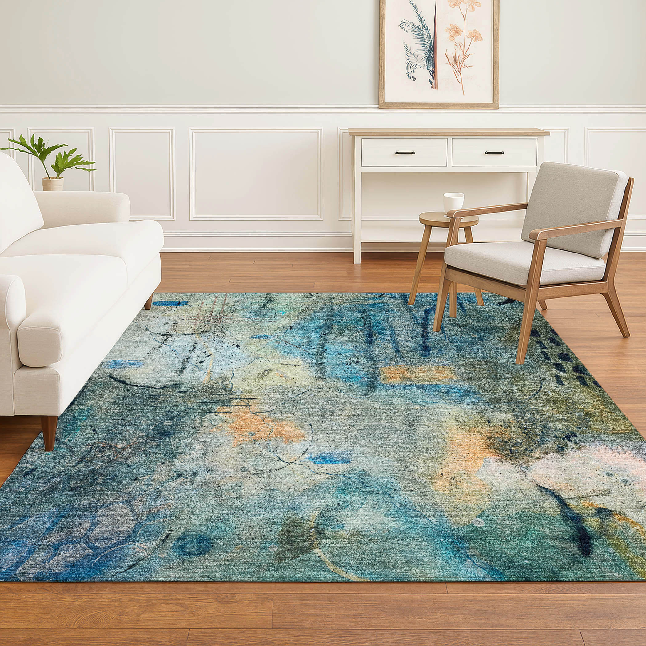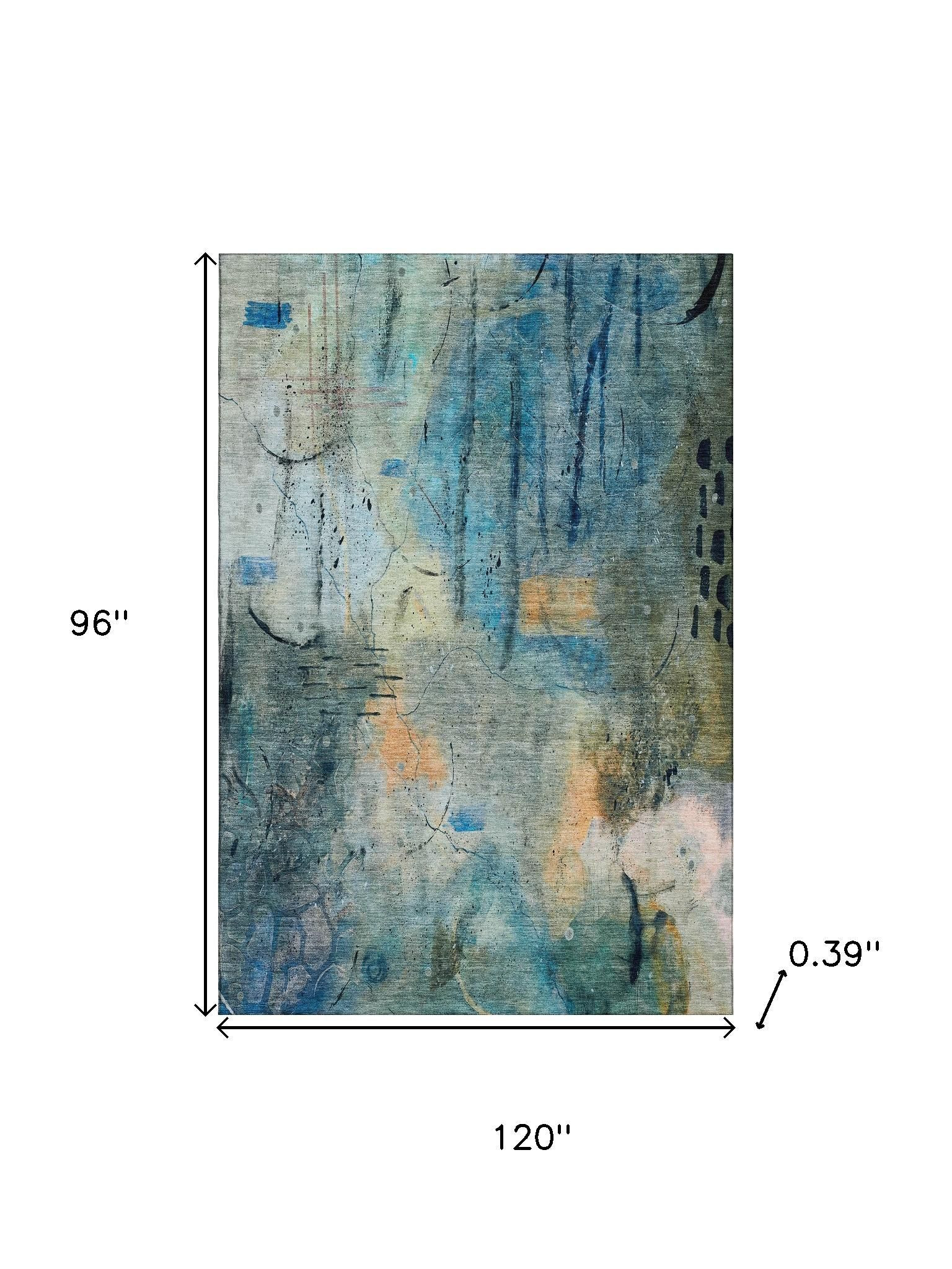 Add some artistry to your room with this 8-foot x 10-foot teal and green abstract washable area rug with uv protection. Ideal for spaces with kids and pets, this rug is stain resistant to help repel dirt and spilled liquids. Built to last, this rug crafted from polyester fibers is known for its durability and long lasting appeal. Rugs are a great way to showcase your style, hide imperfections, warm your home and reduce noise. This larger sized, transitional styled rug is ready to create a focal point or statement piece in your room. 96.00-inch h x 120.00-inch w x 0.39-inch d.