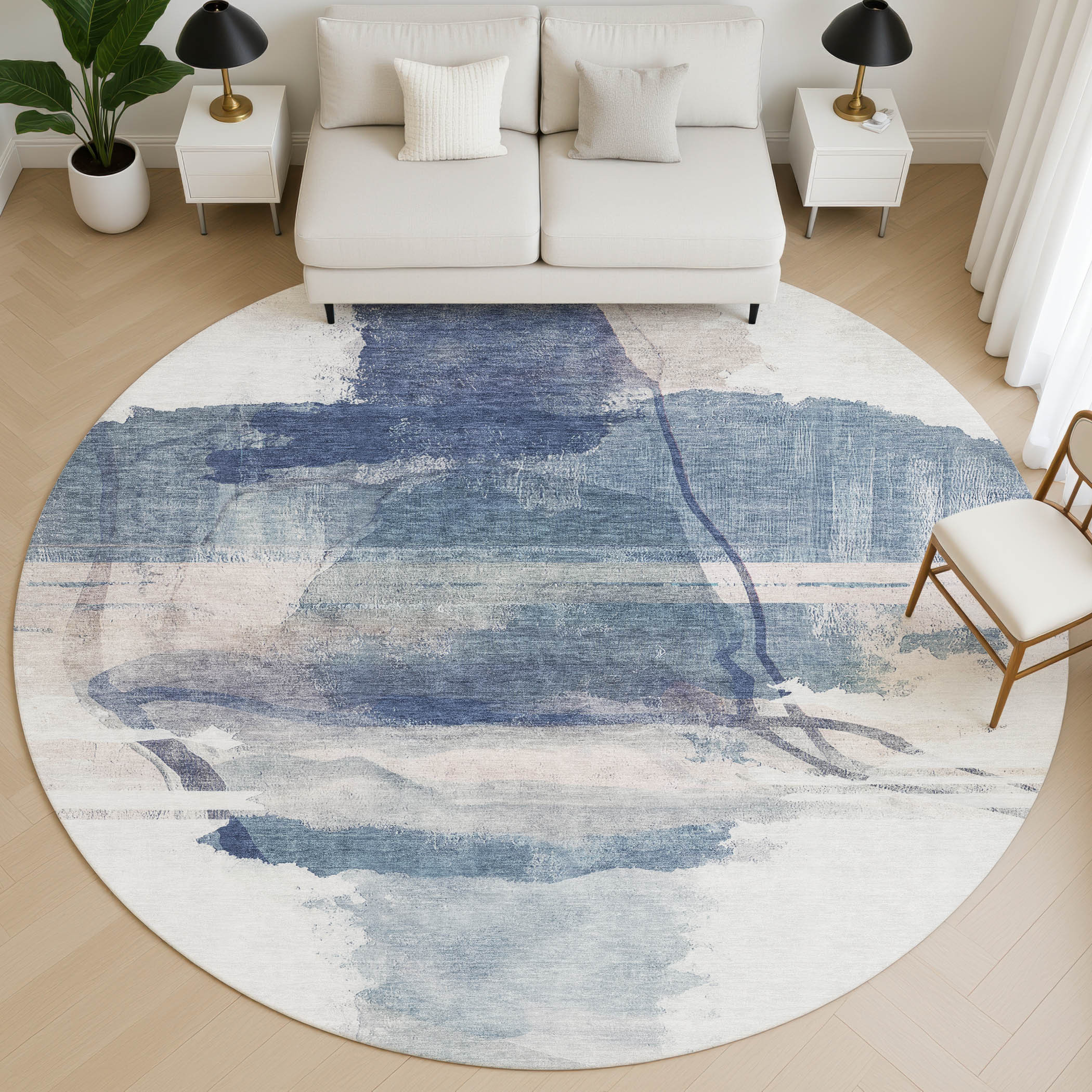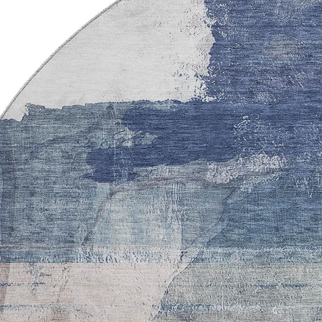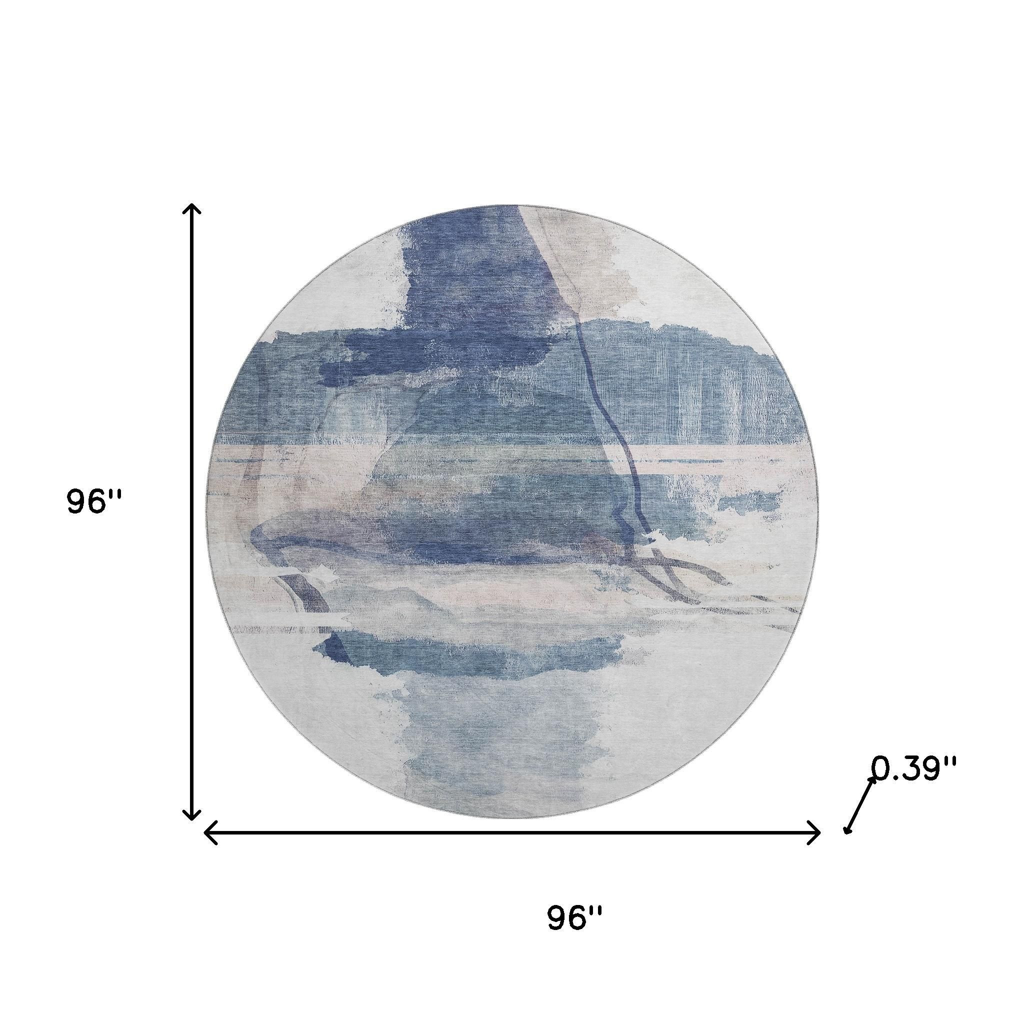 This 8-foot blue and ivory abstract washable round rug with uv protection, is a great way to add warmth to a room. Ideal for spaces with kids and pets, this rug is stain resistant to help repel dirt and spilled liquids. Built to last, this rug crafted from polyester fibers is known for its durability and long lasting appeal. Rugs are a great way to showcase your style, hide imperfections, warm your home and reduce noise. This larger sized, transitional styled rug is ready to create a focal point or statement piece in your room. 96.00-inch h x 96.00-inch w x 0.39-inch d.