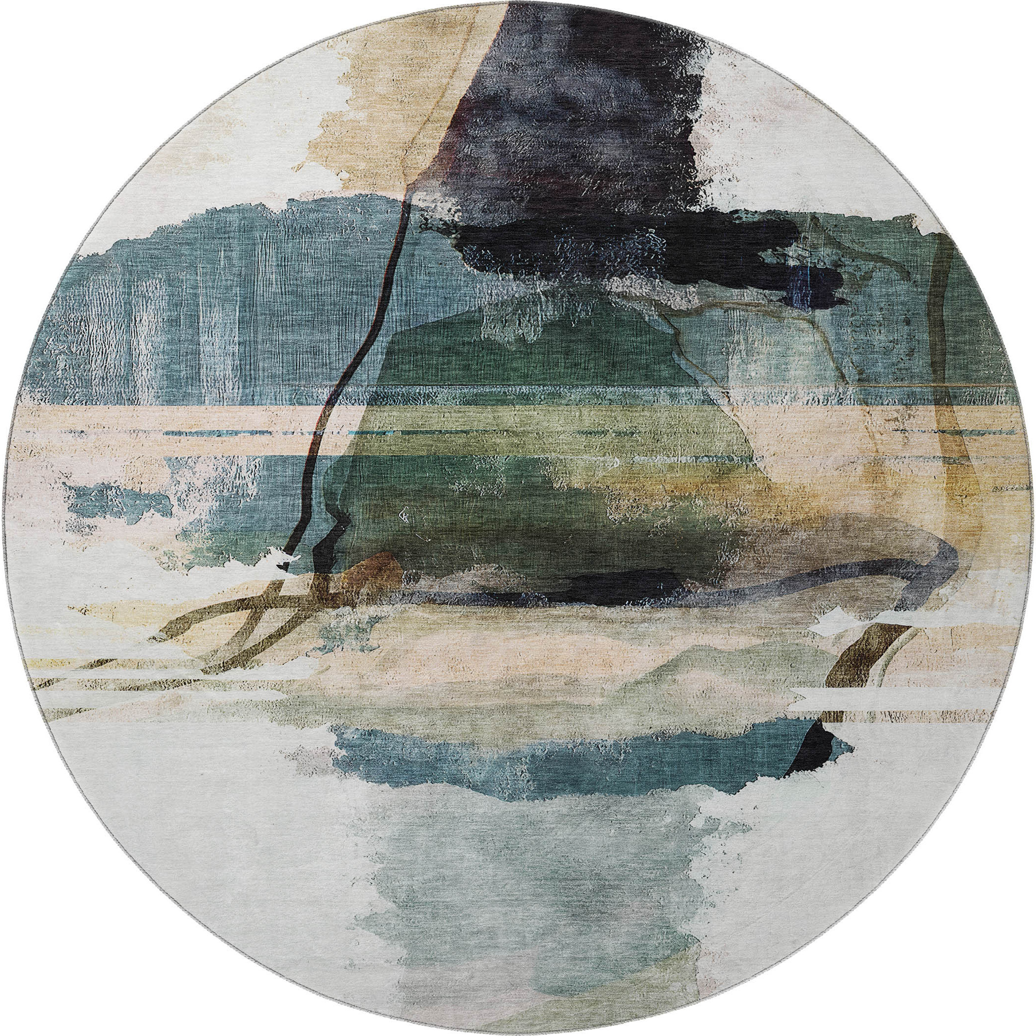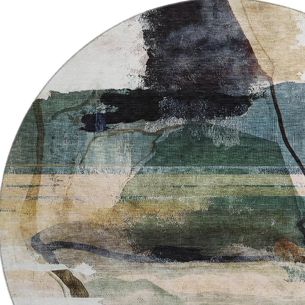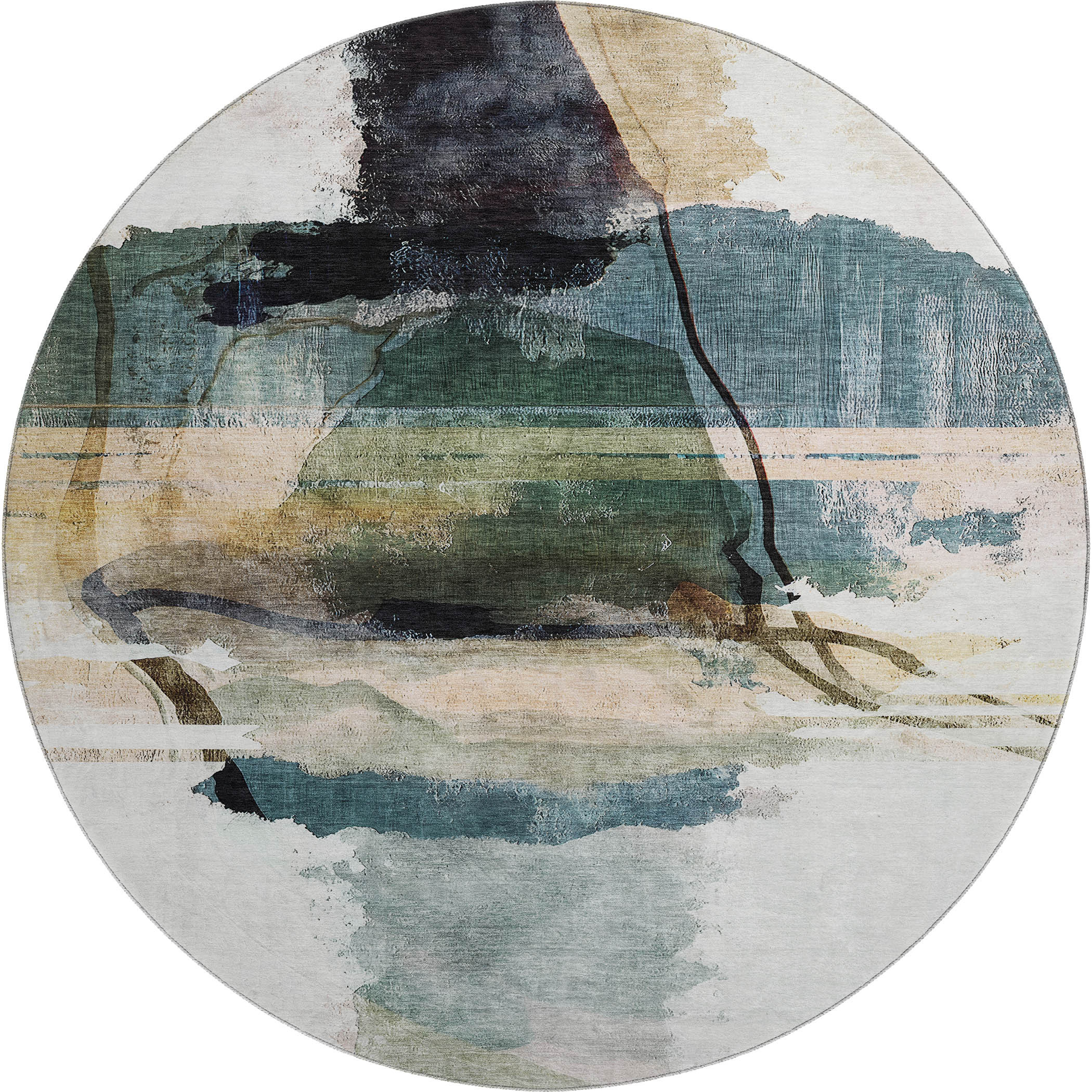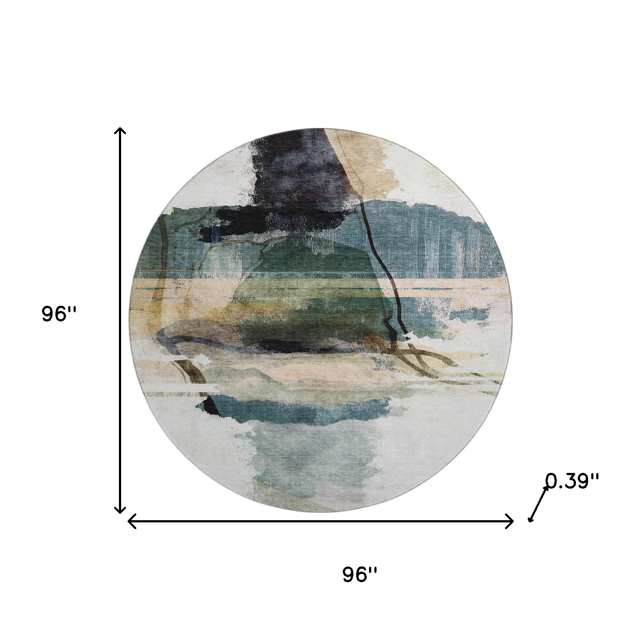 This 8-foot green and ivory abstract washable round rug with uv protection, is a great way to add warmth to a room. Ideal for spaces with kids and pets, this rug is stain resistant to help repel dirt and spilled liquids. Built to last, this rug crafted from polyester fibers is known for its durability and long lasting appeal. Rugs are a great way to showcase your style, hide imperfections, warm your home and reduce noise. This larger sized, transitional styled rug is ready to create a focal point or statement piece in your room. 96.00-inch h x 96.00-inch w x 0.39-inch d.