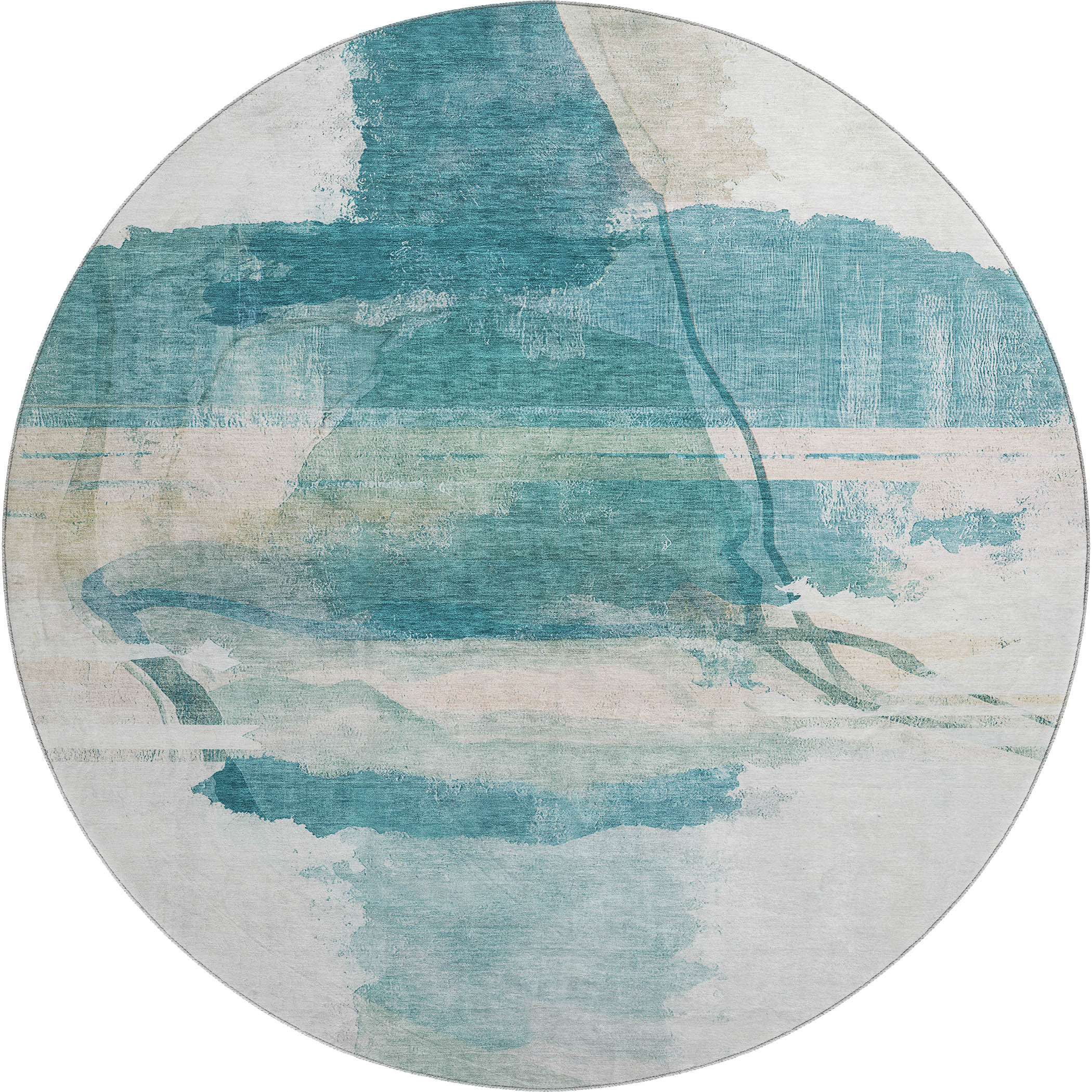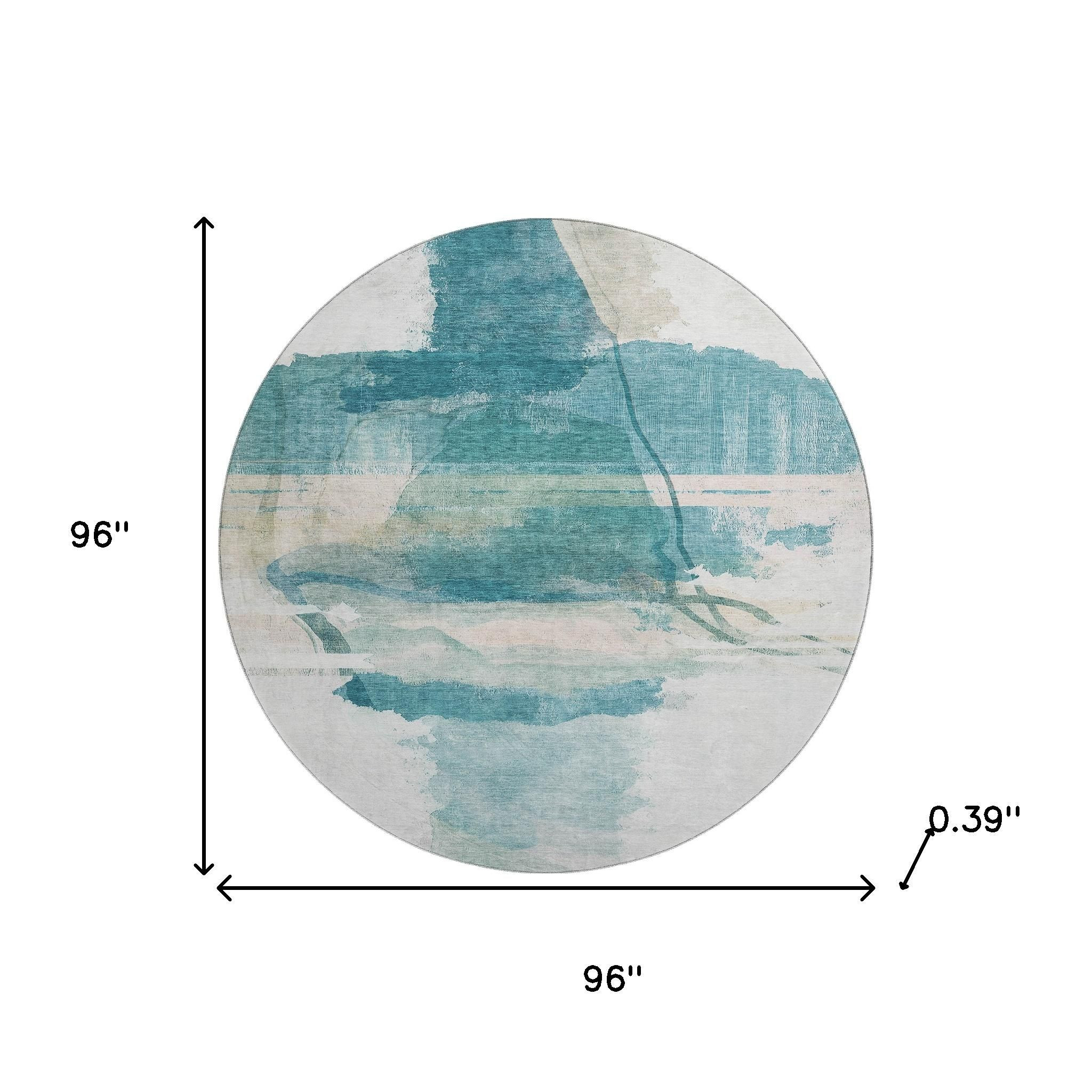 This 8-foot teal and ivory abstract washable round rug with uv protection, is a great way to add warmth to a room. Ideal for spaces with kids and pets, this rug is stain resistant to help repel dirt and spilled liquids. Built to last, this rug crafted from polyester fibers is known for its durability and long lasting appeal. Rugs are a great way to showcase your style, hide imperfections, warm your home and reduce noise. This larger sized, transitional styled rug is ready to create a focal point or statement piece in your room. 96.00-inch h x 96.00-inch w x 0.39-inch d.
