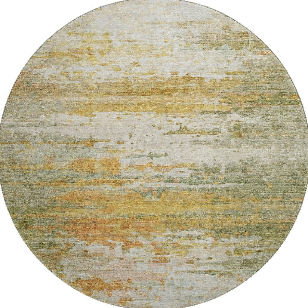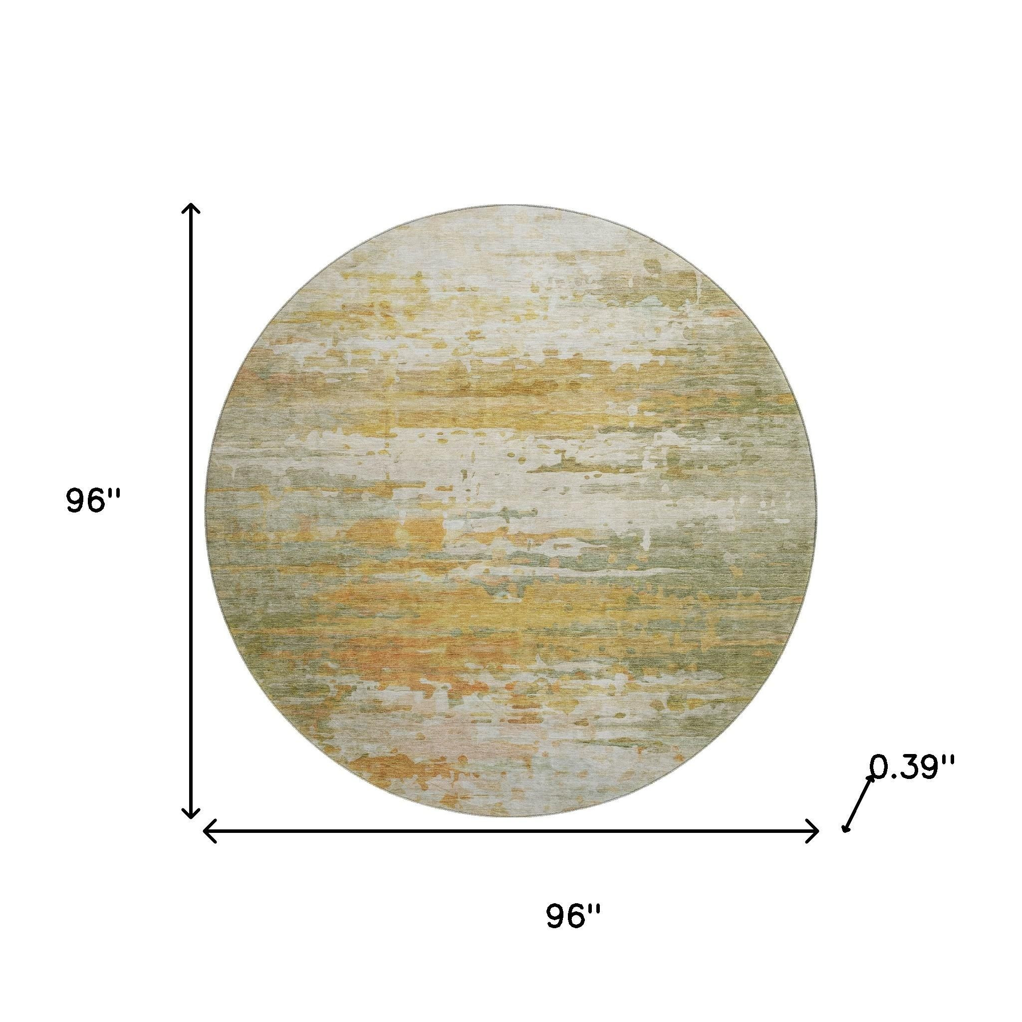This 8-foot sage and ivory abstract washable round rug with uv protection, is a great way to add warmth to a room. Ideal for spaces with kids and pets, this rug is stain resistant to help repel dirt and spilled liquids. Built to last, this rug crafted from polyester fibers is known for its durability and long lasting appeal. Rugs are a great way to showcase your style, hide imperfections, warm your home and reduce noise. This larger sized, transitional styled rug is ready to create a focal point or statement piece in your room. 96.00-inch h x 96.00-inch w x 0.39-inch d.