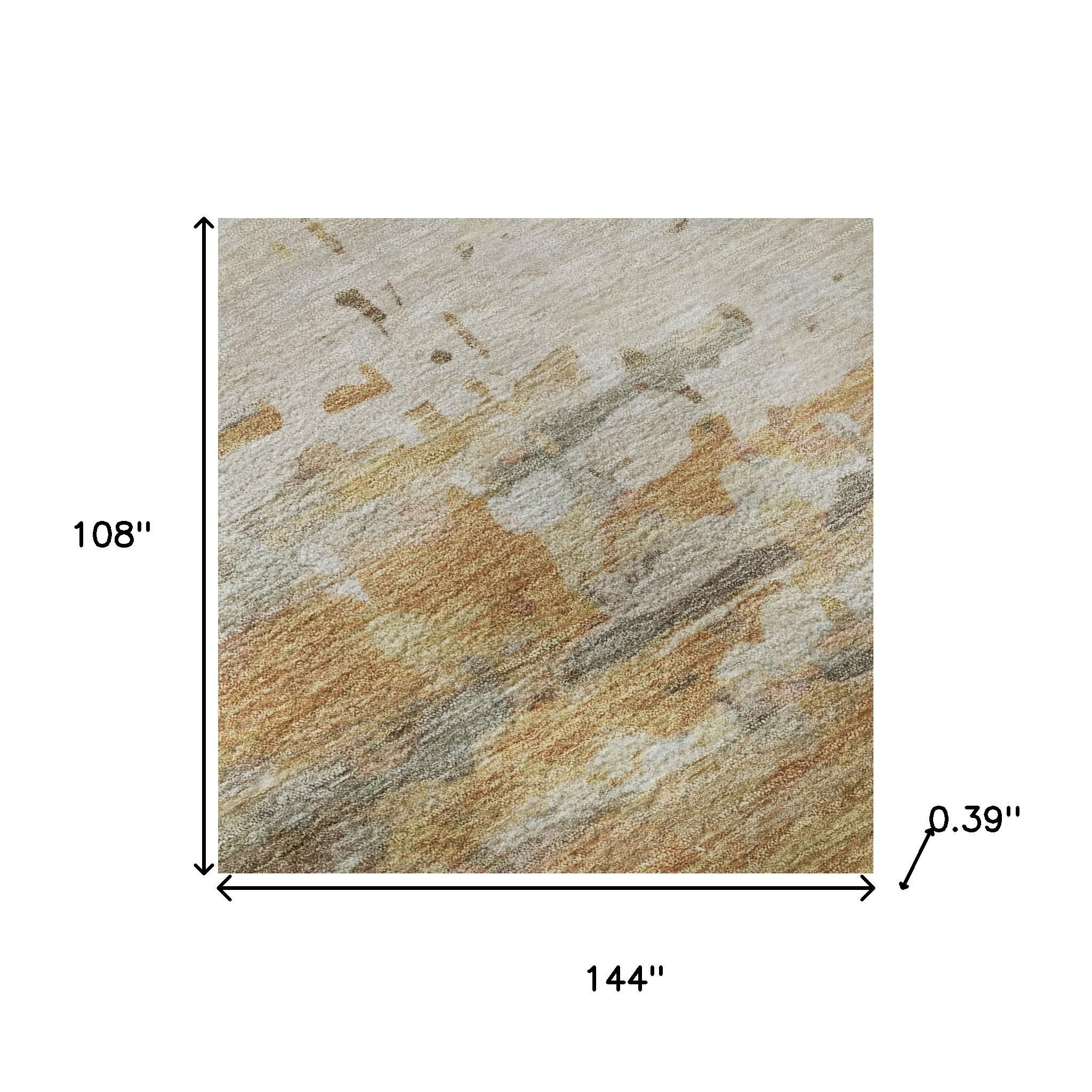 Set an inviting tone in your space with this 9-foot x 12-foot khaki and beige abstract washable area rug with uv protection. Ideal for spaces with kids and pets, this rug is stain resistant to help repel dirt and spilled liquids. Built to last, this rug crafted from polyester fibers is known for its durability and long lasting appeal. Rugs are a great way to showcase your style, hide imperfections, warm your home and reduce noise. This larger sized, transitional styled rug is ready to create a focal point or statement piece in your room. 108.00-inch h x 144.00-inch w x 0.39-inch d.