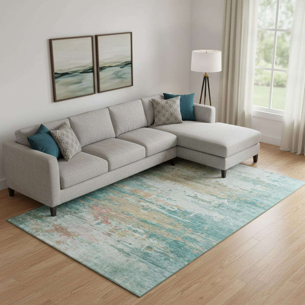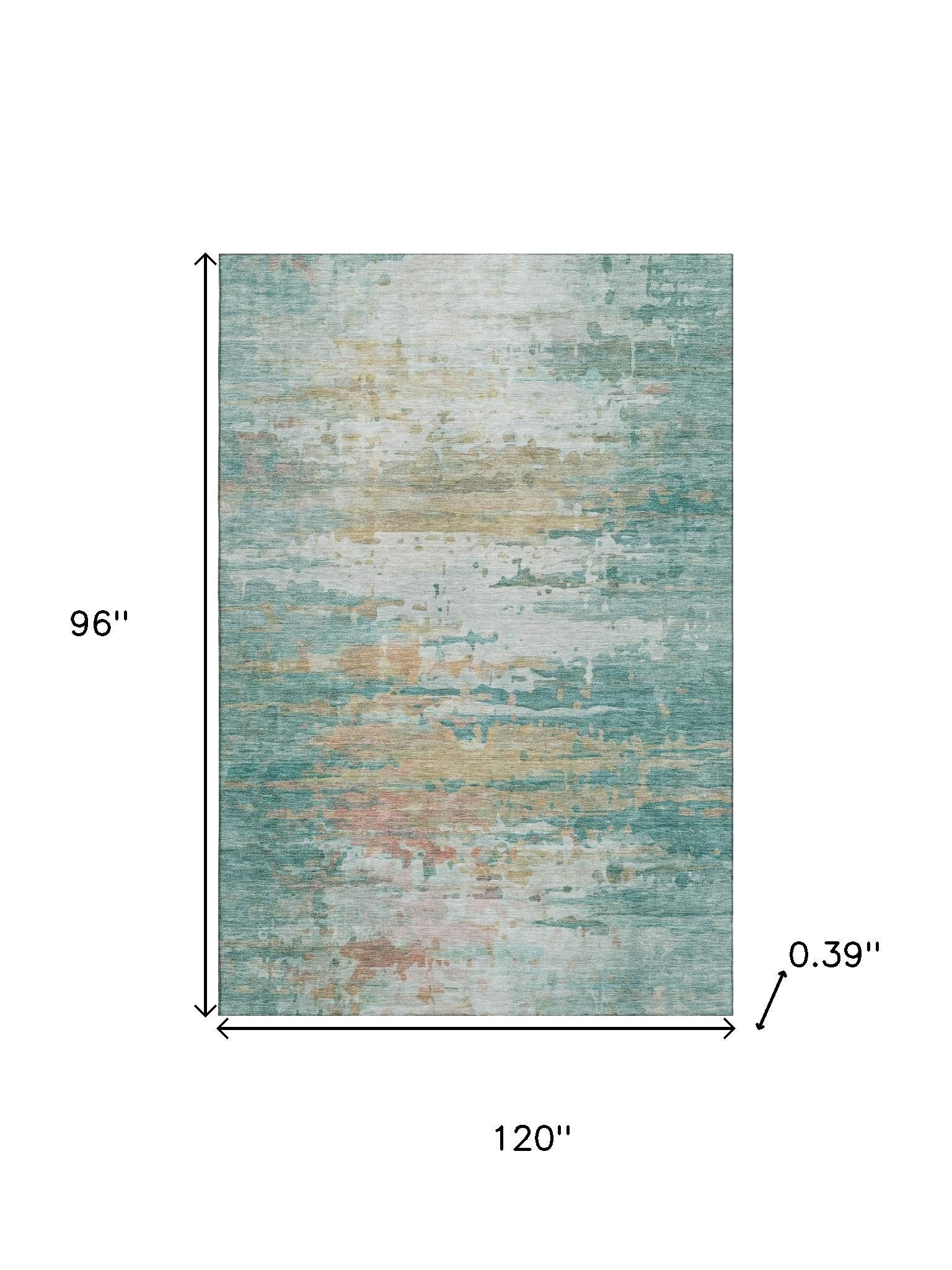 This 8-foot x 10-foot teal and beige abstract washable area rug with uv protection, is a great way to add warmth to a room. Ideal for spaces with kids and pets, this rug is stain resistant to help repel dirt and spilled liquids. Built to last, this rug crafted from polyester fibers is known for its durability and long lasting appeal. Rugs are a great way to showcase your style, hide imperfections, warm your home and reduce noise. This larger sized, transitional styled rug is ready to create a focal point or statement piece in your room. 96.00-inch h x 120.00-inch w x 0.39-inch d.