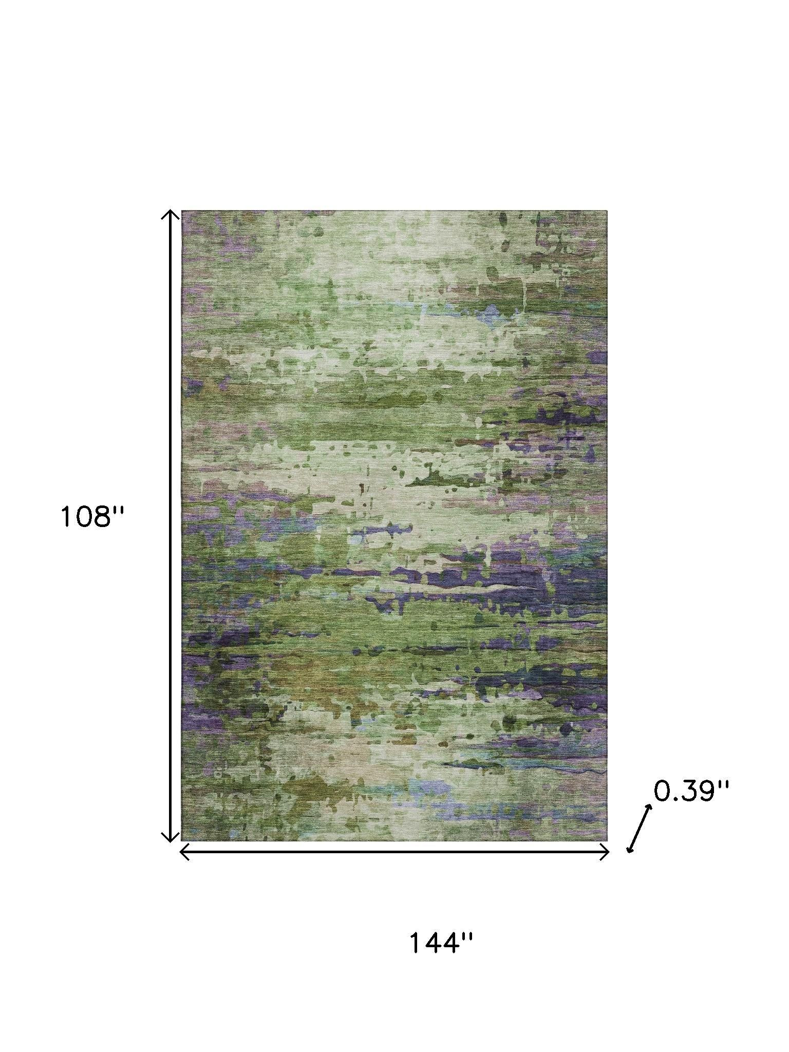 Add some artistry to your room with this 9-foot x 12-foot green and purple abstract washable area rug with uv protection. Ideal for spaces with kids and pets, this rug is stain resistant to help repel dirt and spilled liquids. Built to last, this rug crafted from polyester fibers is known for its durability and long lasting appeal. Rugs are a great way to showcase your style, hide imperfections, warm your home and reduce noise. This larger sized, transitional styled rug is ready to create a focal point or statement piece in your room. 108.00-inch h x 144.00-inch w x 0.39-inch d.