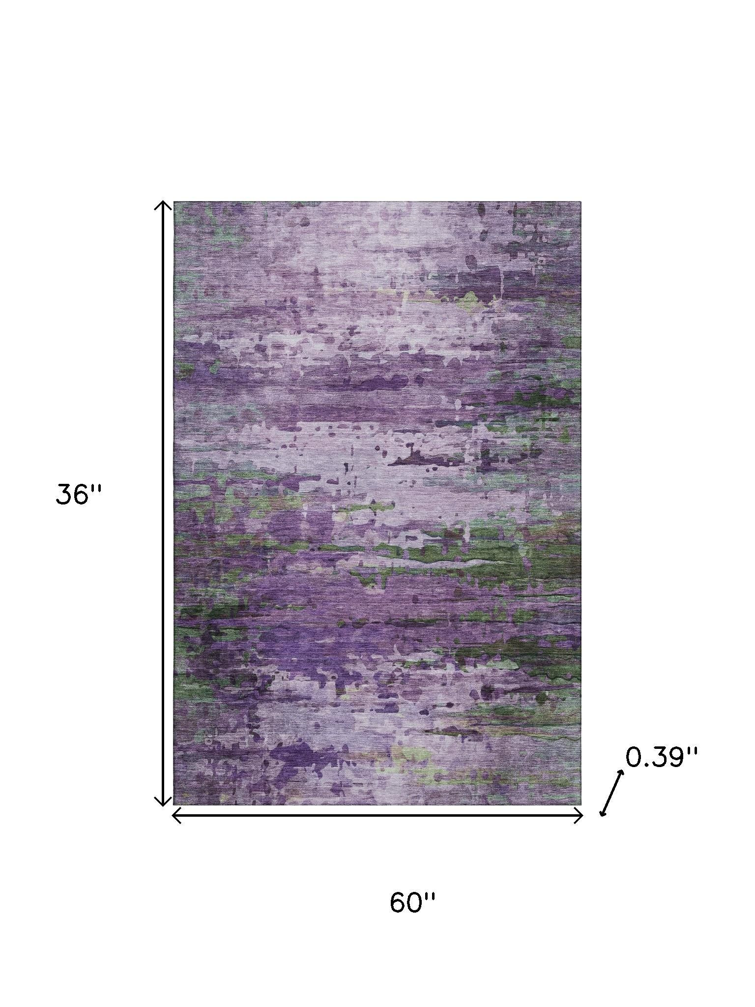 This 3-foot x 5-foot purple and green abstract washable area rug with uv protection, is a great way to add warmth to a room. Ideal for spaces with kids and pets, this rug is stain resistant to help repel dirt and spilled liquids. Built to last, this rug crafted from polyester fibers is known for its durability and long lasting appeal. Rugs are a great way to showcase your style, hide imperfections, warm your home and reduce noise. This smaller sized, transitional styled rug is just what you need for your walkway, bedside, in front of door, cabinet, refrigerator, or chair. 36.00-inch h x 60.00-inch w x 0.39-inch d.