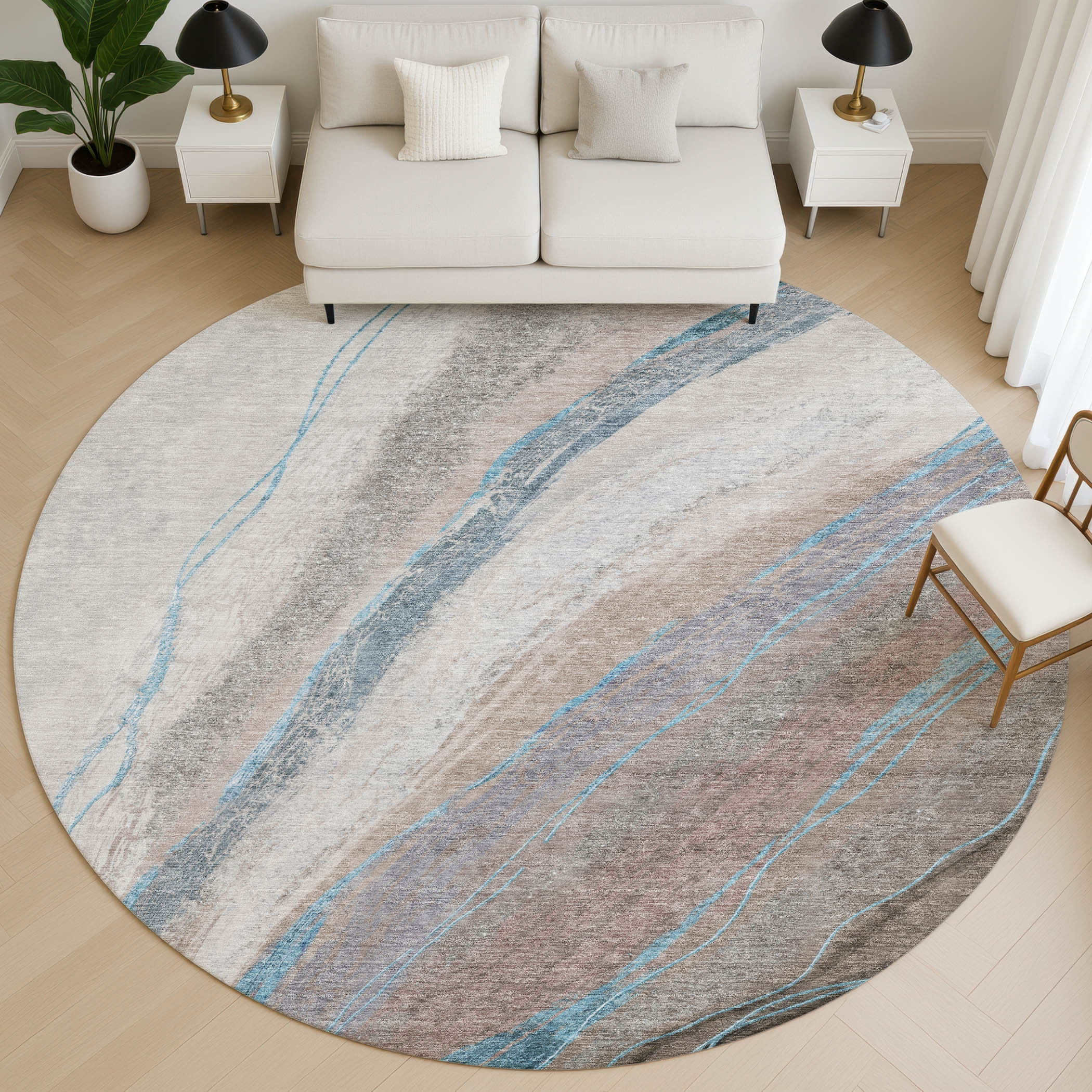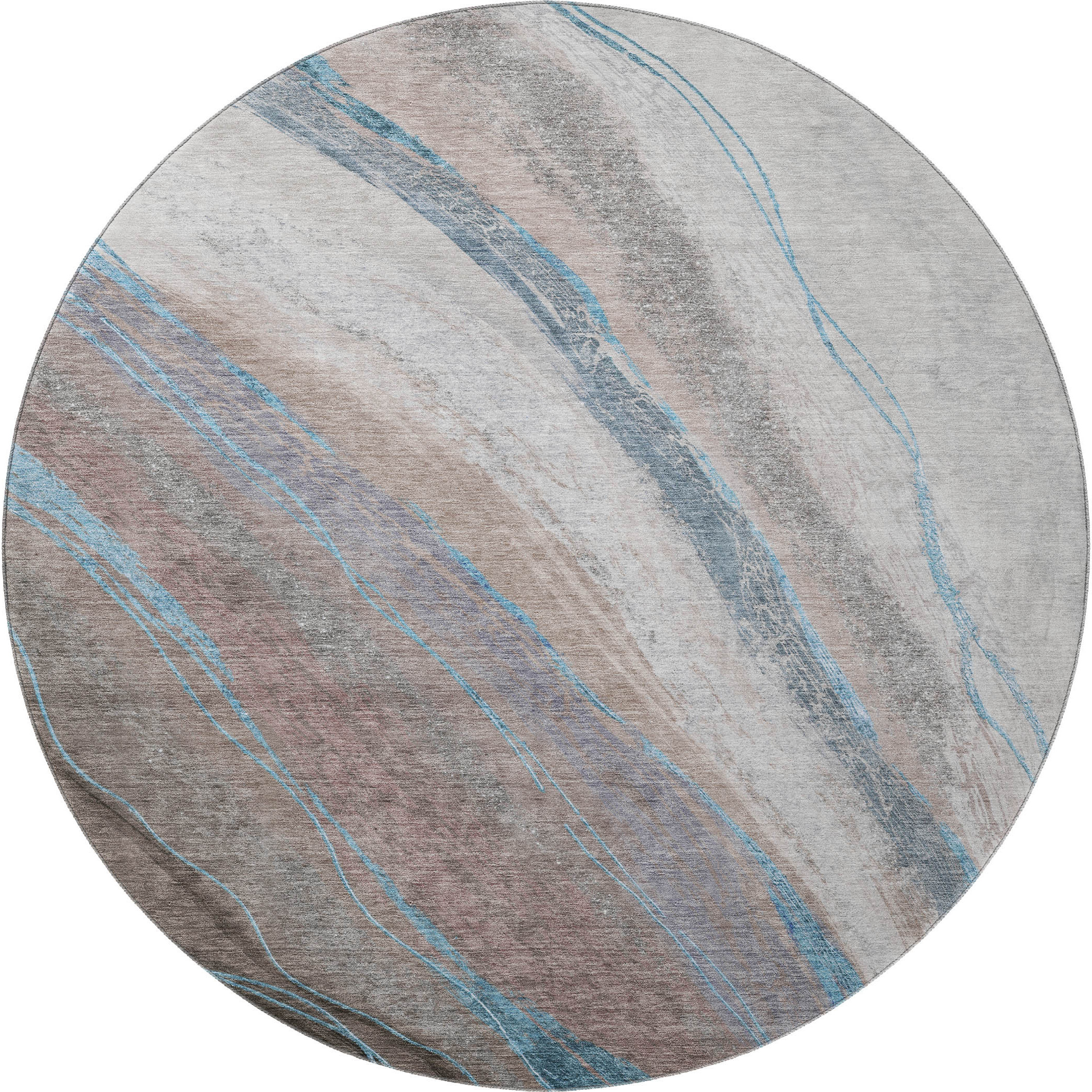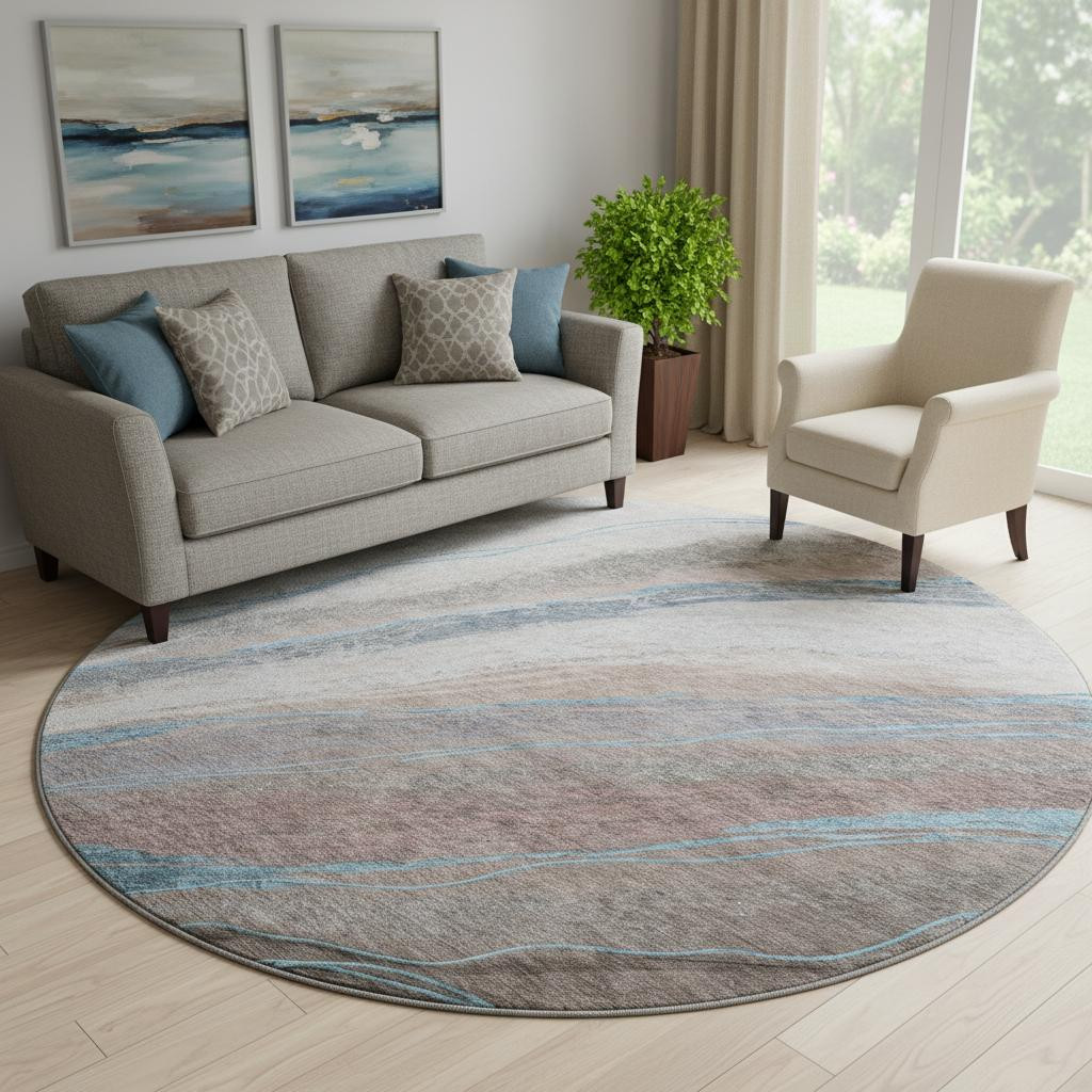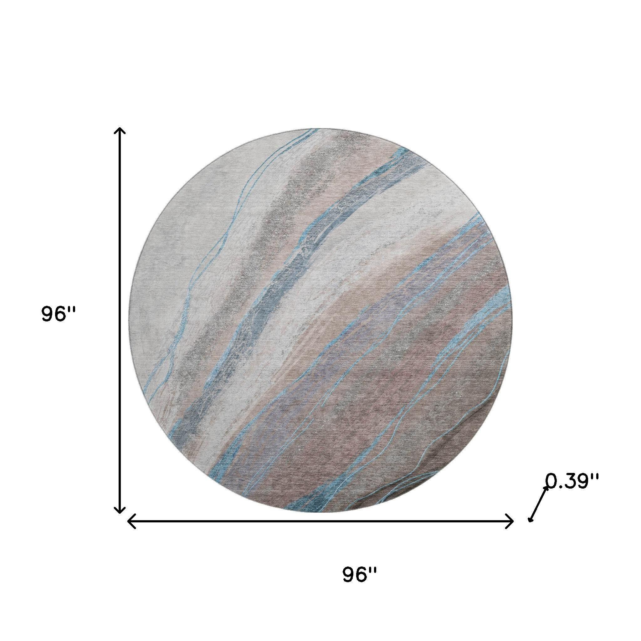 Set an inviting tone in your space with this 8-foot brown and blue abstract washable round rug with uv protection. Ideal for spaces with kids and pets, this rug is stain resistant to help repel dirt and spilled liquids. Built to last, this rug crafted from polyester fibers is known for its durability and long lasting appeal. Rugs are a great way to showcase your style, hide imperfections, warm your home and reduce noise. This larger sized, transitional styled rug is ready to create a focal point or statement piece in your room. 96.00-inch h x 96.00-inch w x 0.39-inch d.
