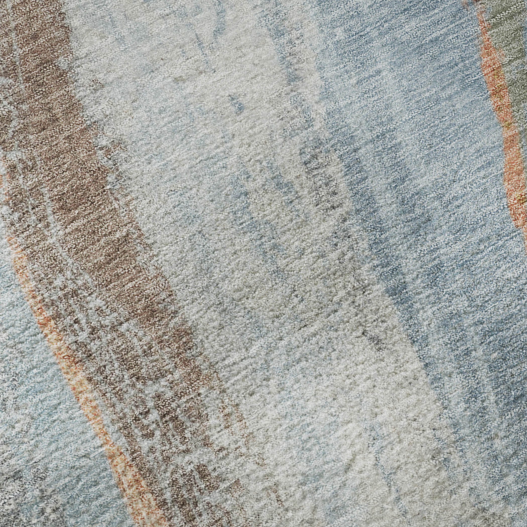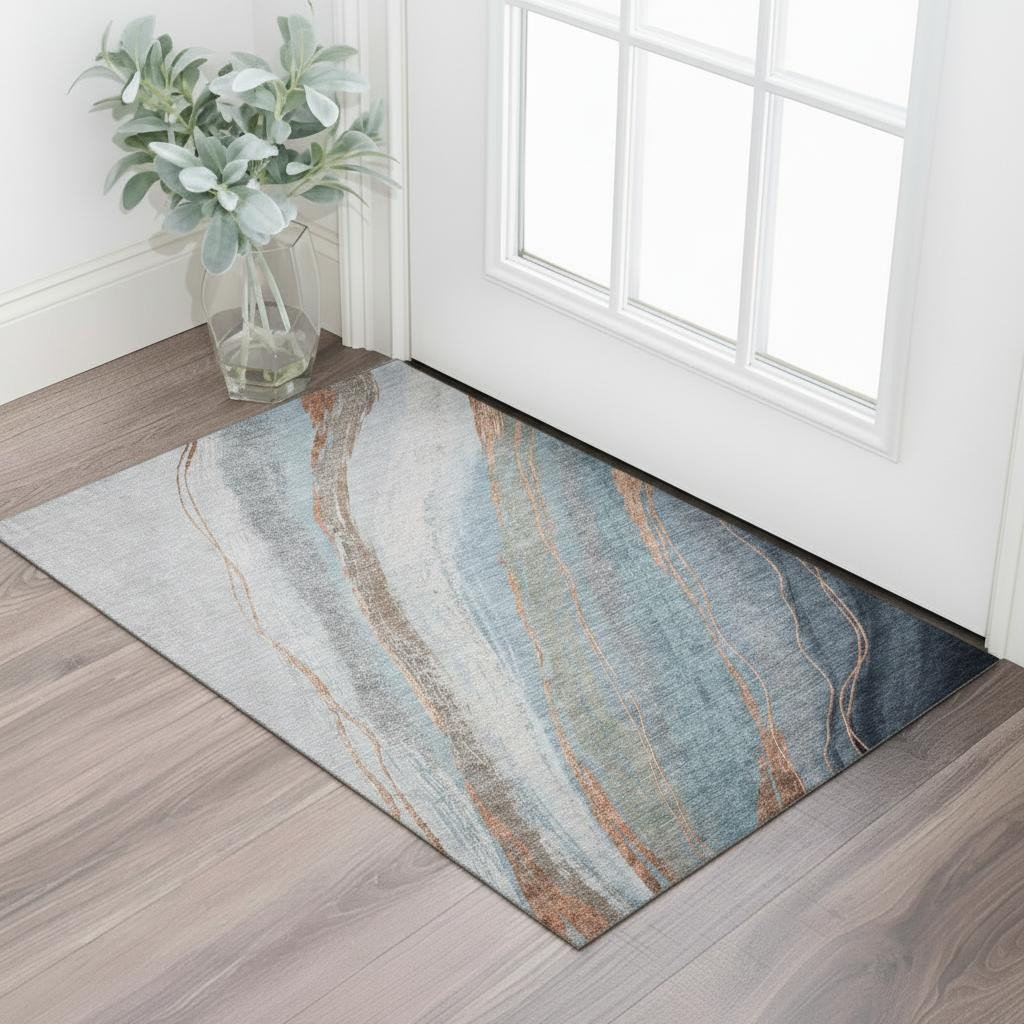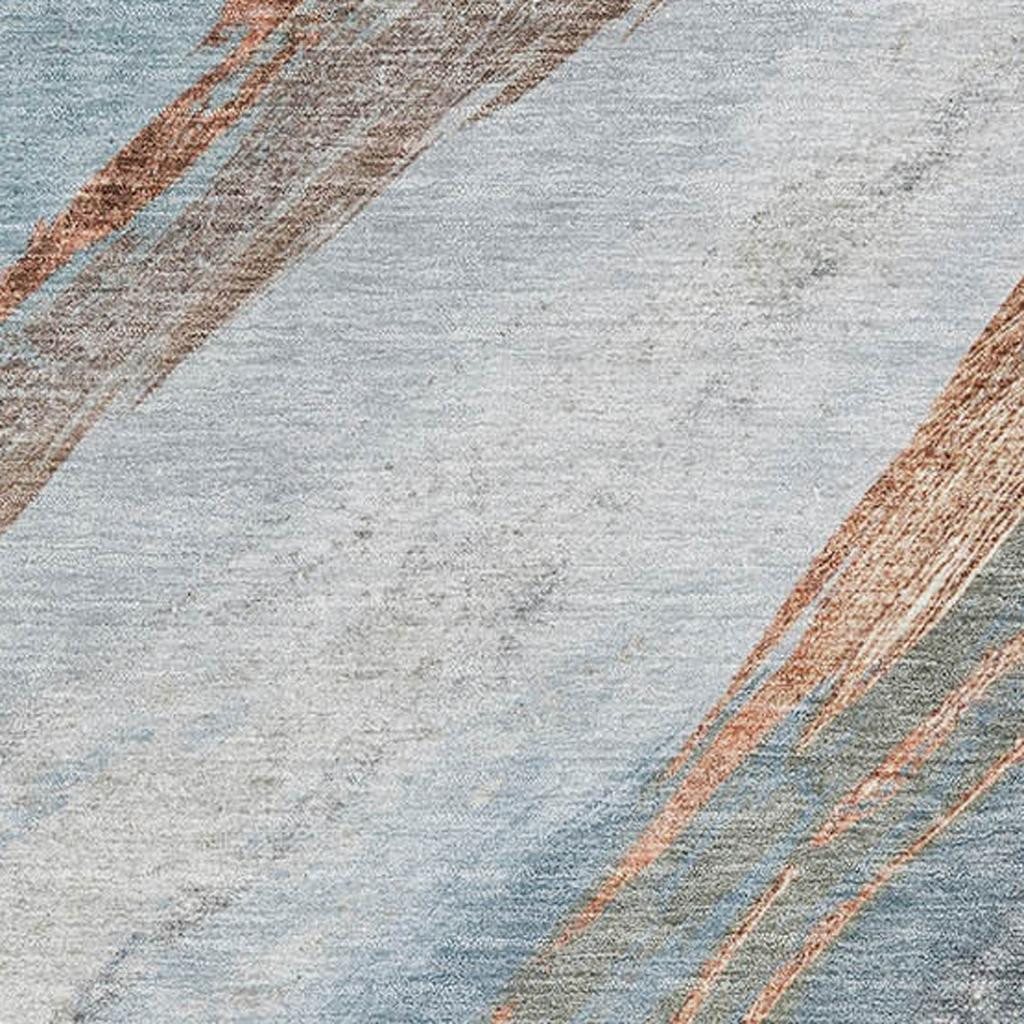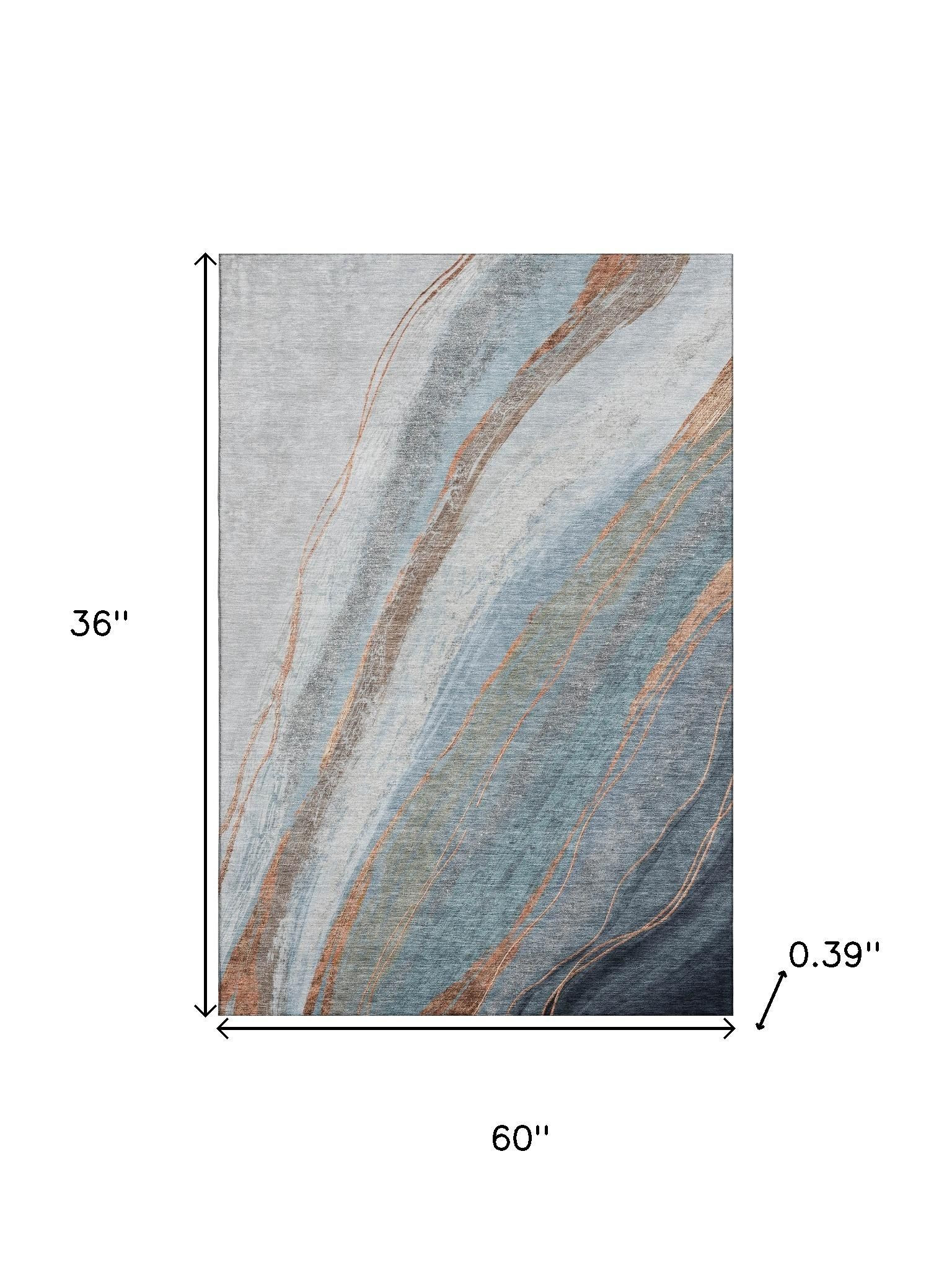 Add great coloration and comfortable texture to your space with this 3-foot x 5-foot blue and copper abstract washable area rug with uv protection. Ideal for spaces with kids and pets, this rug is stain resistant to help repel dirt and spilled liquids. Built to last, this rug crafted from polyester fibers is known for its durability and long lasting appeal. Rugs are a great way to showcase your style, hide imperfections, warm your home and reduce noise. This smaller sized, transitional styled rug is just what you need for your walkway, bedside, in front of door, cabinet, refrigerator, or chair. 36.00-inch h x 60.00-inch w x 0.39-inch d.