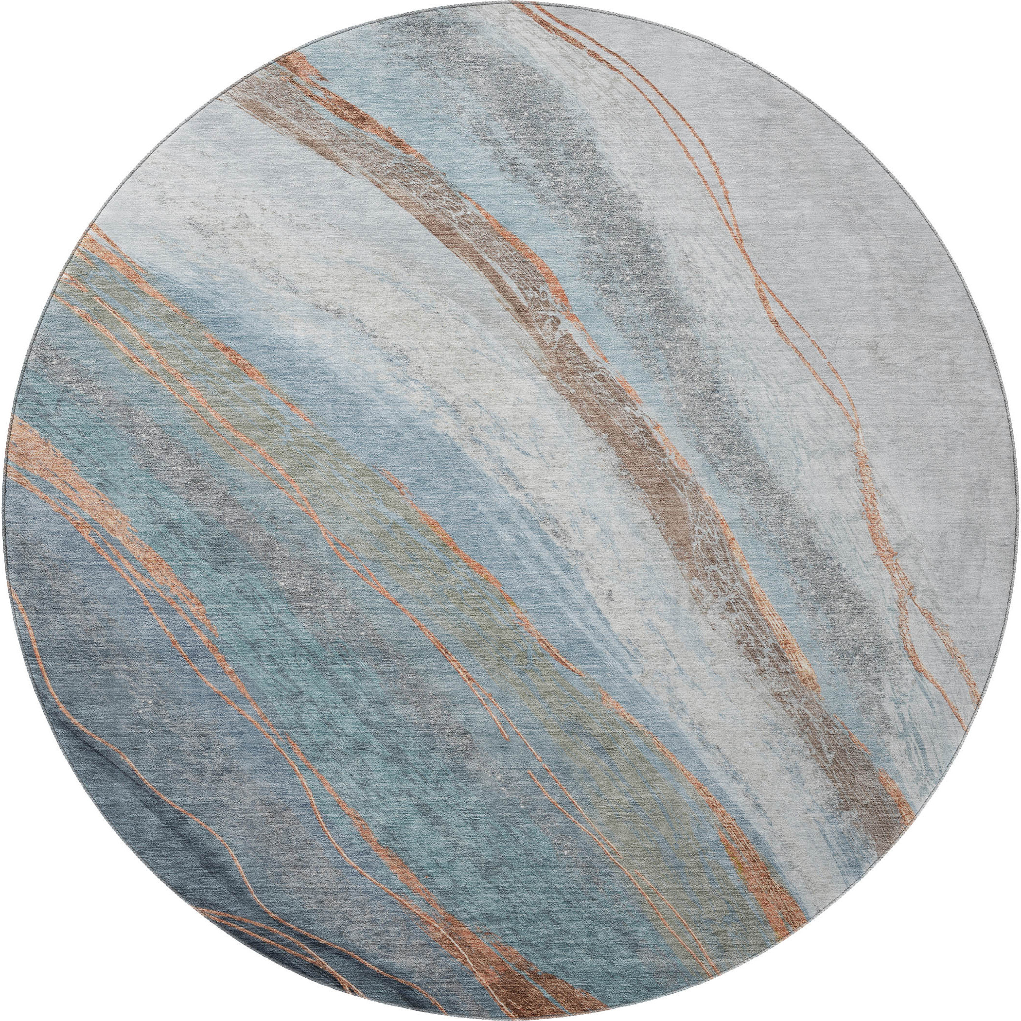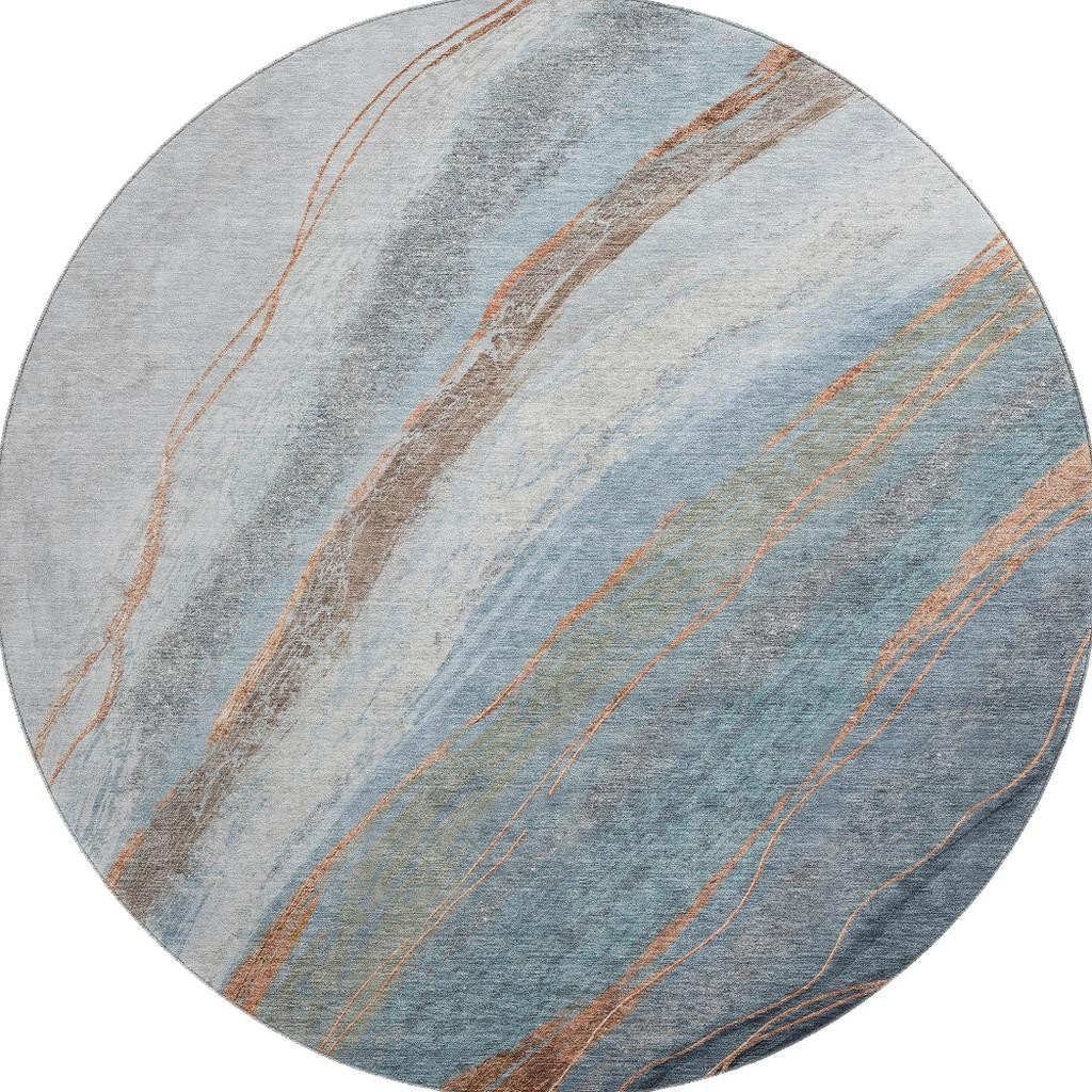 Add great coloration and comfortable texture to your space with this 8-foot blue and copper abstract washable round rug with uv protection. Ideal for spaces with kids and pets, this rug is stain resistant to help repel dirt and spilled liquids. Built to last, this rug crafted from polyester fibers is known for its durability and long lasting appeal. Rugs are a great way to showcase your style, hide imperfections, warm your home and reduce noise. This larger sized, transitional styled rug is ready to create a focal point or statement piece in your room. 96.00-inch h x 96.00-inch w x 0.39-inch d.